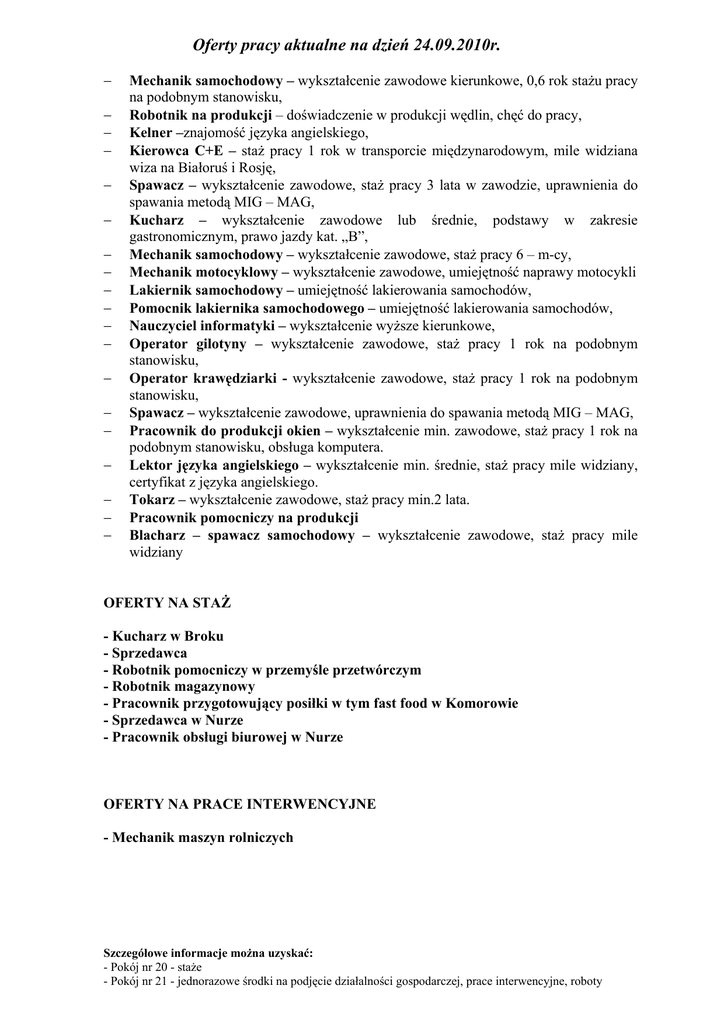 Oferty pracy aktualne na dzień 24.09.2010r. − − − − − − − − − − − − − − − − − − − Mechanik samochodowy – wykształcenie zawodowe kierunkowe, 0,6 rok stażu pracy na podobnym stanowisku, Robotnik na produkcji – doświadczenie w produkcji wędlin, chęć do pracy, Kelner –znajomość języka angielskiego, Kierowca C+E – staż pracy 1 rok w transporcie międzynarodowym, mile widziana wiza na Białoruś i Rosję, Spawacz – wykształcenie zawodowe, staż pracy 3 lata w zawodzie, uprawnienia do spawania metodą MIG – MAG, Kucharz – wykształcenie zawodowe lub średnie, podstawy w zakresie gastronomicznym, prawo jazdy kat. „B”, Mechanik samochodowy – wykształcenie zawodowe, staż pracy 6 – m-cy, Mechanik motocyklowy – wykształcenie zawodowe, umiejętność naprawy motocykli Lakiernik samochodowy – umiejętność lakierowania samochodów, Pomocnik lakiernika samochodowego – umiejętność lakierowania samochodów, Nauczyciel informatyki – wykształcenie wyższe kierunkowe, Operator gilotyny – wykształcenie zawodowe, staż pracy 1 rok na podobnym stanowisku, Operator krawędziarki - wykształcenie zawodowe, staż pracy 1 rok na podobnym stanowisku, Spawacz – wykształcenie zawodowe, uprawnienia do spawania metodą MIG – MAG, Pracownik do produkcji okien – wykształcenie min. zawodowe, staż pracy 1 rok na podobnym stanowisku, obsługa komputera. Lektor języka angielskiego – wykształcenie min. średnie, staż pracy mile widziany, certyfikat z języka angielskiego. Tokarz – wykształcenie zawodowe, staż pracy min.2 lata. Pracownik pomocniczy na produkcji Blacharz – spawacz samochodowy – wykształcenie zawodowe, staż pracy mile widziany OFERTY NA STAŻ - Kucharz w Broku - Sprzedawca - Robotnik pomocniczy w przemyśle przetwórczym - Robotnik magazynowy - Pracownik przygotowujący posiłki w tym fast food w Komorowie - Sprzedawca w Nurze - Pracownik obsługi biurowej w Nurze OFERTY NA PRACE INTERWENCYJNE - Mechanik maszyn rolniczych Szczegółowe informacje można uzyskać: - Pokój nr 20 - staże - Pokój nr 21 - jednorazowe środki na podjęcie działalności gospodarczej, prace interwencyjne, roboty publiczne, wyposażenie lub doposażenie stanowiska pracy - Pokój nr 5 - szkolenia - Sala operacyjna - stanowisko nr 2 - oferty pracy Telefonicznie 29-74-521-51, 29-74-521-52, 29-74-533-93 Powiatowy Urząd Pracy w Ostrowi Mazowieckiej ul. 3-go Maja 55 07-300 Ostrów Mazowiecka
