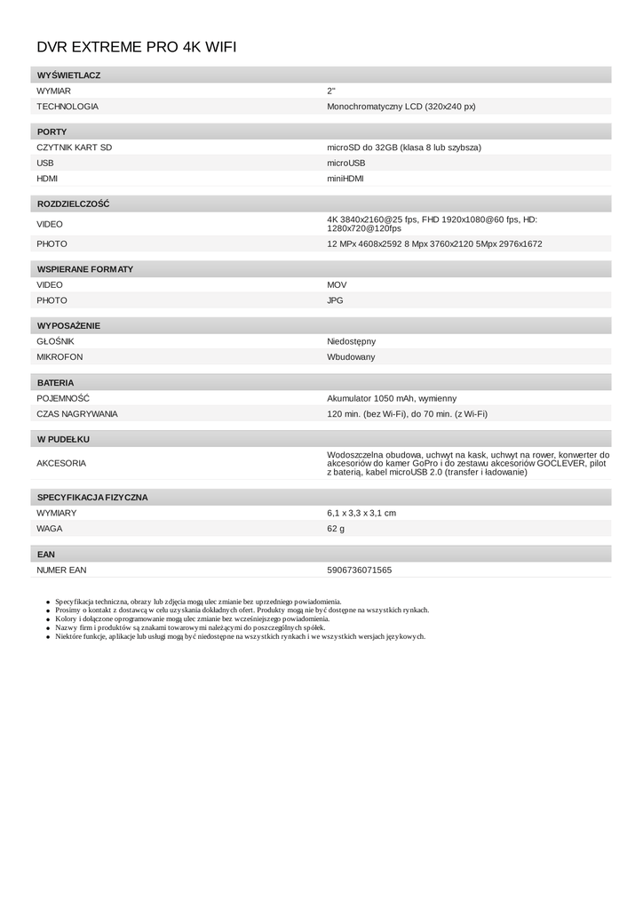DVR EXTREME PRO 4K WIFI WYŚWIETLACZ WYMIAR 2" TECHNOLOGIA Monochromatyczny LCD (320x240 px) PORTY CZYTNIK KART SD microSD do 32GB (klasa 8 lub szybsza) USB microUSB HDMI miniHDMI ROZDZIELCZOŚĆ VIDEO 4K 3840x2160@25 fps, FHD 1920x1080@60 fps, HD: 1280x720@120fps PHOTO 12 MPx 4608x2592 8 Mpx 3760x2120 5Mpx 2976x1672 WSPIERANE FORM ATY VIDEO MOV PHOTO JPG WYPOSAŻENIE GŁOŚNIK Niedostępny MIKROFON Wbudowany BATERIA POJEMNOŚĆ Akumulator 1050 mAh, wymienny CZAS NAGRYWANIA 120 min. (bez Wi-Fi), do 70 min. (z Wi-Fi) W PUDEŁKU AKCESORIA Wodoszczelna obudowa, uchwyt na kask, uchwyt na rower, konwerter do akcesoriów do kamer GoPro i do zestawu akcesoriów GOCLEVER, pilot z baterią, kabel microUSB 2.0 (transfer i ładowanie) SPECYFIKACJA FIZYCZNA WYMIARY 6,1 x 3,3 x 3,1 cm WAGA 62 g EAN NUMER EAN 5906736071565 Specyfikacja techniczna, obrazy lub zdjęcia mogą ulec zmianie bez uprzedniego powiadomienia. Prosimy o kontakt z dostawcą w celu uzyskania dokładnych ofert. Produkty mogą nie być dostępne na wszystkich rynkach. Kolory i dołączone oprogramowanie mogą ulec zmianie bez wcześniejszego powiadomienia. Nazwy firm i produktów są znakami towarowymi należącymi do poszczególnych spółek. Niektóre funkcje, aplikacje lub usługi mogą być niedostępne na wszystkich rynkach i we wszystkich wersjach językowych.