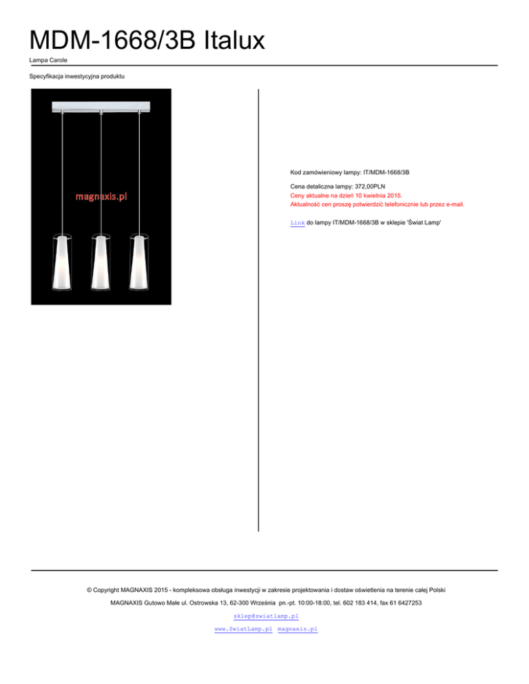 MDM-1668/3B Italux Lampa Carole Specyfikacja inwestycyjna produktu Kod zamówieniowy lampy: IT/MDM-1668/3B Cena detaliczna lampy: 372,00PLN Ceny aktualne na dzień 10 kwietnia 2015. Aktualność cen proszę potwierdzić telefonicznie lub przez e-mail. Link do lampy IT/MDM-1668/3B w sklepie 'Świat Lamp' © Copyright MAGNAXIS 2015 - kompleksowa obsługa inwestycji w zakresie projektowania i dostaw oświetlenia na terenie całej Polski MAGNAXIS Gutowo Małe ul. Ostrowska 13, 62-300 Września pn.-pt. 10:00-18:00, tel. 602 183 414, fax 61 6427253 [email protected] www.SwiatLamp.pl magnaxis.pl