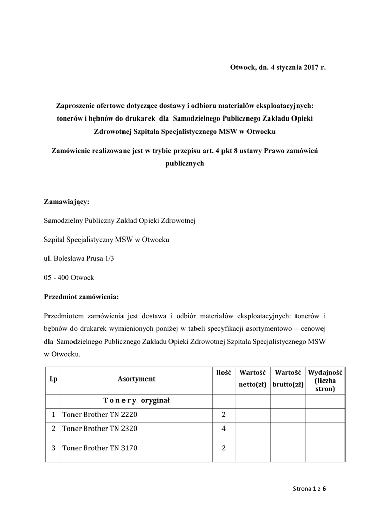 Otwock, dn. 4 stycznia 2017 r. Zaproszenie ofertowe dotyczące dostawy i odbioru materiałów eksploatacyjnych: tonerów i bębnów do drukarek dla Samodzielnego Publicznego Zakładu Opieki Zdrowotnej Szpitala Specjalistycznego MSW w Otwocku Zamówienie realizowane jest w trybie przepisu art. 4 pkt 8 ustawy Prawo zamówień publicznych Zamawiający: Samodzielny Publiczny Zakład Opieki Zdrowotnej Szpital Specjalistyczny MSW w Otwocku ul. Bolesława Prusa 1/3 05 - 400 Otwock Przedmiot zamówienia: Przedmiotem zamówienia jest dostawa i odbiór materiałów eksploatacyjnych: tonerów i bębnów do drukarek wymienionych poniżej w tabeli specyfikacji asortymentowo – cenowej dla Samodzielnego Publicznego Zakładu Opieki Zdrowotnej Szpitala Specjalistycznego MSW w Otwocku. Lp Asortyment Ilość Wartość Wartość Wydajność (liczba netto(zł) brutto(zł) stron) T o n e r y oryginał 1 Toner Brother TN 2220 2 2 Toner Brother TN 2320 4 3 Toner Brother TN 3170 2 Strona 1 z 6 4 Toner Brother TN 325BK czarny 4 5 Toner Brother TN 325C niebieski 2 6 Toner Brother TN 325Y żółty 2 7 Toner Brother TN 325M purpurowy 2 8 Toner Brother TN 3280 2 9 Toner Brother TN 3380 5 10 Toner Lexmark E260A21A 2 11 Toner Xerox wc 5222 2 12 HP CE 255A 2 Razem 31 T o n e r y zamienniki 1 Toner Brother TN 2220 2 2 Toner Brother TN 2320 4 3 Toner Brother TN 3170 2 4 Toner Brother TN 325BK czarny 4 5 Toner Brother TN 325C niebieski 2 6 Toner Brother TN 325Y żółty 2 7 Toner Brother TN 325M purpurowy 2 8 Toner Brother TN 3280 2 9 Toner Brother TN 3380 5 10 Toner Lexmark E260A21A 2 11 Toner Xerox wc 5222 2 12 HP CE 255A 2 Razem 1 Bęben Brother DR 2200 31 2 Strona 2 z 6 2 Bęben Brother DR 2300 2 3 Bęben Brother DR 3100 2 5 Bęben Brother DR 3200 2 6 Bęben Brother DR 3300 5 7 Bęben Lexmark E260X22G 4 Razem 17 B Ę B NY oryginały 1 Bęben Brother DR 320CL 2 2 Bęben Brother DR 3300 2 3 Bęben Xerox WC 5222_Kohaku 2 Razem 6 Zaproponowana cena asortymentu powinna uwzględniać: obowiązujący podatek VAT, koszty transportu do siedziby Zamawiającego oraz odbioru z siedziby Zamawiającego. Cena podana przez Wykonawcę jest obowiązująca przez cały okres obowiązywania umowy. Warunki realizacji zamówienia: 1) Dostarczany asortyment będzie fabrycznie nowy, nieużywany, w oryginalnym opakowaniu producenta. 2) Wykonawca dostarczy przedmiot zamówienia w odpowiednim opakowaniu zabezpieczającym przed zniszczeniem lub uszkodzeniem, własnym transportem, na swój koszt i ryzyko do siedziby Zamawiającego. 3) Dostawy będą odbywały się sukcesywnie, zgodnie z zapotrzebowaniem Zamawiającego w ciągu 2 dni roboczych od złożenia zamówienia przez Zamawiającego. Strona 3 z 6 4) Wykonawca zobowiązany jest do usunięcia wykrytych w okresie gwarancji wad i usterek w ciągu 5 dni roboczych od daty otrzymania pisemnego (lub e-mailowego) zgłoszenia. 5) Wykonawca będzie zobowiązany co najmniej 1 raz w miesiącu do odbioru zużytych bębnów i tonerów do sprzętu biurowego wykorzystywanego przez Zamawiającego w jego siedzibie i transportu do miejsca ich przetworzenia. 6) W przypadku zaoferowania przez Wykonawcę zamienników, wydajność ich powinna być nie mniejsza niż produktów oryginalnych, pochodzących od producenta urządzenia mierzona zgodnie z normami: ISO/IEC/19752 w przypadku tonerów do drukarek monochromatycznych; ISO/IEC/19798 w przypadku tonerów do drukarek kolorowych. 7) W przypadku zaoferowania równoważonych materiałów eksploatacyjnych (zamienników) na potwierdzenie wydajności Wykonawca zobowiązany jest załączyć do oferty raporty z testów przeprowadzonych przez producenta wykonanych zgodnie z normami ISO/IEC/19752 w przypadku tonerów do drukarek monochromatycznych, ISO/IEC/19798 w przypadku towarów do drukarek kolorowych. 8) W przypadku stwierdzenia, że toner wysypuje się z pojemnika Wykonawca dokona czyszczenia wskazanej drukarki na własny koszt w terminie jednego dnia od momentu zgłoszenia. Termin realizacji zamówienia: Termin realizacji zamówienia: 12 miesięcy od daty zawarcia umowy. Wymagania wobec Wykonawcy: Posiadanie doświadczenia w zakresie dostawy materiałów eksploatacyjnych: tonerów i bębnów do drukarek: Oferent przedłoży oświadczenie, z którego treści wynikać będzie, że oferent posiada minimum roczne doświadczenie w zakresie dostawy materiałów eksploatacyjnych: tonerów i bębnów do drukarek. Oferta: Oferta powinna być sporządzona w języku polskim i umieszczona w zamkniętej kopercie z nadrukiem „Oferta dotyczące dostawy materiałów eksploatacyjnych: tonerów i bębnów do Strona 4 z 6 drukarek dla Samodzielnego Publicznego Zakładu Opieki Zdrowotnej Szpitala Specjalistycznego MSW w Otwocku”. Oferta powinna zawierać: a) imię, nazwisko i adres lub nazwę (firmę) i siedzibę oferenta, b) uzupełnioną tabelę specyfikacji asortymentowo - cenowej, c) wynagrodzenie za realizację zamówienia, w wysokości netto, brutto oraz stawkę podatku VAT. Ponadto do oferty należy dołączyć: a) oświadczenie, z którego treści wynikać będzie, że oferent posiada minimum roczne doświadczenie w zakresie dostawy materiałów eksploatacyjnych: tonerów i bębnów do drukarek, b) wypis z właściwego rejestru. Wszystkie dokumenty załączone w ofercie muszą być w języku polskim lub w oryginale z załączonym tłumaczeniem na język polski. Miejsce i termin składania ofert: Oferty należy składać bezpośrednio w Samodzielnym Publicznym Zakładzie Opieki Zdrowotnej Szpitalu Specjalistycznym MSW w Otwocku, przy ul. Bolesława Prusa 1/3 (sekretariat) lub na adres: Samodzielny Publiczny Zakład Opieki Zdrowotnej Szpital Specjalistyczny MSW w Otwocku ul. Bolesława Prusa 1/3 05 - 400 Otwock Oferta winna być złożona w zamkniętej kopercie z dopiskiem: „Oferta dotycząca dostawy materiałów eksploatacyjnych: tonerów i bębnów do drukarek dla Samodzielnego Publicznego Zakładu Opieki Zdrowotnej Szpitala Specjalistycznego MSW w Otwocku”. Termin skł