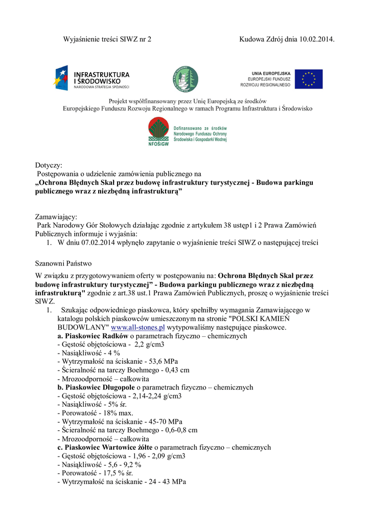 Wyjaśnienie treści SIWZ nr 2 Kudowa Zdrój dnia 10.02.2014. Dotyczy: Postępowania o udzielenie zamówienia publicznego na „Ochrona Błędnych Skał przez budowę infrastruktury turystycznej - Budowa parkingu publicznego wraz z niezbędną infrastrukturą” Zamawiający: Park Narodowy Gór Stołowych działając zgodnie z artykułem 38 ustęp1 i 2 Prawa Zamówień Publicznych informuje i wyjaśnia: 1. W dniu 07.02.2014 wpłynęło zapytanie o wyjaśnienie treści SIWZ o następującej treści Szanowni Państwo W związku z przygotowywaniem oferty w postępowaniu na: Ochrona Błędnych Skał przez budowę infrastruktury turystycznej” - Budowa parkingu publicznego wraz z niezbędną infrastrukturą" zgodnie z art.38 ust.1 Prawa Zamówień Publicznych, proszę o wyjaśnienie treści SIWZ. 1. Szukając odpowiedniego piaskowca, który spełniłby wymagania Zamawiającego w katalogu polskich piaskowców umieszczonym na stronie "POLSKI KAMIEŃ BUDOWLANY" www.all-stones.pl wytypowaliśmy następujące piaskowce. a. Piaskowiec Radków o parametrach fizyczno – chemicznych - Gęstość objętościowa - 2,2 g/cm3 - Nasiąkliwość - 4 % - Wytrzymałość na ściskanie - 53,6 MPa - Ścieralność na tarczy Boehmego - 0,43 cm - Mrozoodporność – całkowita b. Piaskowiec Długopole o parametrach fizyczno – chemicznych - Gęstość objętościowa - 2,14-2,24 g/cm3 - Nasiąkliwość - 5% śr. - Porowatość - 18% max. - Wytrzymałość na ściskanie - 45-70 MPa - Ścieralność na tarczy Boehmego - 0,6-0,8 cm - Mrozoodporność – całkowita c. Piaskowiec Wartowice Ŝółte o parametrach fizyczno – chemicznych - Gęstość objętościowa - 1,96 - 2,09 g/cm3 - Nasiąkliwość - 5,6 - 9,2 % - Porowatość - 17,5 % śr. - Wytrzymałość na ściskanie - 24 - 43 MPa - Ścieralność na tarczy Boehmego - 0,59 - 1,50cm - Mrozoodporność – całkowita Jednak przy opisie cech uŜytkowych wyŜej wymienionych piaskowców tylko Piaskowiec Radków moŜe być stosowany jako okładzina zewnętrzna pozioma bez ograniczeń, równieŜ jako materiał konstrukcyjny. Natomiast przy piaskowcu Długopole i Wartowice nie zaleca się stosować okładzin zewnętrznych poziomych w miejscach naraŜonych na intensywny ruch. Moje pytanie brzmi. Proszę określić czy ruch na planowanej drodze i parkingach naleŜy uznać za intensywny i zaplanować uŜycie tylko piaskowca Radków, czy teŜ intensywność ruchu nie będzie taka duŜa i moŜliwe będzie teŜ uŜycie pozostałych piaskowców? 2. Zamawiający udziela następującego wyjaśnienia: Parking górny na Błędnych Skałach czynny jest w okresie sezonu turystycznego tj od pierwszego weekendu majowego do 30 października kaŜdego roku. W tym czasie średnio korzysta z parkingu 1500 autobusów i 12 000 samochodów osobowych. Równocześnie dobór piaskowca Zamawiający pozostawia wykonawcy, tak aby jego kolorystyka nie odbiegał od miejsca gdzie będzie zamontowany i aby miał jak najmniejszą nasiąkliwość Kierownik Zamawiającego mgr inŜ. Janusz Korybo