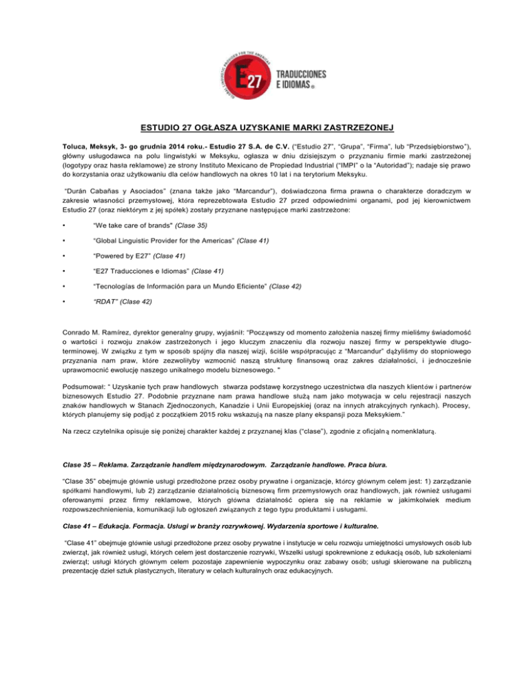 ESTUDIO 27 OGŁASZA UZYSKANIE MARKI ZASTRZEŹONEJ Toluca, Meksyk, 3- go grudnia 2014 roku.- Estudio 27 S.A. de C.V. (“Estudio 27”, “Grupa”, “Firma”, lub “Przedsiębiorstwo”), główny usługodawca na polu lingwistyki w Meksyku, ogłasza w dniu dzisiejszym o przyznaniu firmie marki zastrzeżonej (logotypy oraz hasła reklamowe) ze strony Instituto Mexicano de Propiedad Industrial (“IMPI” o la “Autoridad”); nadaje się prawo do korzystania oraz użytkowaniu dla celów handlowych na okres 10 lat i na terytorium Meksyku. “Durán Cabañas y Asociados” (znana także jako “Marcandur”), doświadczona firma prawna o charakterze doradczym w zakresie własności przemysłowej, która reprezebtowała Estudio 27 przed odpowiednimi organami, pod jej kierownictwem Estudio 27 (oraz niektórym z jej spółek) zostały przyznane następujące marki zastrzeżone: • “We take care of brands" (Clase 35) • “Global Linguistic Provider for the Americas” (Clase 41) • “Powered by E27” (Clase 41) • “E27 Traducciones e Idiomas” (Clase 41) • “Tecnologías de Información para un Mundo Eficiente” (Clase 42) • “RDAT” (Clase 42) Conrado M. Ramírez, dyrektor generalny grupy, wyjaśnił: “Począwszy od momento założenia naszej firmy mieliśmy świadomość o wartości i rozwoju znaków zastrzeżonych i jego kluczym znaczeniu dla rozwoju naszej firmy w perspektywie długoterminowej. W związku z tym w sposób spójny dla naszej wizji, ściśle współpracując z “Marcandur” dążyliśmy do stopniowego przyznania nam praw, które zezwoliłyby wzmocnić naszą strukturę finansową oraz zakres działalności, i je dnocześnie uprawomocnić ewolucję naszego unikalnego modelu biznesowego. " Podsumował: “ Uzyskanie tych praw handlowych stwarza podstawę korzystnego uczestnictwa dla naszych klient ów i partnerów biznesowych Estudio 27. Podobnie przyznane nam prawa handlowe służą nam jako motywacja w celu rejestracji naszych znaków handlowych w Stanach Zjednoczonych, Kanadzie i Unii Europejskiej (oraz na innych atrakcyjnych rynkach). Procesy, których planujemy się podjąć z początkiem 2015 roku wskazują na nasze plany ekspansji poza Meksykiem.” Na rzecz czytelnika opisuje się poniżej charakter każdej z przyznanej klas (“clase”), zgodnie z oficjaln ą nomenklaturą. Clase 35 – Reklama. Zarządzanie handlem międzynarodowym. Zarządzanie handlowe. Praca biura. “Clase 35” obejmuje głównie usługi przedłożone przez osoby prywatne i organizacje, którcy głównym celem jest: 1) zarządzanie spółkami handlowymi, lub 2) zarządzanie działalnością biznesową firm przemysłowych oraz handlowych, jak również usługami oferowanymi przez firmy reklamowe, których główna działalność opiera się na reklamie w jakimkolwiek medium rozpowszechnienienia, komunikacji lub ogłoszeń związanych z tego typu produktami i usługami. Clase 41 – Edukacja. Formacja. Usługi w branży rozrywkowej. Wydarzenia sportowe i kulturalne. “Clase 41” obejmuje głównie usługi przedłożone przez osoby prywatne i instytucje w celu rozwoju umiejętności umysłowych osób lub zwierząt, jak również usługi, których celem jest dostarczenie rozrywki, Wszelki usługi spokrewnione z edukacją osób, lub szkoleniami zwierząt; usługi których głównym celem pozostaje zapewnienie wypoczynku oraz zabawy osób; usługi skierowane na publiczną prezentację dzieł sztuk plastycznych, literatury w celach kulturalnych oraz edukacyjnych. Clase 42 – Usługi naukowe i technologiczne, jak również usługi badawcze i projektowe w obu środowiskach. Usługi analistyczne i badań przemysłowych. Projektowanie i rozwój sprzętu informatycznego i oprogramowania. “Clase 42” obejmuje głównie usługi zaoferowane przez osoby na rzecz tytułów indywidualnych, lub kolektywnych, spokrewnione z aspektami teoretycznymi oraz praktycznymi w sektorach o wysokim stopniu złożoności; wspomniane us ługi świadczone są przez profesionalistów takich jak chemików, fizyków, inżynierów, programatorów itp. NA TEMAT ESTUDIO 27 Początki Estudio 27 sięgają 2010 roku. Estudio 27 postrzega się jako lider w zakresie efektywnych rozwiązań komunikacyjnych oraz usług językowych dla osób prywatnych, firm, instytucji rządowych; powyższe uwzględniając najwyższą jakość i światowy zasięg. Z biurami i centrum operacji w mieście Toluca, stan Meksyk, Estudio 27 oferuje szeroką gamę usług dla różnorodnych klientów tak w Meksyku, jak i za granicą. Dzięki wyjątkowej metodologii, przy użyciu wiodących technologii informacyjnych i tłumaczeniowych i dążąc do zapewnienia pełnej satysfakcji klienta Estudio 27 oferuje następujące usługi: tłumaczenie zwykłe i uwierzytelnione, interpretacje (ciągłe i towarzyszące) i inne związane z zagadniniami komunikacyjnymi, językowymi oraz eventów specjalistycznych. W celu uzyskania dalszych informacji na temat Estudio 27 jego możliwości i zasobów, odwiedź stronę: www.estudio27.com.mx UWAGI DO CZYTELNIKA Estudio 27 może nawiązywać do przyszłych działań oraz projektów; nawiązania te stanowią wyłącznie przewidywania dotyczące przyszłych projektów. Z powyższego względu rozwój działań czy projektów może w Śodbiegać opy Estudio 27d pierwotnych założeń, jako że nasze pierwotne założenia nie zawierają elementu r yzyka, w tym sytuacji ekonomicznej i wahań kursu walut (peso meksykańskie, dólar amerykański i kanadyjski) w Meksyku i na całym świecie. Zastosowanie znaków zastrzeżonych, lub handlowych służy wyłącznie celom ilustracyjnym oraz informacyjnym i nie ma na celu naruszenia praw autorskich lub praw własności intelektualnej jak również właściwego prawodastwa odnośnie własności intelektualnej w państwach, w zakresie których wykonuje swoją działalność i utrzymuje relacje handlowe oraz biznesowe Estudio 27. KONTAKT ESTUDIO 27 Conrado M. Ramírez/ 
