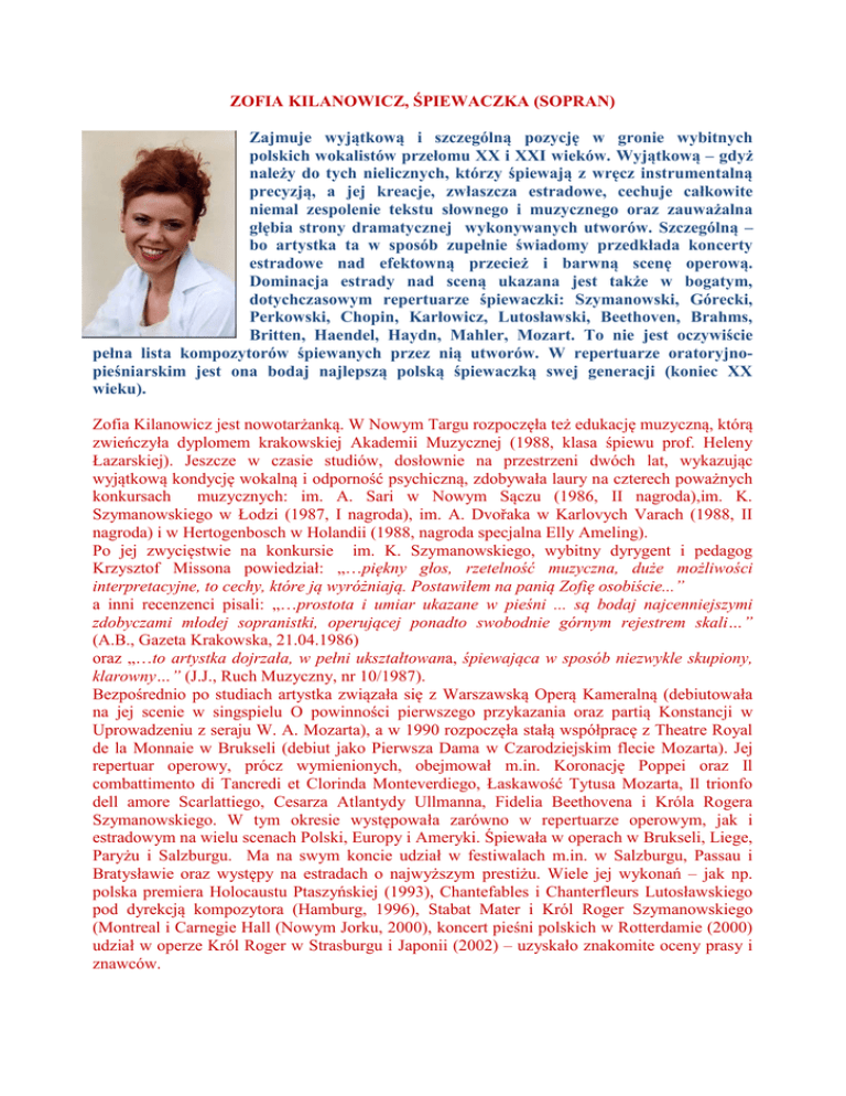 ZOFIA KILANOWICZ, ŚPIEWACZKA (SOPRAN) Zajmuje wyjątkową i szczególną pozycję w gronie wybitnych polskich wokalistów przełomu XX i XXI wieków. Wyjątkową – gdyż należy do tych nielicznych, którzy śpiewają z wręcz instrumentalną precyzją, a jej kreacje, zwłaszcza estradowe, cechuje całkowite niemal zespolenie tekstu słownego i muzycznego oraz zauważalna głębia strony dramatycznej wykonywanych utworów. Szczególną – bo artystka ta w sposób zupełnie świadomy przedkłada koncerty estradowe nad efektowną przecież i barwną scenę operową. Dominacja estrady nad sceną ukazana jest także w bogatym, dotychczasowym repertuarze śpiewaczki: Szymanowski, Górecki, Perkowski, Chopin, Karłowicz, Lutosławski, Beethoven, Brahms, Britten, Haendel, Haydn, Mahler, Mozart. To nie jest oczywiście pełna lista kompozytorów śpiewanych przez nią utworów. W repertuarze oratoryjnopieśniarskim jest ona bodaj najlepszą polską śpiewaczką swej generacji (koniec XX wieku). Zofia Kilanowicz jest nowotarżanką. W Nowym Targu rozpoczęła też edukację muzyczną, którą zwieńczyła dyplomem krakowskiej Akademii Muzycznej (1988, klasa śpiewu prof. Heleny Łazarskiej). Jeszcze w czasie studiów, dosłownie na przestrzeni dwóch lat, wykazując wyjątkową kondycję wokalną i odporność psychiczną, zdobywała laury na czterech poważnych konkursach muzycznych: im. A. Sari w Nowym Sączu (1986, II nagroda),im. K. Szymanowskiego w Łodzi (1987, I nagroda), im. A. Dvořaka w Karlovych Varach (1988, II nagroda) i w Hertogenbosch w Holandii (1988, nagroda specjalna Elly Ameling). Po jej zwycięstwie na konkursie im. K. Szymanowskiego, wybitny dyrygent i pedagog Krzysztof Missona powiedział: „…piękny głos, rzetelność muzyczna, duże możliwości interpretacyjne, to cechy, które ją wyróżniają. Postawiłem na panią Zofię osobiście...” a inni recenzenci pisali: „…prostota i umiar ukazane w pieśni ... są bodaj najcenniejszymi zdobyczami młodej sopranistki, operującej ponadto swobodnie górnym rejestrem skali…” (A.B., Gazeta Krakowska, 21.04.1986) oraz „…to artystka dojrzała, w pełni ukształtowana, śpiewająca w sposób niezwykle skupiony, klarowny…” (J.J., Ruch Muzyczny, nr 10/1987). Bezpośrednio po studiach artystka związała się z Warszawską Operą Kameralną (debiutowała na jej scenie w singspielu O powinności pierwszego przykazania oraz partią Konstancji w Uprowadzeniu z seraju W. A. Mozarta), a w 1990 rozpoczęła stałą współpracę z Theatre Royal de la Monnaie w Brukseli (debiut jako Pierwsza Dama w Czarodziejskim flecie Mozarta). Jej repertuar operowy, prócz wymienionych, obejmował m.in. Koronację Poppei oraz Il combattimento di Tancredi et Clorinda Monteverdiego, Łaskawość Tytusa Mozarta, Il trionfo dell amore Scarlattiego, Cesarza Atlantydy Ullmanna, Fidelia Beethovena i Króla Rogera Szymanowskiego. W tym okresie występowała zarówno w repertuarze operowym, jak i estradowym na wielu scenach Polski, Europy i Ameryki. Śpiewała w operach w Brukseli, Liege, Paryżu i Salzburgu. Ma na swym koncie udział w festiwalach m.in. w Salzburgu, Passau i Bratysławie oraz występy na estradach o najwyższym prestiżu. Wiele jej wykonań – jak np. polska premiera Holocaustu Ptaszyńskiej (1993), Chantefables i Chanterfleurs Lutosławskiego pod dyrekcją kompozytora (Hamburg, 1996), Stabat Mater i Król Roger Szymanowskiego (Montreal i Carnegie Hall (Nowym Jorku, 2000), koncert pieśni polskich w Rotterdamie (2000) udział w operze Król Roger w Strasburgu i Japonii (2002) – uzyskało znakomite oceny prasy i znawców. - Chociaż najczęściej śpiewam muzykę Szymanowskiego i Góreckiego, nie zapominam o innych kompozytorach, zwłaszcza polskich, ponieważ za swój obowiązek uznaję propagowanie rodzimej twórczości – powiedziała w jednym z wywiadów. O ogromnych możliwościach tej utalentowanej artystki, a także o jej wielkiej kulturze artystycznej świadczy bardzo starannie dobierany i przygotowywany repertuar. Wykonywane utwory śpiewa zawsze w języku oryginału. Olbrzymią wagę przykłada do słowa. W jej interpretacjach dominuje pełne zespolenie muzyki z warstwą słowną. Nastrój, klimat oraz emocje śpiewanych utworów zawsze przekazuje w sposób naturalny, bezpośrednio środkami wokalnymi (J. Chodorowski). Jej głos, jak podkreślają krytycy, jest pełen blasku zarówno w pianissimo, jak i w fortissimo zachowuje idealną dźwięczność i nośność (J. Kański), ...wyrównana emisja pięknego, nośnego głosu i skupiona interpretacja oraz nieskazitelne, niebiańskie brzmienie, któremu towarzyszy piękne frazowanie i absolutna pewność emisji… (P. Orski). Nazwisko Zofii Kilanowicz często bywa kojarzone z wykonawstwem III Symfonii Góreckiego. Śpiewała ją niezliczoną ilość razy (m.in. podczas uroczystego koncertu w Berlinie z okazji zjednoczenia Niemiec), nagrała kilkakrotnie na płyty (m.in. CD - Naxos, 1993), zdobywając pochwały krytyki: „…ozdobą III Symfonii była młoda sopranistka Zofia Kilanowicz. Żałość pieśni Góreckiego wyśpiewała z wielką kulturą wokalną i szczerą ekspresją. Takiego właśnie głosu – subtelnego i szlachetnego prostotą potrzebuje to dzieło. Ponadto solistka świetnie uchwyciła tragiczny sens symfonii, rozświetlającej się w jasnym dur... Cały dramat zawarł się w śpiewie Zofii Kilanowicz, która okazała się jedną z najlepszych interpretatorek utworu” (Gazeta Wyborcza, 1998). Głos i sztuka Zofii Kilanowicz zostały szczęśliwie utrwalone na kilku nagranych przez nią płytach kompaktowych. Prócz wymienionych wcześniej, jest jeszcze w zapisie Requiem Mozarta (Classic, 1991), komplet pieśni Chopina (Canyon Classics, 1994), Pieśni muezzina szalonego i Słopiewni Szymanowskiego (Telarc, 2000), II Symfonia Góreckiego (Naxos, 2000). Swoistym zwieńczeniem dotychczasowego dorobku fonograficznego artystki jest, nagrana dla Pols