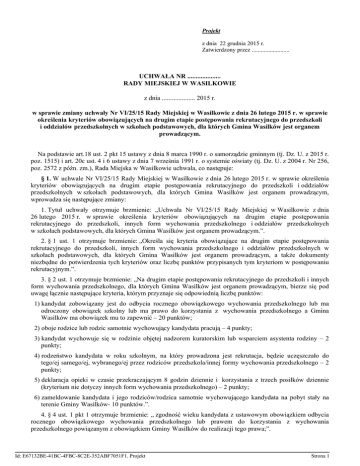 Projekt z dnia 22 grudnia 2015 r. Zatwierdzony przez ......................... UCHWAŁA NR .................... RADY MIEJSKIEJ W WASILKOWIE z dnia .................... 2015 r. w sprawie zmiany uchwały Nr VI/25/15 Rady Miejskiej w Wasilkowie z dnia 26 lutego 2015 r. w sprawie określenia kryteriów obowiązujących na drugim etapie postępowania rekrutacyjnego do przedszkoli i oddziałów przedszkolnych w szkołach podstawowych, dla których Gmina Wasilków jest organem prowadzącym. Na podstawie art.18 ust. 2 pkt 15 ustawy z dnia 8 marca 1990 r. o samorządzie gminnym (tj. Dz. U. z 2015 r. poz. 1515) i art. 20c ust. 4 i 6 ustawy z dnia 7 września 1991 r. o systemie oświaty (tj. Dz. U. z 2004 r. Nr 256, poz. 2572 z późn. zm.), Rada Miejska w Wasilkowie uchwala, co następuje: § 1. W uchwale Nr VI/25/15 Rady Miejskiej w Wasilkowie z dnia 26 lutego 2015 r. w sprawie określenia kryteriów obowiązujących na drugim etapie postępowania rekrutacyjnego do przedszkoli i oddziałów przedszkolnych w szkołach podstawowych, dla których Gmina Wasilków jest organem prowadzącym, wprowadza się następujące zmiany: 1. Tytuł uchwały otrzymuje brzmienie: „Uchwała Nr VI/25/15 Rady Miejskiej w Wasilkowie z dnia 26 lutego 2015 r. w sprawie określenia kryteriów obowiązujących na drugim etapie postępowania rekrutacyjnego do przedszkoli, innych form wychowania przedszkolnego i oddziałów przedszkolnych w szkołach podstawowych, dla których Gmina Wasilków jest organem prowadzącym.”. 2. § 1 ust. 1 otrzymuje brzmienie: „Określa się kryteria obowiązujące na drugim etapie postępowania rekrutacyjnego do przedszkoli, innych form wychowania przedszkolnego i oddziałów przedszkolnych w szkołach podstawowych, dla których Gmina Wasilków jest organem prowadzącym, a także dokumenty niezbędne do potwierdzenia tych kryteriów oraz liczbę punktów przypisanych tym kryteriom w postępowaniu rekrutacyjnym.”. 3. § 2 ust. 1 otrzymuje brzmienie: „Na drugim etapie postępowania rekrutacyjnego do przedszkoli i innych form wychowania przedszkolnego, dla których Gmina Wasilków jest organem prowadzącym, bierze się pod uwagę łącznie następujące kryteria, którym przyznaje się odpowiednią liczbę punktów: 1) kandydat zobowiązany jest do odbycia rocznego obowiązkowego wychowania przedszkolnego lub ma odroczony obowiązek szkolny lub ma prawo do korzystania z wychowania przedszkolnego a Gmina Wasilków ma obowiązek mu to zapewnić – 20 punktów; 2) oboje rodzice lub rodzic samotnie wychowujący kandydata pracują – 4 punkty; 3) kandydat wychowuje się w rodzinie objętej nadzorem kuratorskim lub wsparciem asystenta rodziny – 2 punkty; 4) rodzeństwo kandydata w roku szkolnym, na który prowadzona jest rekrutacja, będzie uczęszczało do tego/ej samego/ej, wybranego/ej przez rodziców przedszkola/innej formy wychowania przedszkolnego – 2 punkty; 5) deklaracja opieki w czasie przekraczającym 8 godzin dziennie i korzystania z trzech posiłków dziennie (kryterium nie dotyczy innych form wychowania przedszkolnego) – 2 punkty; 6) zameldowanie kandydata i jego rodziców/rodzica samotnie wychowującego kandydata na pobyt stały na terenie Gminy Wasilków- 10 punktów.”. 4. § 4 ust. 1 pkt 1 otrzymuje brzmienie: „ zgodność wieku kandydata z ustawowym obowiązkiem odbycia rocznego obowiązkowego wychowania przedszkolnego lub prawem do korzystania z wychowania przedszkolnego powiązanym z obowiązkiem Gminy Wasilków do realizacji tego prawa;”. Id: E67132BE-41BC-4FBC-8C2E-352ABF7051F1. Projekt Strona 1 5. W § 4 dodaje się ust. 5 w brzmieniu: „Za spełnienie kryterium, o którym mowa w § 2 ust. 1 pkt 6, uważa się złożenie przez rodzica oświadczenia o zameldowaniu na pobyt stały na terenie Gminy Wasilków.”. § 2. Wykonanie uchwały powierza się Burmistrzowi Wasilkowa. § 3. Uchwała wchodzi w życie po upływie 14 dni od dnia ogłoszenia w Dzienniku Urzędowym Województwa Podlaskiego. Id: E67132BE-41BC-4FBC-8C2E-352ABF7051F1. Projekt Strona 2 Uzasadnienie W myśl art. 20c ust. 1 ustawy z dnia 7 września 1991 r. o systemie oświaty (tj. Dz. U. z 2004 r. Nr 256, poz. 2572 z późn. zm.) do publicznego przedszkola lub publicznej innej formy wychowania przedszkolnego przyjmowane są dzieci zamieszkałe na obszarze danej gminy. W przypadku większej liczby kandydatów niż liczba wolnych miejsc w publicznym przedszkolu lub publicznej innej formie wychowania przedszkolnego, na pierwszym etapie postępowania rekrutacyjnego brane są pod uwagę łącznie następujące kryteria ustawowe: 1) wielodzietność rodziny kandydata, 2) niepełnosprawność kandydata, 3) niepełnosprawność jednego z rodziców kandydata, 4) niepełnosprawność obojga rodziców kandydata, 5) niepełnosprawność rodzeństwa kandydata, 6) samotne wychowywanie kandydata w rodzinie, 7) objęcie kandydata pieczą zastępczą. Powyższe kryteria mają jednakową wartość. W przypadku równorzędnych wyników uzyskanych na pierwszym etapie postępowania rekrutacyjnego lub jeśli po zakończeniu tego etapu publiczne przedszkole lub publiczna inna forma wychowania przedszkolnego nadal dysponuje wolnymi miejscami, rada gminy upoważniona jest jako organ prowadzący do określenia nie więcej niż 6 kryteriów branych pod uwagę na drugim etapie postępowania rekrutacyjnego, tzw. kryteriów gminnych. Mogą mieć one różną wartość. Rada gminy określa również dokumenty niezbędne do potwierdzenia spełnienia tych kryteriów. Uchwała Nr VI/25/15 Rady Miejskiej w Wasilkowie z dnia 26 lutego 2015 r. w sprawie określenia kryteriów obowiązujących na drugim etapie postępowania rekrutacyjnego do przedszkoli i oddziałów przedszkolnych w szkołach podstawowych, dla których Gmina Wasilków jest organem prowadzącym, nie zawierała kryteriów rekrutacji do innych form wychowania przedszkolnego. W związku z czym w proponowanym projekcie zmian do w/w uchwały znalazły się zapisy dotyczą