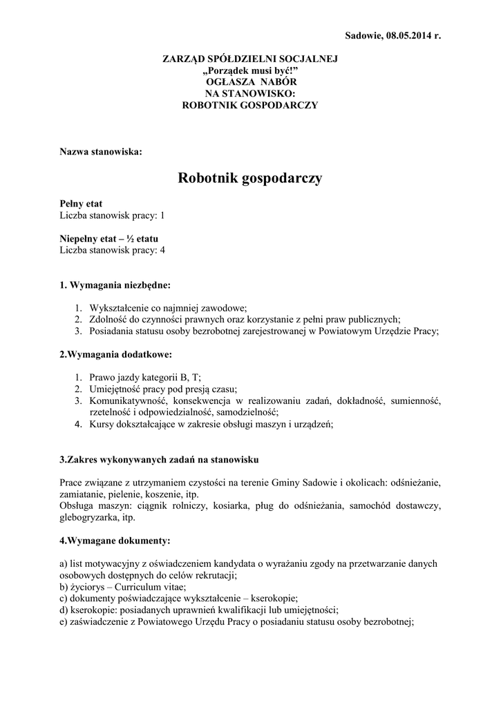 Sadowie, 08.05.2014 r. ZARZĄD SPÓŁDZIELNI SOCJALNEJ „Porządek musi być!” OGŁASZA NABÓR NA STANOWISKO: ROBOTNIK GOSPODARCZY Nazwa stanowiska: Robotnik gospodarczy Pełny etat Liczba stanowisk pracy: 1 Niepełny etat – ½ etatu Liczba stanowisk pracy: 4 1. Wymagania niezbędne: 1. Wykształcenie co najmniej zawodowe; 2. Zdolność do czynności prawnych oraz korzystanie z pełni praw publicznych; 3. Posiadania statusu osoby bezrobotnej zarejestrowanej w Powiatowym Urzędzie Pracy; 2.Wymagania dodatkowe: 1. Prawo jazdy kategorii B, T; 2. Umiejętność pracy pod presją czasu; 3. Komunikatywność, konsekwencja w realizowaniu zadań, dokładność, sumienność, rzetelność i odpowiedzialność, samodzielność; 4. Kursy dokształcające w zakresie obsługi maszyn i urządzeń; 3.Zakres wykonywanych zadań na stanowisku Prace związane z utrzymaniem czystości na terenie Gminy Sadowie i okolicach: odśnieżanie, zamiatanie, pielenie, koszenie, itp. Obsługa maszyn: ciągnik rolniczy, kosiarka, pług do odśnieżania, samochód dostawczy, glebogryzarka, itp. 4.Wymagane dokumenty: a) list motywacyjny z oświadczeniem kandydata o wyrażaniu zgody na przetwarzanie danych osobowych dostępnych do celów rekrutacji; b) życiorys – Curriculum vitae; c) dokumenty poświadczające wykształcenie – kserokopie; d) kserokopie: posiadanych uprawnień kwalifikacji lub umiejętności; e) zaświadczenie z Powiatowego Urzędu Pracy o posiadaniu statusu osoby bezrobotnej; Wymagane dokumenty aplikacyjne należy składać w kopercie z adnotacją „ Dotyczy naboru na stanowisko: pracownik gospodarczy w Spółdzielni socjalnej „Porządek musi być!” w siedzibie Urzędu Gminy Sadowie (pokój nr 6 - sekretariat) lub pocztą na adres Urzędu Gminy Sadowie 27-580 Sadowie 86. Wymagane dokumenty należy złożyć w terminie do dnia 15 maja 2014 r. do godz. 15.00. Nie dopuszcza się składania dokumentów aplikacyjnych drogą elektroniczną. Aplikacje, które wpłyną do Urzędu Gminy Sadowie po wyżej określonym terminie nie będą rozpatrywane. Kandydaci którzy przejdą wstępną selekcję zostaną powiadomieni o terminie rozmowy kwalifikacyjnej. Dodatkowe informacje można uzyskać pod numerem telefonu 15 869 24 37 – Piotr Wójtowicz Data ogłoszenia konkursu: 08.05.2014 r.