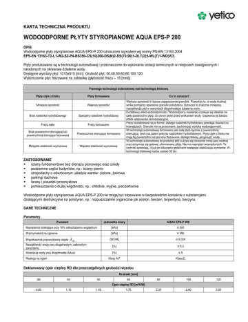KARTA TECHNICZNA PRODUKTU WODOODPORNE PŁYTY STYROPIANOWE AQUA EPS-P 200 OPIS Wodoodporne płyty styropianowe AQUA EPS-P 200 oznaczone są kodem wg normy PN-EN 13163:2004 EPS-EN 13163-T2-L1-W2-S2-P4-BS350-CS(10)200-DS(N)2-DS(70,90)1-DLT(2)5-WL(T)1-WD(V)3. Płyty produkowane są w technologii automatowej i przeznaczone do wykonania izolacji termicznych w miejscach zawilgoconych i naraŜonych na okresowe działanie wody. Dostępne wymiary płyt: 1015x515 [mm]. Grubość płyt: 30,40,50,60,80,100,120. Wykończenie płyt: frezowane na zakładkę (głębokość frezu – 15 [mm]). Przewaga technologii automatowej nad technologią blokową Płyty cięte z bloku Płyty formowane Co to oznacza? Mniejsza spoistość Większa spoistość Brak naskórka hydrofobowego Specjalny naskórek hydrofobowy Frezy cięte Frezy formowane Brak powierzchni drenującej lub powierzchnia drenująca frezowana Powierzchnia drenująca formowana Mniejsza stabilność wymiarowa Większa stabilność wymiarowa Większa spoistość to lepsze zagęszczenie granulek. Powoduje to, iŜ woda trudniej wnika pomiędzy spienione granulki polistyrenu. Oznacza to znacznie mniejszą nasiąkliwość płyt w warunkach długotrwałego działania wody. Dodatkowy efekt wodoodporności. Wodoodporny naskórek uzyskuje się idealnie na całej powierzchni płyty, co chroni płytę przed wnikaniem wody i zapewnia jej bardzo dobre właściwości termoizolacyjne. Frezy kształtowane są w formie, dlatego naskórek hydrofobowy powstaje równieŜ na krawędziach. Granulki nie są przecinane, zachowując wysoką wodoodporność. W technologii automatowej formowana jest cała płyta łącznie z powierzchnią drenującą. Jest ona zatem pokryta naskórkiem hydrofobowym. Płyty cięte z bloku nie mają tej powierzchni lub jest ona frezowana, dlatego łatwiej „przyjmują” wodę. W technologii automatowej do produkcji płyt zuŜywa się znacznie mniej pary wodnej oraz otrzymuje się gotową, uformowana płytę. Nie ma napręŜeń wewnętrznych. Te czynniki sprawiają, iŜ juŜ po kilkunastu godzinach następuje stabilizacja wymiarów. W technologii blokowej trzeba czekać 30 dni. ZASTOSOWANIE ściany fundamentowe bez drenaŜu pionowego oraz cokoły podziemne części budynków, np.: ściany piwnic stropodachy o odwróconym układzie warstw: zielone, Ŝwirowe parkingi dachowe tarasy i posadzki przemysłowe pomieszczenia o duŜej wilgotności, np.: chłodnie, myjnie, pieczarkarnie Wodoodporne płyty styropianowe AQUA EPS-P 200 nie mogą być stosowane w bezpośrednim kontakcie z substancjami działającymi destrukcyjnie na polistyren, np.: rozpuszczalniki organiczne jak aceton, benzen, terpentyna, benzyna. DANE TECHNICZNE Parametry Parametr Jednostka miary NapręŜenia ściskające przy 10% odkształceniu względnym [kPa] ≥ 200 Wytrzymałość na zginanie [kPa] ≥ 350 [W/mK] ≤ 0,034 [%] ≤ 0,3 Współczynnik przewodzenia ciepła λD Nasiąkliwość wody przy długotrwałym, całkowitym zanurzeniu Absorpcja wody przy długotrwałej dyfuzji Reakcja na ogień AQUA EPS-P 200 [%] ≤5 Klasy A-F Klasa E Deklarowany opór cieplny RD dla poszczególnych grubości wyrobu Grubość [mm] 30 40 50 60 80 100 120 2,35 2,90 3,50 Opór cieplny RD [m²K/W] 0,85 1,15 1,45 1,75 WYMIARY I PAKOWANIE Wyszczególnienie Jednostka miary Grubość płyt Format płyty Długość Szerokość Powierzchnia krycia płyty Długość AQUA EPS-P 200 [mm] 30 40 50 60 80 100 120 [mm] 1015 1015 1015 1015 1015 1015 1015 [mm] 515 515 515 515 515 515 515 [mm] 1000 1000 1000 1000 1000 1000 1000 [mm] 500 500 500 500 500 500 500 Ilość płyt w paczce [szt.] 20 15 12 10 7 6 5 Powierzchnia krycia 1 paczki [m2] 10 7,5 6 5 3,5 3 2,5 Objętość 1 paczki [m3] 0,30 0,30 0,30 0,30 0,28 0,30 0,30 Szerokość DOPUSZCZENIA Deklaracja zgodności EC nr 13/2007 z Normą PN-EN 13163:2004. YETICO Sp. z o.o. ul. Towarowa 17A 10-416 Olsztyn Centrala, Biuro Zarządu tel. (+4889) 538 78 11 fax (+4889) 538 78 10 e-mail: [email protected] BIURO OBSŁUGI KLIENTA - OLSZTYN tel. (+4889) 538 78 51 lub 52 fax (+4889) 089 538 78 50 e-mail: [email protected] BIURO OBSŁUGI KLIENTA – GALEWICE tel. (+4862) 783 80 89 fax (+4862) 783 80 22 e-mail: [email protected]
