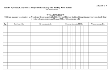 Załącznik nr 10 Komitet Wyborczy Kandydata na Prezydenta Rzeczypospolitej Polskiej Pawła Kukiza (imię i nazwisko kandydata) WYKAZ PODPISÓW Udzielam poparcia kandydatowi na Prezydenta Rzeczypospolitej Polskiej Pawłowi Piotrowi Kukizowi [imię (imiona) i nazwisko kandydata] w wyborach zarządzonych na 10 maja 2015 r. (dzień, miesiąc, rok) Lp. Imię i nazwisko Adres zamieszkania Numer ewidencyjny PESEL Własnoręczny podpis