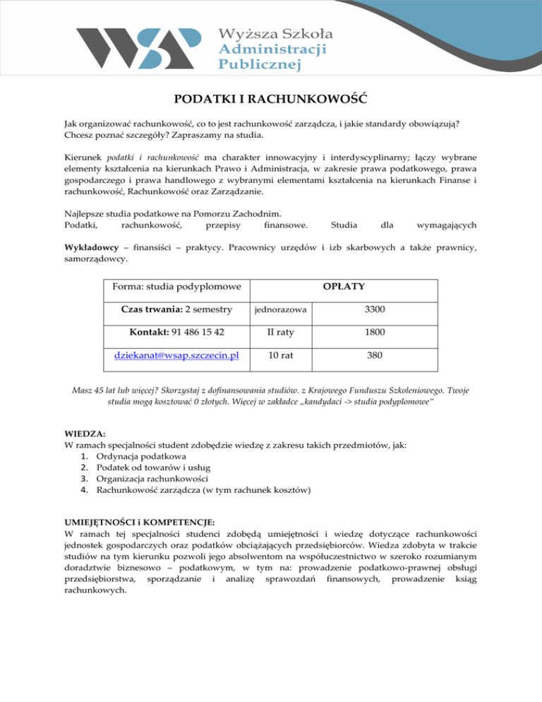 PODATKI I RACHUNKOWOŚĆ Jak organizować rachunkowość, co to jest rachunkowość zarządcza, i jakie standardy obowiązują? Chcesz poznać szczegóły? Zapraszamy na studia. Kierunek podatki i rachunkowość ma charakter innowacyjny i interdyscyplinarny; łączy wybrane elementy kształcenia na kierunkach Prawo i Administracja, w zakresie prawa podatkowego, prawa gospodarczego i prawa handlowego z wybranymi elementami kształcenia na kierunkach Finanse i rachunkowość, Rachunkowość oraz Zarządzanie. Najlepsze studia podatkowe na Pomorzu Zachodnim. Podatki, rachunkowość, przepisy finansowe. Studia dla wymagających Wykładowcy – finansiści – praktycy. Pracownicy urzędów i izb skarbowych a także prawnicy, samorządowcy. Forma: studia podyplomowe OPŁATY Czas trwania: 2 semestry jednorazowa 3300 Kontakt: 91 486 15 42 II raty 1800 [email protected] 10 rat 380 Masz 45 lat lub więcej? Skorzystaj z dofinansowania studiów. z Krajowego Funduszu Szkoleniowego. Twoje studia mogą kosztować 0 złotych. Więcej w zakładce „kandydaci -> studia podyplomowe” WIEDZA: W ramach specjalności student zdobędzie wiedzę z zakresu takich przedmiotów, jak: 1. Ordynacja podatkowa 2. Podatek od towarów i usług 3. Organizacja rachunkowości 4. Rachunkowość zarządcza (w tym rachunek kosztów) UMIEJĘTNOŚCI i KOMPETENCJE: W ramach tej specjalności studenci zdobędą umiejętności i wiedzę dotyczące rachunkowości jednostek gospodarczych oraz podatków obciążających przedsiębiorców. Wiedza zdobyta w trakcie studiów na tym kierunku pozwoli jego absolwentom na współuczestnictwo w szeroko rozumianym doradztwie biznesowo – podatkowym, w tym na: prowadzenie podatkowo-prawnej obsługi przedsiębiorstwa, sporządzanie i analizę sprawozdań finansowych, prowadzenie ksiąg rachunkowych. PERSPEKTYWY ZAWODOWE: Dzięki wszechstronnej i interdyscyplinarnej formule studiów absolwent kierunku jest przygotowany do rozwoju w przyszłości własnej kariery zawodowej przez zdobycie kwalifikacji i uprawnień pozwalających m.in. na pracę w charakterze: • pracownika organów administracji skarbowej, • głównego księgowego, • kierownika biura rachunkowego, • kierownika działu finansowego, • dyrektora finansowego. PROGRAM STUDIÓW L.p. 1 2 3 4 5 6 7 8 9 10 11 12 13 14 15 16 17 18 19 20 21 22 23 Nazwa bloku/modułu/przedmiotu Wstęp do prawoznawstwa Elementy prawa cywilnego Prawo gospodarcze i handlowe Wprowadzenie do podatków oraz organizacja administracji poboru danin publicznych w Polsce Ordynacja podatkowa Podatek od towarów i usług Podatek akcyzowy i podatek od gier Podatek dochodowy od osób fizycznych (w tym zryczałtowany) Podatek dochodowy od osób prawnych Podatki samorządowe Podatki w Unii Europejskiej Organizacja rachunkowości Rachunkowość finansowa i sprawozdawczość Rachunkowość informatyczna Rachunkowość zarządcza (w tym rachunek kosztów) Międzynarodowe regulacje rachunkowości Prawo karne-skarbowe Postępowanie egzekucyjne Wykładnia prawa podatkowego Ewidencje podatkowe Kontrola podatkowa i skarbowa Prawo celne Seminarium dyplomowe Razem Liczba godzin 5 6 6 3 14 14 5 8 8 5 6 8 24 10 16 5 6 5 5 6 6 5 4 180