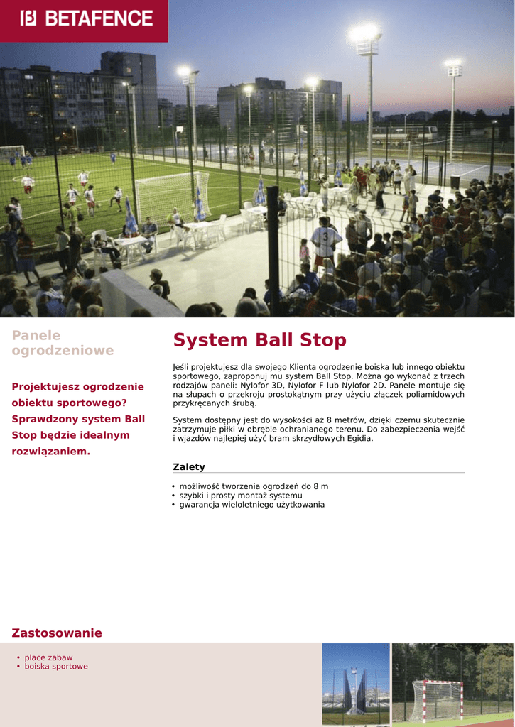 Panele ogrodzeniowe System Ball Stop Projektujesz ogrodzenie Jeśli projektujesz dla swojego Klienta ogrodzenie boiska lub innego obiektu sportowego, zaproponuj mu system Ball Stop. Można go wykonać z trzech rodzajów paneli: Nylofor 3D, Nylofor F lub Nylofor 2D. Panele montuje się na słupach o przekroju prostokątnym przy użyciu złączek poliamidowych przykręcanych śrubą. obiektu sportowego? Sprawdzony system Ball Stop będzie idealnym System dostępny jest do wysokości aż 8 metrów, dzięki czemu skutecznie zatrzymuje piłki w obrębie ochranianego terenu. Do zabezpieczenia wejść i wjazdów najlepiej użyć bram skrzydłowych Egidia. rozwiązaniem. Zalety • możliwość tworzenia ogrodzeń do 8 m • szybki i prosty montaż systemu • gwarancja wieloletniego użytkowania Zastosowanie • place zabaw • boiska sportowe Panele • Do systemu Ball Stop wykorzystać można panele Nylofor 3D, Nylofor 2D i Nylofor F Słupy • Słupy o przekroju prostokątnym • Występują w wersji pośredniej lub narożnej • Panele montowane są do boku słupa przy użyciu złączek poliamidowych przykręcanych śrubą Technologia powlekania • Panele wykonane są z ocynkowanych drutów (min. 40 g/m2) • Zastosowany proces przygotowania powierzchni zapewnia doskonałą przyczepność powłoki do podłoża • Po ocynkowaniu elementy powlekane są proszkiem poliestrowym (grubość powłoki poliestrowej min. 100 mikrometrów) • Słupy są ocynkowane wewnątrz i na zewnątrz(min. grubość powłoki 275 g/m2 z obu stron), zgodnie z normą EN 10326 • Po ocynkowaniu słupy pokrywane są proszkiem poliestrowym (nin. 60 mikrometrów) Kolory • Zielony RAL 6005 Montaż • Podczas montażu systemu należy upewnić się, że woda nie znajduje się wewnątrz słupów System Ball Stop Wysokość ogrodzenia [mm] Wymiary panelu szer. x wys. [mm] Liczba złączek na słup pośredni Liczba złączek na słup narożny Wysokość słupa [mm] Profil [mm] 2430 2500x2430 7 14 3200 80x60x2,50 3060 2500x2030 + 2500x1030 9 18 3700 80x60x2,50 4090 2500x2030(x2) 12 24 4800 80x60x2,50 15 30 6000 120x60x3,00 5090 2500x2030 (x2) + 2500x1030 6090 2500x2030(x3) 18 36 7000 120x60x3,00 7120 2500x2030(x3) + 2500x1030 21 42 8000 120x60x3,00 8120 2500x2030(x4) 24 48 9000 120x60x3,00