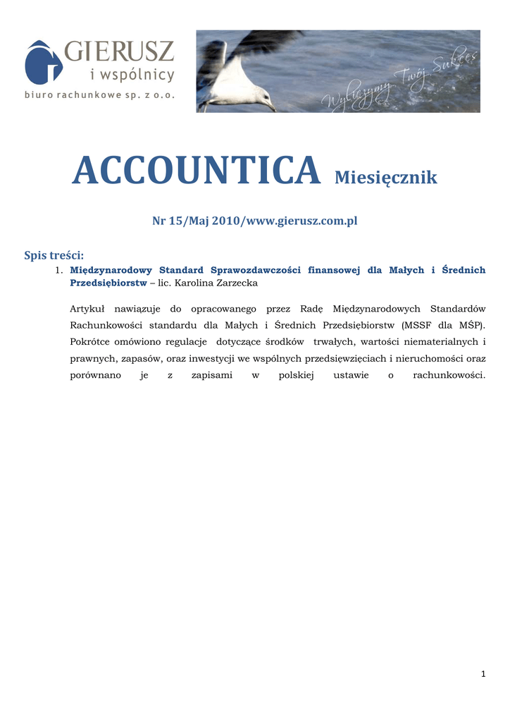 ACCOUNTICA Miesięcznik Nr 15/Maj 2010/www.gierusz.com.pl Spis treści: 1. Międzynarodowy Standard Sprawozdawczości finansowej dla Małych i Średnich Przedsiębiorstw – lic. Karolina Zarzecka Artykuł nawiązuje do opracowanego przez Radę Międzynarodowych Standardów Rachunkowości standardu dla Małych i Średnich Przedsiębiorstw (MSSF dla MŚP). Pokrótce omówiono regulacje dotyczące środków trwałych, wartości niematerialnych i prawnych, zapasów, oraz inwestycji we wspólnych przedsięwzięciach i nieruchomości oraz porównano je z zapisami w polskiej ustawie o rachunkowości. 1 Międzynarodowy Standard Sprawozdawczości Finansowej dla Małych i Średnich Przedsiębiorstw Wstęp Małe i średnie przedsiębiorstwa stanowią sprawozdawczych. bardzo podmiotów szczegółowość i związana z nią trudność świecie. wdroŜenia tych przepisów przez mniejsze liczną grupę gospodarujących Obecnie w na Polsce całym 99% jednostek gospodarczych to przedsiębiorstwa małe podmioty Ta właśnie spowodowała konieczność stworzenia odrębnych regulacji dla MŚP. lub średnie które zatrudniają około 70% ogółu pracujących1. Dlatego teŜ w 1. Ogólna charakterystyka MSSF dla ostatnich latach zostały podjęte próby MŚP stworzenia norm prawnych w zakresie Pierwszy projekt MSSF dla MŚP został rachunkowości typu opublikowany w połowie 2006 roku. Od Rada tego podmiotów. właśnie W 2009 dla tego roku Międzynarodowych Standardów czasu w przeprowadzano ponad 40 konsultacje krajach oraz testy Rachunkowości opracowała Standard dla praktyczne. Dnia 9 lipca 2009 r. Rada Małych Międzynarodowych i Średnich Przedsiębiorstw, Standardów którego zadaniem ma być ujednolicenie Rachunkowości ogłosiła i opublikowała wszystkich norm prawnych dla MŚP na MSSF dla MŚP w wersji ostatecznej. świecie. Obowiązujące do tej pory standardy w pełnej wersji MSR/MSSF MSSF dotyczyły dokumentem działalności duŜych spółek dla MŚP jest samodzielnym obejmującym zasady kapitałowych, które potrzebowały bardzo rachunkowości analogiczne do pełnego szczegółowych norm i regulacji zestawu MSR/MSSF uproszczonej, 1 Problemy współczesnej rachunkowości, Praca zbiorowa pod redakcją naukową pracowników Katedry Rachunkowości SGH, Szkoła Główna Handlowa w Warszawie, Warszawa 2009, str. 206 dopasowanej w do wersji potrzeb mniejszych jednostek. 2 Międzynarodowy Standard Sprawozdawczości Finansowej MŚP składa nieprowadzące działalności zarobkowej, organizacje kościelne i inne3. się z 34 rozdziałów które obejmują łącznie około 230 stron. Standard ma strukturę W tematyczną nadającą mu formę instrukcji. Sprawozdawczości Finansowej dla Małych Dodatkowo Rada dołączyła do MSSF dla i Średnich Jednostek Rada nie podała MŚP dwie broszury uzupełniające2. Ŝadnych danych liczbowych określających te Rada Międzynarodowych Rachunkowości Standardów nie jednoznacznie małych i Międzynarodowym podmioty. Nie dotyczących Standardzie ma teŜ wymogów przychodów definiuje średniorocznego średnich szczegółowe czy teŜ zatrudnienia. informacje Te pozostały do przedsiębiorstw. RMSR określiła jedynie, ewentualnego ustalenia innym właściwym Ŝe standard ten został stworzony dla władzom poszczególnych państw. Istotną podmiotów cechą MSSF dla MŚP jest to, Ŝe kaŜda nie zainteresowania publikujących mających statusu a jednostka, która zdecyduje finansowe wdroŜenie tego Standardu, publicznego, sprawozdania będzie zobowiązana zewnętrznych, którymi mogą być m.in.: wszystkich aspektach, nie ma moŜliwości agencje ratingowe, kredytodawcy. odejścia od pewnych regulacji. Zakres stosowania Standardu rozciąga się Rada równieŜ na jednostki sektora prywatnego Rachunkowości nie określiła daty wejścia nastawione na zysk, do których naleŜą w Ŝycie Standardu decyzja ta równieŜ organizacje naleŜy do władz poszczególnych państw.4 fundacje jego na ogólnego przeznaczenia dla uŜytkowników charytatywne, do się stosowania Międzynarodowych we Standardów 3 2 Uproszczona sprawozdawczość finansowa – ulga dla małych i średnich przedsiębiorstw, Biuletyn MSSF, 6/2010 z 15/07/2010 W. A. Nowak, Międzynarodowy Standard Sprawozdawczości Finansowej dla Małych i średnich Jednostek – uchwalony, Rachunkowość nr 9/2009 4 MSSF i polskie zasady rachunkowości dla praktyków, Biuletyn MSSF, Nr 1 z dnia 01/01/2010 3 2. Rzeczowe aktywa trwałe aktach prawnych według ceny nabycia lub Zgodnie z definicją zawartą w rozdziale 16 kosztu Międzynarodowego nabycia w UoR jest identyczna jak w Standardu wytworzenia. przypadku rzeczowe aktywa trwałe są to aktywa przedstawiona w dalszej części artykułu. materialne, które są utrzymywane w celu Definicja ceny nabycia środków trwałych wykorzystania wg MSSF dla MŚP wskazuje cztery grupy w procesie bliŜej kosztów, świadczeniu usług, w celu oddania do kategorii, a są ujmowane uŜywania innym podmiotom na podstawie okresu w momencie ich poniesienia. Są to umowy koszty: lub innych celach nie zostanie produkcyjnym lub przy dostawach dóbr i najmu które i ceny Sprawozdawczości Finansowej dla MŚP ich zapasów Definicja podwyŜszają administracyjnych oraz którym towarzyszy - otwarcia nowego zakładu, oczekiwanie, - iŜ będą wykorzystywane związane tej jako koszty rozpoczęciem wytwarzania okres5. nowego produktu lub świadczenia nowej Standard zaznacza równieŜ, Ŝe istotne usługi (łącznie z kosztami promocji i części zamienne lub awaryjne wyposaŜenie reklamy), mogą być równieŜ włączone do tej pozycji - aktywów. lokalizacji lub wśród nowego segmentu przez czas dłuŜszy niŜ jeden rozpoczęcia klientów działalności (łącznie Cechą odróŜniającą opisywany Standard pracowników), od UoR jest to, Ŝe w prawie polskim - dzielimy rzeczowe aktywa trwałe na środki pośrednie. z administracyjne w kosztami oraz nowej szkoleń ogólne koszty trwałe, środki trwałe w b