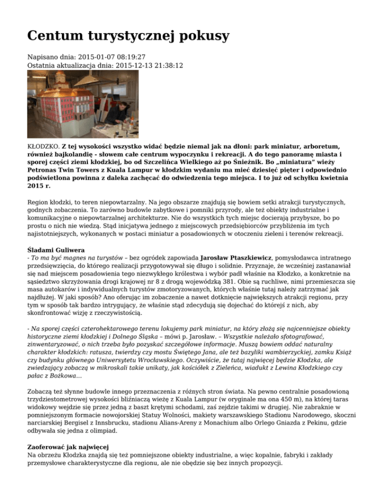 Centum turystycznej pokusy Napisano dnia: 2015-01-07 08:19:27 Ostatnia aktualizacja dnia: 2015-12-13 21:38:12 KŁODZKO. Z tej wysokości wszystko widać będzie niemal jak na dłoni: park miniatur, arboretum, również bajkolandię - słowem całe centrum wypoczynku i rekreacji. A do tego panoramę miasta i sporej części ziemi kłodzkiej, bo od Szczelińca Wielkiego aż po Śnieżnik. Bo „miniatura” wieży Petronas Twin Towers z Kuala Lampur w kłodzkim wydaniu ma mieć dziesięć pięter i odpowiednio podświetlona powinna z daleka zachęcać do odwiedzenia tego miejsca. I to już od schyłku kwietnia 2015 r. Region kłodzki, to teren niepowtarzalny. Na jego obszarze znajdują się bowiem setki atrakcji turystycznych, godnych zobaczenia. To zarówno budowle zabytkowe i pomniki przyrody, ale też obiekty industrialne i komunikacyjne o niepowtarzalnej architekturze. Nie do wszystkich tych miejsc docierają przybysze, bo po prostu o nich nie wiedzą. Stąd inicjatywa jednego z miejscowych przedsiębiorców przybliżenia im tych najistotniejszych, wykonanych w postaci miniatur a posadowionych w otoczeniu zieleni i terenów rekreacji. Śladami Guliwera - To ma być magnes na turystów – bez ogródek zapowiada Jarosław Ptaszkiewicz, pomysłodawca intratnego przedsięwzięcia, do którego realizacji przygotowywał się długo i solidnie. Przyznaje, że wcześniej zastanawiał się nad miejscem posadowienia tego niezwykłego królestwa i wybór padł właśnie na Kłodzko, a konkretnie na sąsiedztwo skrzyżowania drogi krajowej nr 8 z drogą wojewódzką 381. Obie są ruchliwe, nimi przemieszcza się masa autokarów i indywidualnych turystów zmotoryzowanych, których właśnie tutaj należy zatrzymać jak najdłużej. W jaki sposób? Ano oferując im zobaczenie a nawet dotknięcie największych atrakcji regionu, przy tym w sposób tak bardzo intrygujący, że właśnie stąd zdecydują się dojechać do którejś z nich, aby skonfrontować wizję z rzeczywistością. - Na sporej części czterohektarowego terenu lokujemy park miniatur, na który złożą się najcenniejsze obiekty historyczne ziemi kłodzkiej i Dolnego Śląska – mówi p. Jarosław. – Wszystkie należało sfotografować, zinwentaryzować, o nich trzeba było pozyskać szczegółowe informacje. Muszą bowiem oddać naturalny charakter kłodzkich: ratusza, twierdzy czy mostu Świętego Jana, ale też bazyliki wambierzyckiej, zamku Książ czy budynku głównego Uniwersytetu Wrocławskiego. Oczywiście, że tutaj najwięcej będzie Kłodzka, ale zwiedzający zobaczą w mikroskali takie unikaty, jak kościółek z Zieleńca, wiadukt z Lewina Kłodzkiego czy pałac z Bożkowa… Zobaczą też słynne budowle innego przeznaczenia z różnych stron świata. Na pewno centralnie posadowioną trzydziestometrowej wysokości bliźniaczą wieżę z Kuala Lampur (w oryginale ma ona 450 m), na której taras widokowy wejdzie się przez jedną z baszt krętymi schodami, zaś zejdzie takimi w drugiej. Nie zabraknie w pomniejszonym formacie nowojorskiej Statuy Wolności, makiety warszawskiego Stadionu Narodowego, skoczni narciarskiej Bergisel z Innsbrucku, stadionu Alians-Areny z Monachium albo Orlego Gniazda z Pekinu, gdzie odbywała się jedna z olimpiad. Zaoferować jak najwięcej Na obrzeżu Kłodzka znajdą się też pomniejszone obiekty industrialne, a więc kopalnie, fabryki i zakłady przemysłowe charakterystyczne dla regionu, ale nie obędzie się bez innych propozycji. - Powstanie rząd pawilonów, a w nich pokażemy, jak mieszkało się za czasów Peerelu. To nie tylko odtworzenie wyglądu ówczesnych mieszkań, ale pokazanie kartek na żywność, wystroju sklepu mięsnego, metalowej budki telefonicznej bądź czegoś innego – zdradza tajniki J. Ptaszkiewicz. Stąd będzie tylko kilkadziesiąt kroków do makiet obrazujących rajdy Formuły I i Paryż – Dakar, stacje kolejowe i dworce autobusowe, nawet porty lotnicze i morskie, do których dojdzie się po replice londyńskiego Tower Bridge z wodą pod stopami. - Bo ten park ma spełniać funkcję edukacyjną. Im więcej w nim się zobaczy, tym więcej wiadomości zwiedzający posiądą. Podamy je im w czterech językach – odpowiednio w polskim, czeskim, niemieckim, rosyjskim i angielskim. Kolejność nie jest przypadkowa. Na pograniczu obserwujemy właśnie takie zintensyfikowanie ruchu turystycznego – wyjaśnia p. Jarosław. W koncepcji inwestora sporo miejsca zajmuje rola integracyjna tego miejsca. Szczególnie w odniesieniu do mieszkańców Kłodzka i ziemi kłodzkiej. Kto wie, czy nie będą chcieli się spotykać przy replikach staromiejskich kamieniczek z rynku albo twierdzy głównej (ta o wymiarach 17 na 9 m) i pokazywać znajomym, co nie uszło uwadze modelarzy, a co np. pominęli. - Chociaż nad każdym obiektem pracujemy naprawdę detalicznie. Koszt jednego modelu wynosi około 100-200 tysięcy złotych w zależności od jego gabarytów. Taki zamek Książ jest pełen naprawdę detalicznych elementów – wskazuje na jego miniaturę rozmówca, mając nadzieję, że ów park z czasem stanie się przykładem partnerstwa prywatno-publicznego. – Otwarty jestem na „gminy”, które z powodzeniem będą mogły się tutaj promować poprzez siebie sfinansowane makiety. Taka Nowa Ruda, która przecież ma piękny ratusz, tutaj też go może pokazać… Utonąć w… zieleni Na tym organizowanym terenie pierwsze drzewo posadzono 5 września br. W ciągu dwóch miesięcy wkopano ich tutaj ponad pół tysiąca. Przyjechały m.in. z Belgii i Holandii, przywiezione przez 20 tirów. Między nimi znajdzie się kilkadziesiąt tysięcy krzewów i kwiatów podpowiedzianych przez pracowników naukowych Uniwersytetu Przyrodniczego we Wrocławiu. Doktor Elżbieta Szopiańska okazała się nad wyraz przychylna do współpracy i ma swój udział w tym, że w nietypowym arboretum, rozciągającym się po całym centrum wypoczynku i rekreacji, znajdzie się jeszcze więcej 
