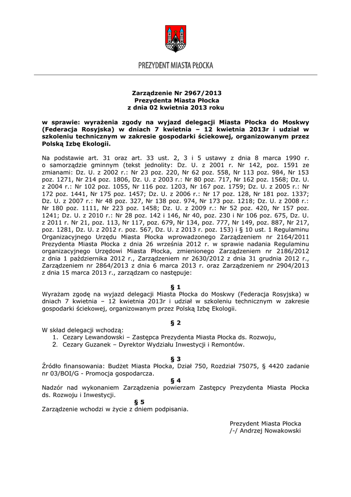 Zarządzenie Nr 2967/2013 Prezydenta Miasta Płocka z dnia 02 kwietnia 2013 roku w sprawie: wyrażenia zgody na wyjazd delegacji Miasta Płocka do Moskwy (Federacja Rosyjska) w dniach 7 kwietnia – 12 kwietnia 2013r i udział w szkoleniu technicznym w zakresie gospodarki ściekowej, organizowanym przez Polską Izbę Ekologii. Na podstawie art. 31 oraz art. 33 ust. 2, 3 i 5 ustawy z dnia 8 marca 1990 r. o samorządzie gminnym (tekst jednolity: Dz. U. z 2001 r. Nr 142, poz. 1591 ze zmianami: Dz. U. z 2002 r.: Nr 23 poz. 220, Nr 62 poz. 558, Nr 113 poz. 984, Nr 153 poz. 1271, Nr 214 poz. 1806, Dz. U. z 2003 r.: Nr 80 poz. 717, Nr 162 poz. 1568; Dz. U. z 2004 r.: Nr 102 poz. 1055, Nr 116 poz. 1203, Nr 167 poz. 1759; Dz. U. z 2005 r.: Nr 172 poz. 1441, Nr 175 poz. 1457; Dz. U. z 2006 r.: Nr 17 poz. 128, Nr 181 poz. 1337; Dz. U. z 2007 r.: Nr 48 poz. 327, Nr 138 poz. 974, Nr 173 poz. 1218; Dz. U. z 2008 r.: Nr 180 poz. 1111, Nr 223 poz. 1458; Dz. U. z 2009 r.: Nr 52 poz. 420, Nr 157 poz. 1241; Dz. U. z 2010 r.: Nr 28 poz. 142 i 146, Nr 40, poz. 230 i Nr 106 poz. 675, Dz. U. z 2011 r. Nr 21, poz. 113, Nr 117, poz. 679, Nr 134, poz. 777, Nr 149, poz. 887, Nr 217, poz. 1281, Dz. U. z 2012 r. poz. 567, Dz. U. z 2013 r. poz. 153) i § 10 ust. 1 Regulaminu Organizacyjnego Urzędu Miasta Płocka wprowadzonego Zarządzeniem nr 2164/2011 Prezydenta Miasta Płocka z dnia 26 września 2012 r. w sprawie nadania Regulaminu organizacyjnego Urzędowi Miasta Płocka, zmienionego Zarządzeniem nr 2186/2012 z dnia 1 października 2012 r., Zarządzeniem nr 2630/2012 z dnia 31 grudnia 2012 r., Zarządzeniem nr 2864/2013 z dnia 6 marca 2013 r. oraz Zarządzeniem nr 2904/2013 z dnia 15 marca 2013 r., zarządzam co następuje: §1 Wyrażam zgodę na wyjazd delegacji Miasta Płocka do Moskwy (Federacja Rosyjska) w dniach 7 kwietnia – 12 kwietnia 2013r i udział w szkoleniu technicznym w zakresie gospodarki ściekowej, organizowanym przez Polską Izbę Ekologii. §2 W skład delegacji wchodzą: 1. Cezary Lewandowski – Zastępca Prezydenta Miasta Płocka ds. Rozwoju, 2. Cezary Guzanek – Dyrektor Wydziału Inwestycji i Remontów. §3 Źródło finansowania: Budżet Miasta Płocka, Dział 750, Rozdział 75075, § 4420 zadanie nr 03/BOI/G - Promocja gospodarcza. §4 Nadzór nad wykonaniem Zarządzenia powierzam Zastępcy Prezydenta Miasta Płocka ds. Rozwoju i Inwestycji. §5 Zarządzenie wchodzi w życie z dniem podpisania. Prezydent Miasta Płocka /-/ Andrzej Nowakowski