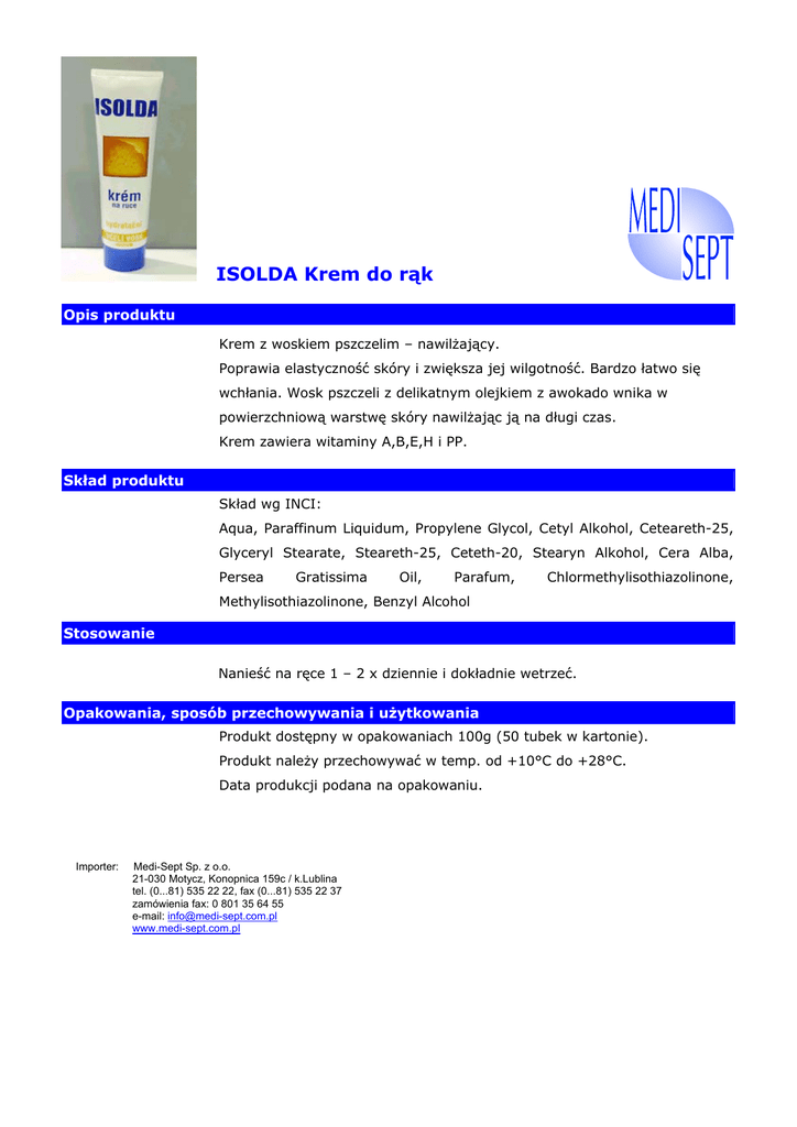 ISOLDA Krem do rąk Opis produktu Krem z woskiem pszczelim – nawilżający. Poprawia elastyczność skóry i zwiększa jej wilgotność. Bardzo łatwo się wchłania. Wosk pszczeli z delikatnym olejkiem z awokado wnika w powierzchniową warstwę skóry nawilżając ją na długi czas. Krem zawiera witaminy A,B,E,H i PP. Skład produktu Skład wg INCI: Aqua, Paraffinum Liquidum, Propylene Glycol, Cetyl Alkohol, Ceteareth-25, Glyceryl Stearate, Steareth-25, Ceteth-20, Stearyn Alkohol, Cera Alba, Persea Gratissima Oil, Parafum, Chlormethylisothiazolinone, Methylisothiazolinone, Benzyl Alcohol Stosowanie Nanieść na ręce 1 – 2 x dziennie i dokładnie wetrzeć. Opakowania, sposób przechowywania i użytkowania Produkt dostępny w opakowaniach 100g (50 tubek w kartonie). Produkt należy przechowywać w temp. od +10°C do +28°C. Data produkcji podana na opakowaniu. Importer: Medi-Sept Sp. z o.o. 21-030 Motycz, Konopnica 159c / k.Lublina tel. (0...81) 535 22 22, fax (0...81) 535 22 37 zamówienia fax: 0 801 35 64 55 e-mail: [email protected] www.medi-sept.com.pl