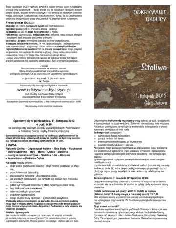 Trasy wycieczek ODKRYWANIE OKOLICY raczej omijają szlaki turystyczne, unikają dróg asfaltowych – lepiej chodzi się po ścieŜkach i drogach leśnych lub po łąkach, a nawet torem kolejowym – nie stronią od rozległych widoków, miejsc urokliwych i ciekawostek krajoznawczych. Bywa, Ŝe dla urozmaicenia lub skrótu droga wiedzie przez chaszcze lub na przykład torem kolejowym. Trasa piesza Stoliwo: długość: ok. 13 km, najwyŜszy punkt: 582 m (Piaskowiec), najniŜszy punkt: 424 m. (Piekielna Dolina - parking), podejścia: ok. 280 m, zejść tyle samo (start = meta), roślinność: obumierająca, chaszczowanie: znikome, trasa wiedzie drogami i ścieŜkami, będą znaczne ale krótkie stromizny, pora roku i pogoda: wycieczka odbędzie się bez względu na nie, wskazane posiadanie prowiantu (w tym zapasu napojów) i dobrego humoru oraz odpowiedniego i wygodnego ubioru, zwłaszcza porządnych butów, najlepiej takŜe butów zapasowych na zmianę po wędrówce; mogą przydać się parasole, coś ciepłego do ubrania na głowę i plecy (wskazane czapki i rękawiczki);, śnieg o tej porze roku nie powinien nikogo dziwić. Uwaga! Dokumentów granicznych zabierać ze sobą nie trzeba, tym razem granicy państwowej nie będziemy przekraczać. Taki przynajmniej jest plan... Uwaga! Ubezpieczenie uczestników we własnym zakresie. Osoby do lat szesnastu mogą brać udział w wycieczce pod opieką dorosłych, lub po wcześniejszym uzgodnieniu z prowadzącymi. organizator wędrówki i prowadzenie: Jan Zasępa zapraszamy do naszego uroczyska w Internecie: www.odkrywanie.bystrzyca.pl (tam między innymi opis trasy z mapką oraz wspomnienia z poprzednich wycieczek) Szczegółowa zapowiedź tej wycieczki jest tu: http://odkrywanie.bystrzyca.pl/20131111 Na pierwszej stronie: anatomia piaskowca. Spotkamy się w poniedziałek, 11. listopada 2013 o godz. 9:30 na parkingu przy dawnym ośrodku wypoczynkowym 'Pod Pawiami' w Piekielnej Dolinie między Polanicą i Szczytną. Samochody proszę oszczędnie ustawić na parkingu z płyt betonowych po prawej stronie drogi, kilkadziesiąt metrów za mostem na Bystrzycy Dusznickiej (uwaga: na moście obowiązuj ograniczenie do 15 ton!). TRASA: Piekielna Dolina – Odpoczynek Heleny – Orle Skały – Piaskowiec – prawie Szczytnik – staw – Borek – Lipnik – Bukówka – dawny rezerwat modrzewi – Piekielna Góra – Garncarz – kamieniołom – Piekielna Dolina Na trasie między innymi: • skąd widoki podziwiano dawniej i skąd moŜna podziwiać je obecnie,, • przechylony stół biesiadny, • piaskowcowa kalwaria i ukrzyzowana skała, • jak wietrzeje piaskowiec i jak rozpada się stoliwo czyli Piekiełko w miniaturze, • gdzie był 'rezerwat modrzewi' i gdzie modrzewie rosną teraz, • lasy niekoniecznie świerkowe, • tajemnicze słupki graniczne, • widokowy kamieniołom, • drogi, słupki i mury oporowe – z pewnością zabytkowe. Wycieczkę zakończymy dopiero po zachodzie Słońca, czyli około godziny 16:00 czyli w miejscu startu. Pogoda i nasza skłonność do długich popasów mogą istotnie wpłynąć na zmianę tej godziny. Na biesiadę z mety udajemy się własnymi pojazdami. Biesiada i śpiewogranie Jak co roku od lat kilku, po wycieczce zapraszamy do wnętrza schroniska na biesiadę połączoną ze śpiewograniem. Tym razem skorzystamy z gościny ‘Agroturystyki Bobrowniki’. Miejsca powinno wystarczyć – stylowa sala jest duŜa. Odpowiednie instrumenty muzyczne proszę zabrać ze sobą i pozostawić w samochodach na czas wędrówki. Śpiewniki równieŜ będą mile widziane. Repertuar patriotyczno-turystyczny z moŜliwością wzbogacenia o utwory wpisujące się w jeszcze inne nurty. Jadłospis jest następujący: • danie ciepłe: bigos z chlebkiem, • gorąca herbata lub kawa, • ewentualne dokładki bigosu (o ile zostanie), • dolewki herbaty lub kawy – do woli. Aby posiłki mogły zostać przygotowane w odpowiedniej ilości, konieczne jest wcześniejsze zgłoszenie chęci udziału w wycieczce i śpiewograniu (udział w samej wycieczce jest oczywiście bezpłatny i nie wymaga zgłaszania). Sposób zgłaszania: wyłącznie pocztą elektroniczną na adres [email protected] z podaniem ilości uczestników w podziale na małych (rozumie się, Ŝe mały to dziecko do lat 12, które zje porcję bigosu mniejszą o połowę) i duŜych (duŜy zje bigosu porcję zwykłą) i ze wskazaniem czy reflektuje się na grzańca. Termin zgłoszeń: 7. listopada 2013 godzina 22:00. Opłaty biesiadne proszę uiszczać u skarbnika na miejscu tuŜ po starcie wycieczki, ale nie w kościele. W zamian za opłatę będą wydawane talony biesiadne. Opłata podstawowa od osoby: 20 PLN. Opłata za małego (dziecko do lat 12, korzystające z mniejszej porcji): 15 PLN. Mile widziane własne wypieki i inne specjały urozmaicające jadłospis, nie wymagające odgrzewania. Za dodatkową opłatą bufet serwuje inne napoje. Skąd nazwa wycieczki? Cała trasa wędrówki wieść będzie po Górach Stołowych, które – jak wiadomo – zbudowane są z piaskowcowego stoliwa. Na trasie będziemy doświadczać skrajnych oblicz stoliwa Piaskowca, Szczytnika i Piekielnej Góry. Ta skrajność jest przenośna i dosłowna. Biesiadne skojarzenia są równieŜ słuszne. Spotkamy się w poniedziałek, 11. listopada 2013 o godz. 9:30 na parkingu przy dawnym ośrodku wypoczynkowym 'Pod Pawiami' w Piekielnej Dolinie między Polanicą i Szczytną. Samochody proszę oszczędnie ustawić na parkingu z płyt betonowych po prawej stronie drogi, kilkadziesiąt metrów za mostem na Bystrzycy Dusznickiej (uwaga: na moście obowiązuj ograniczenie do 15 ton!). TRASA: Piekielna Dolina – Odpoczynek Heleny – Orle Skały – Piaskowiec – prawie Szczytnik – staw – Borek – Lipnik – Bukówka – dawny rezerwat modrzewi – Piekielna Góra – Garncarz – kamieniołom – Piekielna Dolina Na trasie między innymi: • skąd widoki podziwiano dawniej i skąd moŜna p