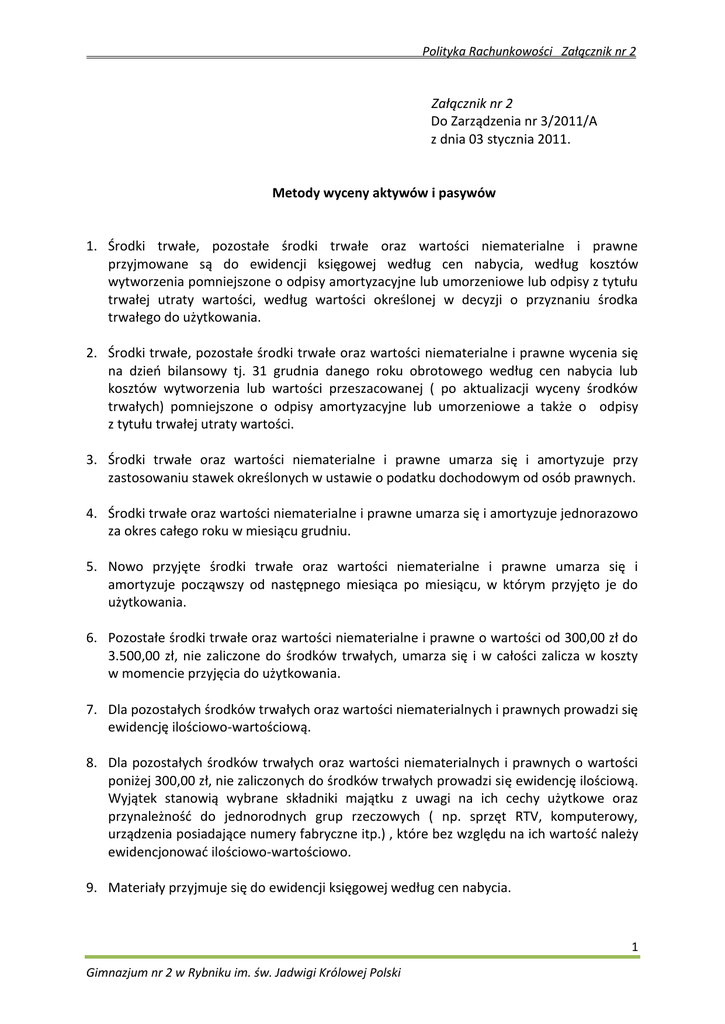 Polityka Rachunkowości Załącznik nr 2 Załącznik nr 2 Do Zarządzenia nr 3/2011/A z dnia 03 stycznia 2011. Metody wyceny aktywów i pasywów 1. Środki trwałe, pozostałe środki trwałe oraz wartości niematerialne i prawne przyjmowane są do ewidencji księgowej według cen nabycia, według kosztów wytworzenia pomniejszone o odpisy amortyzacyjne lub umorzeniowe lub odpisy z tytułu trwałej utraty wartości, według wartości określonej w decyzji o przyznaniu środka trwałego do użytkowania. 2. Środki trwałe, pozostałe środki trwałe oraz wartości niematerialne i prawne wycenia się na dzieo bilansowy tj. 31 grudnia danego roku obrotowego według cen nabycia lub kosztów wytworzenia lub wartości przeszacowanej ( po aktualizacji wyceny środków trwałych) pomniejszone o odpisy amortyzacyjne lub umorzeniowe a także o odpisy z tytułu trwałej utraty wartości. 3. Środki trwałe oraz wartości niematerialne i prawne umarza się i amortyzuje przy zastosowaniu stawek określonych w ustawie o podatku dochodowym od osób prawnych. 4. Środki trwałe oraz wartości niematerialne i prawne umarza się i amortyzuje jednorazowo za okres całego roku w miesiącu grudniu. 5. Nowo przyjęte środki trwałe oraz wartości niematerialne i prawne umarza się i amortyzuje począwszy od następnego miesiąca po miesiącu, w którym przyjęto je do użytkowania. 6. Pozostałe środki trwałe oraz wartości niematerialne i prawne o wartości od 300,00 zł do 3.500,00 zł, nie zaliczone do środków trwałych, umarza się i w całości zalicza w koszty w momencie przyjęcia do użytkowania. 7. Dla pozostałych środków trwałych oraz wartości niematerialnych i prawnych prowadzi się ewidencję ilościowo-wartościową. 8. Dla pozostałych środków trwałych oraz wartości niematerialnych i prawnych o wartości poniżej 300,00 zł, nie zaliczonych do środków trwałych prowadzi się ewidencję ilościową. Wyjątek stanowią wybrane składniki majątku z uwagi na ich cechy użytkowe oraz przynależnośd do jednorodnych grup rzeczowych ( np. sprzęt RTV, komputerowy, urządzenia posiadające numery fabryczne itp.) , które bez względu na ich wartośd należy ewidencjonowad ilościowo-wartościowo. 9. Materiały przyjmuje się do ewidencji księgowej według cen nabycia. 1 Gimnazjum nr 2 w Rybniku im. św. Jadwigi Królowej Polski Polityka Rachunkowości Załącznik nr 2 10. W przypadku , gdy ceny zakupu ( nabycia ) jednakowych albo uznanych za jednakowe, ze względu na podobieostwo ich rodzaju i przeznaczenie, są różne, rozchód składników aktywów wycenia się wg zasady „ pierwsze przyszło-pierwsze wyszło” polegającej na wycenie rozchodów według ceny zakupu kolejnych dostaw, poczynając od dostawy nabytej najwcześniej. 11. Przy prowadzeniu ksiąg pomocniczych magazynu stołówki szkolnej przez program komputerowy przyjmuje się następujące zasady: - za prawidłowe uznaje się miesięczne odchylenie wartości magazynu środków żywności w kwocie maksymalnej +/- 0,1 % wartości koocowej magazynu gdzie na koniec miesiąca stosujemy zapisy koryguje wartośd magazynu do wartości na rozliczeniu miesięcznym stanu magazynu stołówki, - za prawidłowe uznaje się maksymalne +/- 0,1% odchylenia wartości magazynu środków żywności podczas inwentaryzacji magazynu stołówki szkolnej na koniec roku budżetowego, gdzie jako prawidłowa przyjmuję się wartośd księgową magazynu. Większe odchylenia stanu magazynu niż przyjęte powyżej wymagają wnikliwej ocenie przez intendenta i konsultacji z księgowością, aby mogły byd przyjęte za właściwe i zaakceptowane przez kierownika jednostki. Odchylenia wartości magazynu środków żywności wynikają z minimalnych pozostałości lub zużyd, które niezbędne są podczas procesu technologicznego obróbki środków żywności podczas przygotowywania posiłków, gdzie program komputerowy nie zawsze pozwala na przyjęcie korekty pobrania mniejszej lub większej ilości towaru z magazynu niż wymagają tego normy zużycia. 12. Odsetki od należności i zobowiązao ujmuje się w księgach rachunkowych w dniu zapłaty lub nie rzadziej niż na koniec półrocza. Odsetki od należności z tytułu odpłatności za posiłki nalicza i rozlicza intendent szkoły. Informację o wysokości należnych odsetek od odpłatności za obiady przekazuje kontrahentom intendent szkoły. Dopuszcza się możliwośd nie naliczania odsetek ustawowych gdy ich wysokośd nie przekracza 5,00 zł. 13. Należności ujmuje się w ewidencji księgowej w kwocie wymagalnej zapłaty. Na dzieo bilansowy należności wycenia się w kwocie wymagalnej zapłaty, z zachowaniem zasady ostrożności. 14. Środki pieniężne ujmuje się w ewidencji księgowej według wartości nominalnej. Na dzieo bilansowy środki pieniężne wycenia się według wartości nominalnej. 15. Zobowiązania z tytułu dostaw towarów i usług , wobec budżetów, z tytułu ubezpieczeo społecznych , wynagrodzeo oraz pozostałe zobowiązania ujmuje się w ewidencji księgowej w kwocie wymagalnej zapłaty. Na dzieo bilansowy zobowiązania wycenia się w kwocie wymagalnej zapłaty. 16. Rozliczenia z tytułu środków na wydatki budżetowe i z tytułu dochodów budżetowych ujmuje się w ewidencji księgowej według wartości księgowej. 2 Gimnazjum nr 2 w Rybniku im. św. Jadwigi Królowej Polski Polityka Rachunkowości Załącznik nr 2 17. Ponoszone koszty ujmowane są na kontach zespołu 4 – „Koszty według rodzajów i ich rozliczenie” z podziałem na §§ wydatków klasyfikacji budżetowej. Na koniec roku obrotowego poniesione koszty przeksięgowane są na konto Wynik finansowy. 18. Przychody, pozostałe koszty operacyjne, straty i zyski nadzwyczajne ujmowane są na kontach zespołu 7- „ Przychody ,dochody i koszty”. Na koniec roku obrotowego salda przeksięgowane są na konto Wynik finansowy. 19. Ustala się następujące zasady prowadzenia ewidencji analitycznej rzeczowych aktyw