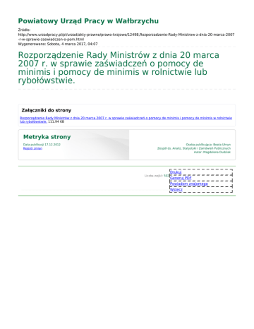 Powiatowy Urząd Pracy w Wałbrzychu Źródło: http://www.urzadpracy.pl/pl/urzad/akty-prawne/prawo-krajowe/12498,Rozporzadzenie-Rady-Ministrow-z-dnia-20-marca-2007 -r-w-sprawie-zaswiadczen-o-pom.html Wygenerowano: Sobota, 4 marca 2017, 04:07 Rozporządzenie Rady Ministrów z dnia 20 marca 2007 r. w sprawie zaświadczeń o pomocy de minimis i pomocy de minimis w rolnictwie lub rybołówstwie. Załączniki do strony Rozporządzenie Rady Ministrów z dnia 20 marca 2007 r. w sprawie zaświadczeń o pomocy de minimis i pomocy de minimis w rolnictwie lub rybołówstwie. 111.94 KB Metryka strony Data publikacji 17.12.2012 Rejestr zmian Osoba publikująca: Beata Uhryn Zespół ds. Analiz, Statystyki i Zamówień Publicznych Autor: Magdalena Dudziak Liczba wejść: 502 Drukuj Generuj PDF Powiadom znajomego Wstecz