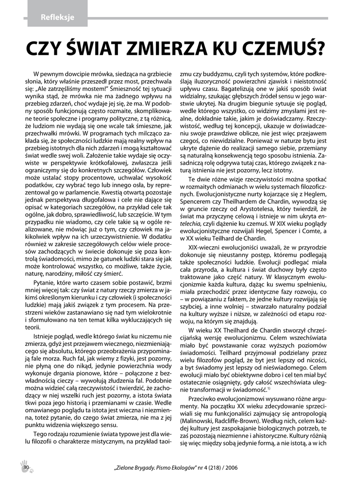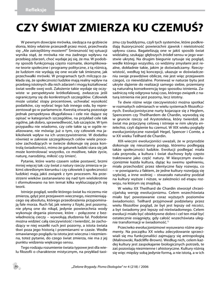 Refleksje CZY ŚWIAT ZMIERZA KU CZEMUŚ? W pewnym dowcipie mrówka, siedząca na grzbiecie słonia, który właśnie przeszedł przez most, przechwala się: „Ale zatrzęśliśmy mostem!” Śmieszność tej sytuacji wynika stąd, że mrówka nie ma żadnego wpływu na przebieg zdarzeń, choć wydaje jej się, że ma. W podobny sposób funkcjonują często rozmaite, skomplikowane teorie społeczne i programy polityczne, z tą różnicą, że ludziom nie wydają się one wcale tak śmieszne, jak przechwałki mrówki. W programach tych milcząco zakłada się, że społeczności ludzkie mają realny wpływ na przebieg istotnych dla nich zdarzeń i mogą kształtować świat wedle swej woli. Założenie takie wydaje się oczywiste w perspektywie krótkofalowej, zwłaszcza jeśli ograniczymy się do konkretnych szczegółów. Człowiek może ustalać stopy procentowe, uchwalać wysokość podatków, czy wybrać tego lub innego osła, by reprezentował go w parlamencie. Kwestią otwartą pozostaje jednak perspektywa długofalowa i cele nie dające się opisać w kategoriach szczegółów, na przykład cele tak ogólne, jak dobro, sprawiedliwość, lub szczęście. W tym przypadku nie wiadomo, czy cele takie są w ogóle realizowane, nie mówiąc już o tym, czy człowiek ma jakikolwiek wpływ na ich urzeczywistnienie. W dodatku również w zakresie szczegółowych celów wiele procesów zachodzących w świecie dokonuje się poza kontrolą świadomości, mimo że gatunek ludzki stara się jak może kontrolować wszystko, co możliwe, także życie, naturę, narodziny, miłość czy śmierć. Pytanie, które warto czasem sobie postawić, brzmi mniej więcej tak: czy świat z natury rzeczy zmierza w jakimś określonym kierunku i czy człowiek (i społeczności ludzkie) mają jakiś związek z tym procesem. Na przestrzeni wieków zastanawiano się nad tym wielokrotnie i sformułowano na ten temat kilka wykluczających się teorii. Istnieje pogląd, wedle którego świat ku niczemu nie zmierza, gdyż jest przejawem wiecznego, niezmieniającego się absolutu, którego przeobrażenia przypominają fale morza. Ruch fal, jak wiemy z fizyki, jest pozorny, nie płyną one do nikąd, jedynie powierzchnia wody wykonuje drgania pionowe, które – połączone z bezwładnością cieczy – wywołują złudzenia fal. Podobnie można widzieć całą rzeczywistość i twierdzić, że zachodzący w niej wszelki ruch jest pozorny, a istota świata tkwi poza jego historią i przemianami w czasie. Wedle omawianego poglądu ta istota jest wieczna i niezmienna, toteż pytanie, do czego świat zmierza, nie ma z jej punktu widzenia większego sensu. Tego rodzaju rozumienie świata typowe jest dla wielu filozofii o charakterze mistycznym, na przykład taoi- 30 zmu czy buddyzmu, czyli tych systemów, które podkreślają iluzoryczność powierzchni zjawisk i nieistotność upływu czasu. Bagatelizują one w jakiś sposób świat widzialny, szukając głębszych źródeł sensu w jego warstwie ukrytej. Na drugim biegunie sytuuje się pogląd, wedle którego wszystko, co widzimy zmysłami jest realne, dokładnie takie, jakim je doświadczamy. Rzeczywistość, według tej koncepcji, ukazuje w doświadczeniu swoje prawdziwe oblicze, nie jest więc przejawem czegoś, co niewidzialne. Ponieważ w naturze bytu jest ukryte dążenie do realizacji samego siebie, przemiany są naturalną konsekwencją tego sposobu istnienia. Zasadniczą rolę odgrywa tutaj czas, którego związek z naturą istnienia nie jest pozorny, lecz istotny. Te dwie różne wizje rzeczywistości można spotkać w rozmaitych odmianach w wielu systemach filozoficznych. Ewolucjonistyczne nurty kojarzące się z Heglem, Spencerem czy Theilhardem de Chardin, wywodzą się w gruncie rzeczy od Arystotelesa, który twierdził, że świat ma przyczynę celową i istnieje w nim ukryta entelechia, czyli dążenie ku czemuś. W XIX wieku poglądy ewolucjonistyczne rozwijali Hegel, Spencer i Comte, a w XX wieku Teilhard de Chardin. XIX-wieczni ewolucjoniści uważali, że w przyrodzie dokonuje się nieustanny postęp, któremu podlegają także społeczności ludzkie. Ewolucji podlegać miała cała przyroda, a kultura i świat duchowy były często traktowane jako część natury. W klasycznym ewolucjonizmie każda kultura, dążąc ku swemu spełnieniu, miała przechodzić przez identyczne fazy rozwoju, co – w powiązaniu z faktem, że jedne kultury rozwijają się szybciej, a inne wolniej – stwarzało naturalny podział na kultury wyższe i niższe, w zależności od etapu rozwoju, na którym się znajdują. W wieku XX Theilhard de Chardin stworzył chrześcijańską wersję ewolucjonizmu. Celem wszechświata miało być powstawanie coraz wyższych poziomów świadomości. Teilhard przyjmował podzielany przez wielu filozofów pogląd, że byt jest lepszy od nicości, a byt świadomy jest lepszy od nieświadomego. Celem ewolucji miało być obiektywne dobro i cel ten miał być ostatecznie osiągnięty, gdy całość wszechświata ulegnie transformacji w świadomość.1) Przeciwko ewolucjonizmowi wysuwano różne argumenty. Na początku XX wieku zdecydowanie sprzeciwiali się mu funkcjonaliści zajmujący się antropologią (Malinowski, Radcliffe-Brown). Według nich, celem każdej kultury jest zaspokajanie biologicznych potrzeb, te zaś pozostają niezmienne i ahistoryczne. Kultury różnią się więc między sobą jedynie formą, a nie istotą, a w ich „Zielone Brygady. Pismo Ekologów” nr 4 (218) / 2006 Refleksje obrębie nie ma żadnych procesów natury uniwersalnej. Według funkcjonalistów nie ma kultur wyższych i niższych, świat ducha do niczego nie zmierza, wyraża tylko swoją różnorodność. Argumentem przeciwko ewolucjonizmowi bywa także wywodząca się z termodynamiki teoria „śmierci cieplnej”. Teoria ta nawiązuje do drugiej zasady termodynamiki, wedle której w każdym układzie zamkniętym spadek entropii (czyli mówiąc ogólnie