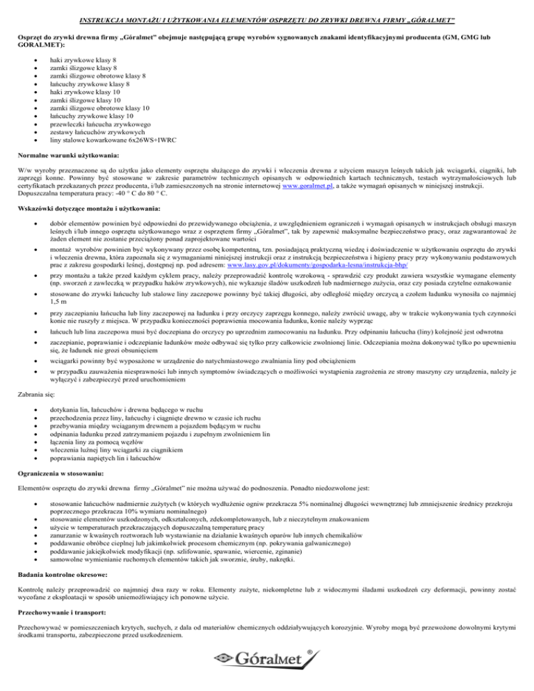 INSTRUKCJA MONTAŻU I UŻYTKOWANIA ELEMENTÓW OSPRZĘTU DO ZRYWKI DREWNA FIRMY „GÓRALMET” Osprzęt do zrywki drewna firmy „Góralmet” obejmuje następującą grupę wyrobów sygnowanych znakami identyfikacyjnymi producenta (GM, GMG lub GORALMET): haki zrywkowe klasy 8 zamki ślizgowe klasy 8 zamki ślizgowe obrotowe klasy 8 łańcuchy zrywkowe klasy 8 haki zrywkowe klasy 10 zamki ślizgowe klasy 10 zamki ślizgowe obrotowe klasy 10 łańcuchy zrywkowe klasy 10 przewleczki łańcucha zrywkowego zestawy łańcuchów zrywkowych liny stalowe kowarkowane 6x26WS+IWRC Normalne warunki użytkowania: W/w wyroby przeznaczone są do użytku jako elementy osprzętu służącego do zrywki i wleczenia drewna z użyciem maszyn leśnych takich jak wciągarki, ciągniki, lub zaprzęgi konne. Powinny być stosowane w zakresie parametrów technicznych opisanych w odpowiednich kartach technicznych, testach wytrzymałościowych lub certyfikatach przekazanych przez producenta, i/lub zamieszczonych na stronie internetowej www.goralmet.pl, a także wymagań opisanych w niniejszej instrukcji. Dopuszczalna temperatura pracy: -40 ° C do 80 ° C. Wskazówki dotyczące montażu i użytkowania: dobór elementów powinien być odpowiedni do przewidywanego obciążenia, z uwzględnieniem ograniczeń i wymagań opisanych w instrukcjach obsługi maszyn leśnych i/lub innego osprzętu użytkowanego wraz z osprzętem firmy „Góralmet”, tak by zapewnić maksymalne bezpieczeństwo pracy, oraz zagwarantować że żaden element nie zostanie przeciążony ponad zaprojektowane wartości montaż wyrobów powinien być wykonywany przez osobę kompetentną, tzn. posiadającą praktyczną wiedzę i doświadczenie w użytkowaniu osprzętu do zrywki i wleczenia drewna, która zapoznała się z wymaganiami niniejszej instrukcji oraz z instrukcją bezpieczeństwa i higieny pracy przy wykonywaniu podstawowych prac z zakresu gospodarki leśnej, dostępnej np. pod adresem: www.lasy.gov.pl/dokumenty/gospodarka-lesna/instrukcja-bhp/ przy montażu a także przed każdym cyklem pracy, należy przeprowadzić kontrolę wzrokową - sprawdzić czy produkt zawiera wszystkie wymagane elementy (np. sworzeń z zawleczką w przypadku haków zrywkowych), nie wykazuje śladów uszkodzeń lub nadmiernego zużycia, oraz czy posiada czytelne oznakowanie stosowane do zrywki łańcuchy lub stalowe liny zaczepowe powinny być takiej długości, aby odległość między orczycą a czołem ładunku wynosiła co najmniej 1,5 m przy zaczepianiu łańcucha lub liny zaczepowej na ładunku i przy orczycy zaprzęgu konnego, należy zwrócić uwagę, aby w trakcie wykonywania tych czynności konie nie ruszyły z miejsca. W przypadku konieczności poprawienia mocowania ładunku, konie należy wyprząc łańcuch lub lina zaczepowa musi być doczepiana do orczycy po uprzednim zamocowaniu na ładunku. Przy odpinaniu łańcucha (liny) kolejność jest odwrotna zaczepianie, poprawianie i odczepianie ładunków może odbywać się tylko przy całkowicie zwolnionej linie. Odczepiania można dokonywać tylko po upewnieniu się, że ładunek nie grozi obsunięciem wciągarki powinny być wyposażone w urządzenie do natychmiastowego zwalniania liny pod obciążeniem w przypadku zauważenia niesprawności lub innych symptomów świadczących o możliwości wystąpienia zagrożenia ze strony maszyny czy urządzenia, należy je wyłączyć i zabezpieczyć przed uruchomieniem Zabrania się: dotykania lin, łańcuchów i drewna będącego w ruchu przechodzenia przez liny, łańcuchy i ciągnięte drewno w czasie ich ruchu przebywania między wciąganym drewnem a pojazdem będącym w ruchu odpinania ładunku przed zatrzymaniem pojazdu i zupełnym zwolnieniem lin łączenia liny za pomocą węzłów wleczenia luźnej liny wciągarki za ciągnikiem poprawiania napiętych lin i łańcuchów Ograniczenia w stosowaniu: Elementów osprzętu do zrywki drewna firmy „Góralmet” nie można używać do podnoszenia. Ponadto niedozwolone jest: stosowanie łańcuchów nadmiernie zużytych (w których wydłużenie ogniw przekracza 5% nominalnej długości wewnętrznej lub zmniejszenie średnicy przekroju poprzecznego przekracza 10% wymiaru nominalnego) stosowanie elementów uszkodzonych, odkształconych, zdekompletowanych, lub z nieczytelnym znakowaniem użycie w temperaturach przekraczających dopuszczalną temperaturę pracy zanurzanie w kwaśnych roztworach lub wystawianie na działanie kwaśnych oparów lub innych chemikaliów poddawanie obróbce cieplnej lub jakimkolwiek procesom chemicznym (np. pokrywania galwanicznego) poddawanie jakiejkolwiek modyfikacji (np. szlifowanie, spawanie, wiercenie, zginanie) samowolne wymienianie ruchomych elementów takich jak sworznie, śruby, nakrętki. Badania kontrolne okresowe: Kontrolę należy przeprowadzić co najmniej dwa razy w roku. Elementy zużyte, niekompletne lub z widocznymi śladami uszkodzeń czy deformacji, powinny zostać wycofane z eksploatacji w sposób uniemożliwiający ich ponowne użycie. Przechowywanie i transport: Przechowywać w pomieszczeniach krytych, suchych, z dala od materiałów chemicznych oddziaływujących korozyjnie. Wyroby mogą być przewożone dowolnymi krytymi środkami transportu, zabezpieczone przed uszkodzeniem.