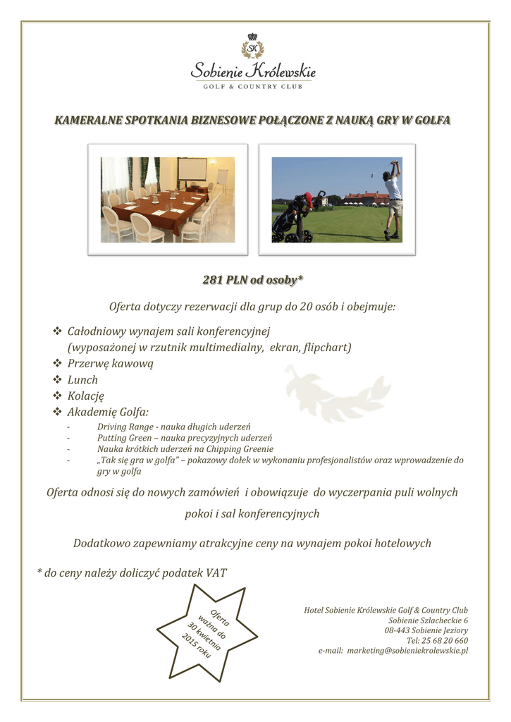 KAMERALNE SPOTKANIA BIZNESOWE POŁĄCZONE Z NAUKĄ GRY W GOLFA 281 PLN od osoby* Oferta dotyczy rezerwacji dla grup do 20 osób i obejmuje: Całodniowy wynajem sali konferencyjnej (wyposażonej w rzutnik multimedialny, ekran, flipchart) Przerwę kawową Lunch Kolację Akademię Golfa: - Driving Range - nauka długich uderzeń Putting Green – nauka precyzyjnych uderzeń Nauka krótkich uderzeń na Chipping Greenie „Tak się gra w golfa” – pokazowy dołek w wykonaniu profesjonalistów oraz wprowadzenie do gry w golfa Oferta odnosi się do nowych zamówień i obowiązuje do wyczerpania puli wolnych pokoi i sal konferencyjnych Dodatkowo zapewniamy atrakcyjne ceny na wynajem pokoi hotelowych * do ceny należy doliczyć podatek VAT Hotel Sobienie Królewskie Golf & Country Club Sobienie Szlacheckie 6 08-443 Sobienie Jeziory Tel: 25 68 20 660 e-mail: [email protected]