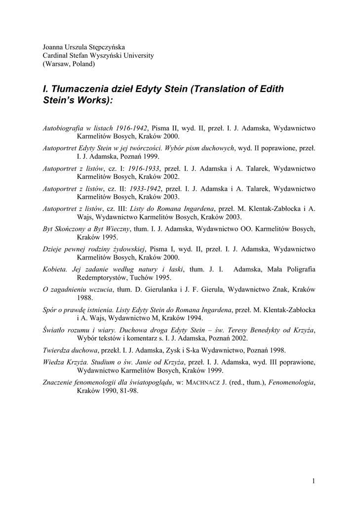 I. Tłumaczenia dzieł Edyty Stein (Translation of