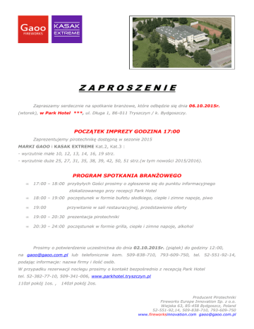 ZAPROSZENIE Zapraszamy serdecznie na spotkanie branżowe, które odbędzie się dnia 06.10.2015r. (wtorek), w Park Hotel ***, ul. Długa 1, 86-011 Tryszczyn / k. Bydgoszczy. POCZĄTEK IMPREZY GODZINA 17:00 Zaprezentujemy pirotechnikę dostępną w sezonie 2015 MARKI GAOO i KASAK EXTREME Kat.2, Kat.3 : - wyrzutnie małe 10, 12, 13, 14, 16, 19 strz. - wyrzutnie duże 25, 27, 31, 35, 38, 39, 42, 50, 51 strz.(w tym nowości 2015/2016). PROGRAM SPOTKANIA BRANŻOWEGO • 17:00 – 18:00 przybyłych Gości prosimy o zgłoszenie się do punktu informacyjnego zlokalizowanego przy recepcji Park Hotel • 18:00 – 19:00 poczęstunek w formie bufetu słodkiego, ciepłe i zimne napoje, piwo • 19:00 • 19:00 – 20:30 prezentacja pirotechniki • 20:30 – 24:00 poczęstunek w formie grilla, ciepłe i zimne napoje, alkohol przywitanie w sali restauracyjnej, przedstawienie oferty Prosimy o potwierdzenie uczestnictwa do dnia 02.10.2015r. (piątek) do godziny 12:00, na [email protected] lub telefonicznie kom. 509-838-710, 793-609-750, tel. 52-551-92-14, podając informacje: nazwa firmy i ilość osób. W przypadku rezerwacji noclegu prosimy o kontakt bezpośrednio z recepcją Park Hotel tel. 52-382-77-10, 509-341-006, www.parkhotel.tryszczyn.pl 110zł pokój 1os. , 140zł pokój 2os. Producent Pirotechniki Fireworks Europe Innovation Sp. z o.o. Wiejska 63, 85-458 Bydgoszcz, Poland 52-551-92,14, 509-838-710, 793-609-750 www.fireworksinnovation.com [email protected]