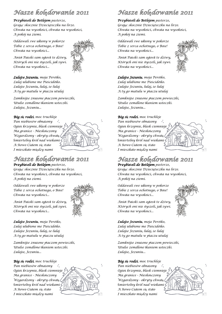 Przybieżeli Przybie eli do Betlejem pasterze, Przybieżeli Przybie eli do do Betlejem pasterze, Grając skocznie Dzieciąteczku na lirze. Grając skocznie Dzieciąteczku na lirze. Chwała na wysokości, chwała na wysokości, Chwała na wysokości, chwała na wysokości, A pokój na ziemi. A pokój na ziemi. Oddawali swe ukłony w pokorze Oddawali swe ukłony w pokorze Tobie z serca ochotnego, o Boże! Tobie z serca ochotnego, o Boże! Chwała na wysokości... Chwała na wysokości... Anioł Pański sam ogłosił te dziwy, Anioł Pański sam ogłosił te dziwy, Których oni nie słyszeli, jak żywi. Których oni nie słyszeli, jak żywi. Chwała na wysokości... Chwała na wysokości... Lulajże Lulaj e Jezuniu, Jezuniu moja Perełko, Lulajże Lulaj e Jezuniu, Jezuniu moja Perełko, Lulaj ulubione me Pieścidełko. Lulaj ulubione me Pieścidełko. Lulajże Jezuniu, lulaj, że lulaj Lulajże Jezuniu, lulaj, że lulaj A ty go matulu w płaczu utulaj A ty go matulu w płaczu utulaj Zamknijże znużone płaczem powieczki, Zamknijże znużone płaczem powieczki, Utulże zemdlone łkaniem usteczki. Utulże zemdlone łkaniem usteczki. Lulajże, Jezuniu... Lulajże, Jezuniu... Bóg się si rodzi, rodzi moc truchleje Bóg się si rodzi, rodzi moc truchleje Pan niebiosów obnażony Pan niebiosów obnażony Ogień krzepnie, blask ciemnieje Ogień krzepnie, blask ciemnieje Ma granice - Nieskończony Ma granice - Nieskończony Wzgardzony - okryty chwałą Wzgardzony - okryty chwałą Śmiertelny król nad wiekami Śmiertelny król nad wiekami A Słowo Ciałem się stało A Słowo Ciałem się stało I mieszkało między nami I mieszkało między nami Przybie Przybieżeli ie eli do Betlejem pasterze, Przybieżeli Przybie eli do Betlejem Betlejem pasterze, Grając skocznie Dzieciąteczku na lirze. Grając skocznie Dzieciąteczku na lirze. Chwała na wysokości, chwała na wysokości, Chwała na wysokości, chwała na wysokości, A pokój na ziemi. A pokój na ziemi. Oddawali swe ukłony w pokorze Oddawali swe ukłony w pokorze Tobie z serca ochotnego, o Boże! Tobie z serca ochotnego, o Boże! Chwała na wysokości... Chwała na wysokości... Anioł Pański sam ogłosił te dziwy, Anioł Pański sam ogłosił te dziwy, Których oni nie słyszeli, jak żywi. Których oni nie słyszeli, jak żywi. Chwała na wysokości... Chwała na wysokości... Lulajże Lulaj e Jezuniu, Jezuniu moja Perełko, Lulajże Lulaj e Jezuniu, Jezuniu moja Perełko, Lulaj ulubione me Pieścidełko. Lulaj ulubione me Pieścidełko. Lulajże Jezuniu, lulaj, że lulaj Lulajże Jezuniu, lulaj, że lulaj A ty go matulu w płaczu utulaj A ty go matulu w płaczu utulaj Zamknijże znużone płaczem powieczki, Zamknijże znużone płaczem powieczki, Utulże zemdlone łkaniem usteczki. Utulże zemdlone łkaniem usteczki. Lulajże, Jezuniu... Lulajże, Jezuniu... Bóg się si rodzi, rodzi moc truchleje Bóg się si rodzi, rodzi moc truchleje Pan niebiosów obnażony Pan niebiosów obnażony Ogień krzepnie, blask ciemnieje Ogień krzepnie, blask ciemnieje Ma granice - Nieskończony Ma granice - Nieskończony Wzgardzony - okryty chwałą Wzgardzony - okryty chwałą Śmiertelny król nad wiekami Śmiertelny król nad wiekami A Słowo Ciałem się stało A Słowo Ciałem się stało I mieszkało między nami I mieszkało między nami Wśr ród nocnej ciszy głos się rozchodzi: Wstańcie, pasterze, Bóg się wam rodzi! Wstańcie, pasterze, Bóg się wam rodzi! Czym prędzej się wybierajcie, do Betlejem pospieszajcie Czym prędzej się wybierajcie, do Betlejem pospieszajcie Przywitać Pana. Przywitać Pana. Poszli, znaleźli Dzieciątko w żłobie Poszli, znaleźli Dzieciątko w żłobie Z wszystkimi znaki danymi sobie. Z wszystkimi znaki danymi sobie. Jako Bogu cześć Mu dali, a witając zawołali Jako Bogu cześć Mu dali, a witając zawołali Z wielkiej radości. Z wielkiej radości. Pójdźmy Pójd my wszyscy do stajenki, stajenki do Jezusa i Panienki Pójdźmy Pójd my wszyscy do stajenki, stajenki do Jezusa i Panienki Powitajmy Maleńkiego i Maryję Matkę Jego Powitajmy Maleńkiego i Maryję Matkę Jego Powitajmy Maleńkiego i Maryję Matkę Jego Powitajmy Maleńkiego i Maryję Matkę Jego Witaj, Jezu ukochany, od Patriarchów czekany Witaj, Jezu ukochany, od Patriarchów czekany Witaj, Dzieciąteczko w żłobie, wyznajemy Boga w Tobie Witaj, Dzieciąteczko w żłobie, wyznajemy Boga w Tobie Coś się narodził tej nocy, byś nas wyrwał z czarta mocy Coś się narodził tej nocy, byś nas wyrwał z czarta mocy Coś się narodził tej nocy, byś nas wyrwał z czarta mocy Coś się narodził tej nocy, byś nas wyrwał z czarta mocy Że Panna czysta, że Panna czysta porodziła Syna Chrystus się rodzi nas oswobodzi Anieli grają Króle witają Pasterze śpiewają bydlęta klękają Cuda, cuda ogłaszają Maryja Panna, Maryja Panna Dzieciątko piastuje I Józef święty i Józef święty On ją pielęgnuje Dzisiaj w Betlejem, Betlejem dzisiaj w Betlejem wesoła nowina Że Panna czysta, że Panna czysta porodziła Syna Chrystus się rodzi nas oswobodzi Anieli grają Króle witają Pasterze śpiewają bydlęta klękają Cuda, cuda ogłaszają Maryja Panna, Maryja Panna Dzieciątko piastuje I Józef święty i Józef święty On ją pielęgnuje Chrystus się rodzi… Chrystus się rodzi… Wśr ród nocnej ciszy głos się rozchodzi: Wśr ród nocnej ciszy głos się rozchodzi: Wstańcie, pasterze, Bóg się wam rodzi! Wstańcie, pasterze, Bóg się wam rodzi! Czym prędzej się wybierajcie, do Betlejem pospieszajcie Czym prędzej się wybierajcie, do Betlejem pospieszajcie Przywitać Pana. Przywitać Pana. Poszli, znaleźli Dzieciątko w żłobie Poszli, znaleźli Dzieciątko w żłobie Z wszystkimi znaki danymi sobie. Z wszystkimi znaki danymi sobie. Jako Bogu cześć Mu dali, a witając zawołali Jako Bogu cześć Mu dali, a witając zawołali Z wielkiej radości. Z wielkiej radości. Pójdźmy Pójd my wszyscy do stajenki, stajenki 