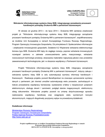 UNIA EUROPEJSKA Europejski Fundusz Rozwoju Regionalnego Wdrożenie informatycznego systemu klasy B2B, integrującego zarzadzanie procesami handlowymi pomiędzy Drukarnia MW a partnerami biznesowymi. W okresie od grudnia 2013 r. do lipca 2014 r. Drukarnia MW zamierza zrealizować projekt pt. "Wdrożenie informatycznego systemu klasy B2B, integrującego zarządzanie procesami handlowymi pomiędzy Drukarnią MW a partnerami biznesowymi", współfinansowany ze środków Unii Europejskiej w ramach Europejskiego Funduszu Rozwoju Regionalnego, Program Operacyjny Innowacyjna Gospodarka, Oś priorytetowa 8: Społeczeństwo informacyjne - zwiększenie innowacyjności gospodarki, Działanie 8.2 Wspieranie wdrażania elektronicznego biznesu typu B2B. Drukarnia MW dąży do ciągłego rozwoju, poprzez wdrażanie innowacyjnych rozwiązań zarówno w zakresie unowocześniania parku maszynowego, wdrażania nowoczesnych technologii produkcji, stosowania materiałów najwyższej jakości oraz produktów zaawansowanych technologicznie, jak i w obszarze współpracy z Partnerami biznesowymi. Projekt "Wdrożenie informatycznego systemu klasy B2B, integrujący zarządzanie procesami handlowymi pomiędzy Drukarnią MW a partnerami biznesowymi", dotyczy zakupu i wdrożenia systemu klasy B2B w celu automatyzacji wymiany informacji handlowych i finansowych. Realizacja projektu pozwoli Beneficjentowi na znaczące uproszczenie wymiany danych z partnerami, jak również umożliwi automatyzację wielu procesów, zachodzących w trakcie prowadzenia współpracy biznesowej: wystawianie e-faktur z bezpiecznym podpisem elektronicznym, obsługę zleceń / zamówień, podgląd stanów magazynowych, elektroniczny obieg dokumentów. Wdrożenie projektu pozwoli na zmianę dotychczasowego sposobu realizowania współpracy handlowej oraz osiągnięcie wielu wymiernych ekonomicznych, mających długotrwały pozytywny wpływ na prowadzoną działalność. Dodatkowe informacje: Ministerstwo Rozwoju Regionalnego Program Operacyjny Innowacyjna Gospodarka Polska Agencja Rozwoju Przedsiębiorczości http://www.web.gov.pl Projekt współfinansowany ze środków Europejskiego Funduszu Rozwoju Regionalnego w ramach Programu Operacyjnego Innowacyjna Gospodarka. DOTACJE NA INNOWACJE. Inwestujemy w waszą przyszłość. korzyści