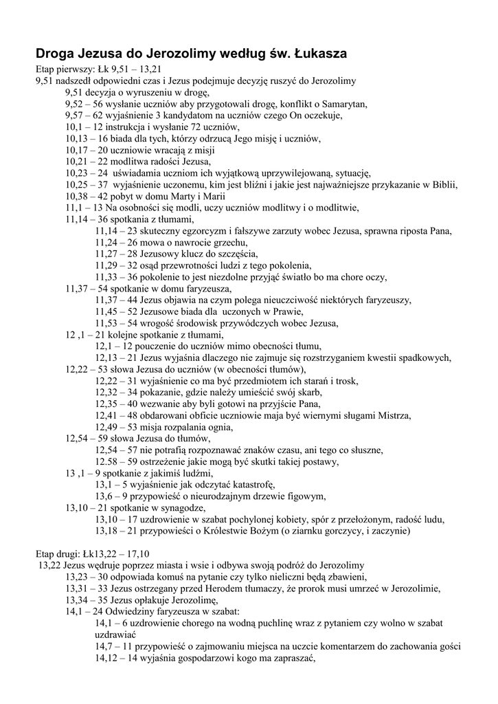 Droga Jezusa do Jerozolimy według św. Łukasza Etap pierwszy: Łk 9,51 – 13,21 9,51 nadszedł odpowiedni czas i Jezus podejmuje decyzję ruszyć do Jerozolimy 9,51 decyzja o wyruszeniu w drogę, 9,52 – 56 wysłanie uczniów aby przygotowali drogę, konflikt o Samarytan, 9,57 – 62 wyjaśnienie 3 kandydatom na uczniów czego On oczekuje, 10,1 – 12 instrukcja i wysłanie 72 uczniów, 10,13 – 16 biada dla tych, którzy odrzucą Jego misję i uczniów, 10,17 – 20 uczniowie wracają z misji 10,21 – 22 modlitwa radości Jezusa, 10,23 – 24 uświadamia uczniom ich wyjątkową uprzywilejowaną, sytuację, 10,25 – 37 wyjaśnienie uczonemu, kim jest bliźni i jakie jest najważniejsze przykazanie w Biblii, 10,38 – 42 pobyt w domu Marty i Marii 11,1 – 13 Na osobności się modli, uczy uczniów modlitwy i o modlitwie, 11,14 – 36 spotkania z tłumami, 11,14 – 23 skuteczny egzorcyzm i fałszywe zarzuty wobec Jezusa, sprawna riposta Pana, 11,24 – 26 mowa o nawrocie grzechu, 11,27 – 28 Jezusowy klucz do szczęścia, 11,29 – 32 osąd przewrotności ludzi z tego pokolenia, 11,33 – 36 pokolenie to jest niezdolne przyjąć światło bo ma chore oczy, 11,37 – 54 spotkanie w domu faryzeusza, 11,37 – 44 Jezus objawia na czym polega nieuczciwość niektórych faryzeuszy, 11,45 – 52 Jezusowe biada dla uczonych w Prawie, 11,53 – 54 wrogość środowisk przywódczych wobec Jezusa, 12 ,1 – 21 kolejne spotkanie z tłumami, 12,1 – 12 pouczenie do uczniów mimo obecności tłumu, 12,13 – 21 Jezus wyjaśnia dlaczego nie zajmuje się rozstrzyganiem kwestii spadkowych, 12,22 – 53 słowa Jezusa do uczniów (w obecności tłumów), 12,22 – 31 wyjaśnienie co ma być przedmiotem ich starań i trosk, 12,32 – 34 pokazanie, gdzie należy umieścić swój skarb, 12,35 – 40 wezwanie aby byli gotowi na przyjście Pana, 12,41 – 48 obdarowani obficie uczniowie maja być wiernymi sługami Mistrza, 12,49 – 53 misja rozpalania ognia, 12,54 – 59 słowa Jezusa do tłumów, 12,54 – 57 nie potrafią rozpoznawać znaków czasu, ani tego co słuszne, 12.58 – 59 ostrzeżenie jakie mogą być skutki takiej postawy, 13 ,1 – 9 spotkanie z jakimiś ludźmi, 13,1 – 5 wyjaśnienie jak odczytać katastrofę, 13,6 – 9 przypowieść o nieurodzajnym drzewie figowym, 13,10 – 21 spotkanie w synagodze, 13,10 – 17 uzdrowienie w szabat pochylonej kobiety, spór z przełożonym, radość ludu, 13,18 – 21 przypowieści o Królestwie Bożym (o ziarnku gorczycy, i zaczynie) Etap drugi: Łk13,22 – 17,10 13,22 Jezus wędruje poprzez miasta i wsie i odbywa swoją podróż do Jerozolimy 13,23 – 30 odpowiada komuś na pytanie czy tylko nieliczni będą zbawieni, 13,31 – 33 Jezus ostrzegany przed Herodem tłumaczy, że prorok musi umrzeć w Jerozolimie, 13,34 – 35 Jezus opłakuje Jerozolimę, 14,1 – 24 Odwiedziny faryzeusza w szabat: 14,1 – 6 uzdrowienie chorego na wodną puchlinę wraz z pytaniem czy wolno w szabat uzdrawiać 14,7 – 11 przypowieść o zajmowaniu miejsca na uczcie komentarzem do zachowania gości 14,12 – 14 wyjaśnia gospodarzowi kogo ma zapraszać, 14,15 – 24 dyskusja przy stole i przypowieść Jezusa o zaproszonych na ucztę, 14,25 – 35 nauczanie tłumów o tym kto może być Jego uczniem, 15,1 spotkania Jezusa z celnikami i grzesznikami 15,2 reakcja na to „porządnych” w Izraelu, 15,3 – 32 Odpowiedź Jezusa na komentarz: 15,3 – 7 przypowieść o zaginionej owcy, 15,8 – 10 przypowieść o zagubionej drachmie, 15,11 – 32 przypowieść o miłosiernym ojcu i jego marnotrawnych synach, 16,1 – 13 Słowo do uczniów 16,1 – 8 przypowieść o przebiegłym zarządcy, 16,9 – 13 wezwanie aby uczniowie dobrze zarządzali tym co mają, 16,14 reakcja faryzeuszy na słowa Jezusa do uczniów, 16,15 – 31 odpowiedź Jezusa 16,15 oskarża ich, że udają przed ludźmi sprawiedliwych, 16,16 – 17 wyjaśnia im w jakim czasie żyją i mówi o swoim rozumieniu Prawa, 16,18 mówi o nierozerwalności małżeństwa, 16,19 – 31 przypowieść o bogaczu i Łazarzu ostrzeżeniem przed złym korzystaniem z bogactwa 17,1 – 10 słowa do uczniów 17,1 – 2 ostrzeżenie przed zgorszeniem, 17,3 – 4 obowiązek przebaczania, 17,5 – 6 wiara działa w życiu człowieka, 17,7 – 10 pokazanie tożsamości ucznia sługi. Etap trzeci: Łk 17,12 – 19,28 17,11 Zmierzając do Jerozolimy Jezus przechodzi przez pogranicze Samarii i Galilei, 17,12 – 19 spotkanie 10 trędowatych, 17,20 – 21 rozmowa z faryzeuszami, 17,22 – 18,8 Słowa do uczniów: 17,22 – 37 zapowiedź dnia Syna Człowieczego, 18,1 – 8 nauczanie wytrwałej modlitwy, 18,9 – 14 słowo do tych co ufają sobie a innymi gardzą (przypowieść o celniku i faryzeuszu). 18,15 – 17 spotkanie z dziećmi i nauka o przyjęciu KB jak dziecko, 18,18 – 23 spotkanie z bogatym zwierzchnikiem i rozmowa jak osiągnąć życie wieczne, 18,24 – 30 skutki spotkania ze zwierzchnikiem i jego decyzją, 18,24 – 27 słowa Jezusa o wejściu bogatych do KB, 18,28 – 30 pytanie Piotra i odpowiedź Jezusa, 18,31 – 34 słowo do Dwunastu zapowiadające 3 raz mękę i zmartwychwstanie Jezusa, 18,35 – 43 spotkanie pod Jerychem Bartymeusza i uzdrowienie jego ślepoty, 19,1 – 10 spotkane z Zacheuszem w Jerychu, 19,11 – 28 nauczanie o minach po którym Jezus ruszył w ostatni etap już do Jerozolimy