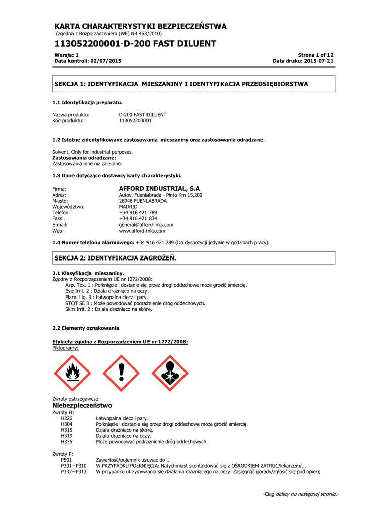 KARTA CHARAKTERYSTYKI BEZPIECZEŃSTWA (zgodna z Rozporządzeniem (WE) NR 453/2010) 113052200001-D-200 FAST DILUENT Wersja: 1 Data kontroli: 02/07/2015 Strona 1 of 12 Data druku: 2015-07-21 SEKCJA 1: IDENTYFIKACJA MIESZANINY I IDENTYFIKACJA PRZEDSIĘBIORSTWA 1.1 Identyfikacja preparatu. Nazwa produktu: Kod produktu: D-200 FAST DILUENT 113052200001 1.2 Istotne zidentyfikowane zastosowania mieszaniny oraz zastosowania odradzane. Solvent. Only for industrial purposes. Zastosowania odradzane: Zastosowania inne niż zalecane. 1.3 Dane dotyczące dostawcy karty charakterystyki. AFFORD INDUSTRIAL, S.A Firma: Adres: Miasto: Województwo: Telefon: Faks: E-mail: Web: Autov. Fuenlabrada - Pinto Km 15,200 28946 FUENLABRADA MADRID +34 916 421 789 +34 916 421 834 [email protected] www.afford-inks.com 1.4 Numer telefonu alarmowego: +34 916 421 789 (Do dyspozycji jedynie w godzinach pracy) SEKCJA 2: IDENTYFIKACJA ZAGROŻEŃ. 2.1 Klasyfikacja mieszaniny. Zgodny z Rozporządzeniem UE nr 1272/2008: Asp. Tox. 1 : Połknięcie i dostanie się przez drogi oddechowe może grozić śmiercią. Eye Irrit. 2 : Działa drażniąco na oczy. Flam. Liq. 3 : Łatwopalna ciecz i pary. STOT SE 3 : Może powodować podrażnienie dróg oddechowych. Skin Irrit. 2 : Działa drażniąco na skórę. 2.2 Elementy oznakowania . . Etykieta zgodna z Rozporządzeniem UE nr 1272/2008: Piktogramy: Zwroty ostrzegawcze: Niebezpieczeństwo Zwroty H: H226 H304 H315 H319 H335 Łatwopalna ciecz i pary. Połknięcie i dostanie się przez drogi oddechowe może grozić śmiercią. Działa drażniąco na skórę. Działa drażniąco na oczy. Może powodować podrażnienie dróg oddechowych. Zwroty P: P501 P301+P310 P337+P313 Zawartość/pojemnik usuwać do ... W PRZYPADKU POŁKNIĘCIA: Natychmiast skontaktować się z OŚRODKIEM ZATRUĆ/lekarzem/... W przypadku utrzymywania się działania drażniącego na oczy: Zasięgnąć porady/zgłosić się pod opiekę -Ciąg dalszy na następnej stronie.- KARTA CHARAKTERYSTYKI BEZPIECZEŃSTWA (zgodna z Rozporządzeniem (WE) NR 453/2010) 113052200001-D-200 FAST DILUENT Wersja: 1 Data kontroli: 02/07/2015 Strona 2 of 12 Data druku: 2015-07-21 lekarza. P370+P378 W przypadku pożaru: Użyć... do gaszenia. P403+P235 Przechowywać w dobrze wentylowanym miejscu. Przechowywać w chłodnym miejscu. P303+P361+P353 W PRZYPADKU KONTATKU ZE SKÓRĄ (lub z włosami): Natychmiast zdjąć całą zanieczyszczoną odzież. Spłukać skórę pod strumieniem wody/prysznicem. P305+P351+P338 W PRZYPADKU DOSTANIA SIĘ DO OCZU: Ostrożnie płukać wodą przez kilka minut. Wyjąć soczewki kontaktowe, jeżeli są i można je łatwo usunąć. Nadal płukać. Uzupełniające wskaźniki niebezpieczeństwa: EUH066 Powtarzające się narażenie może powodować wysuszanie lub pękanie skóry. Produkt przeznaczony wyłącznie do użytku zawodowego. Zawiera: Hidrocarbons, C9, aromatics 2.3 Inne zagrożenia. Podczas normalnego użytkowania i w jego pierwotnej formie, produkt nie wywoluje efektów negatywnych na zdrowie oraz środowisko. SEKCJA 3: SKŁAD/INFORMACJA O SKŁADNIKACH. 3.1 Substancje. Nie Dotyczy. 3.2 Mieszaniny. Substancje stanowiące zagrożenie dla zdrowia lub środowiska zgodnie z Dyrektywą dotyczącą Substancji Niebezpiecznych 67/548/EEC lub Rozporządzeniem (WE) nr 1272/2008, które mają wyznaczone poziomy progowe narażenia w miejscu pracy,klasyfikowane są jako PBT / vPvB lub zawarte są w liście kandyatów: Identyfikatory Nazwa Nr CAS: 763-69-9 Nr WE: 212-112-9 3-ethyl ethoxypropionate Nr Rejestracyjny: 012119463267-34-0001 Nr indeksowy: 649356-00-4 Nr CAS: 64742-95-6 Hidrocarbons, C9, aromatics Nr WE: 265-199-0 Nr Rejestracyjny: 012119455851-35 Nr indeksowy: 601020-00-8 Nr CAS: 71-43-2 [1] benzen Nr WE: 200-753-7 Nr Rejestracyjny: 012119447106-44-XXXX Stężenie >= 50% < 75 % >= 25% < 50 % < 2,5% (*)Klasyfikacja-Rozporządzenie 1272/2008 Granica Klasyfikacja stężenia specyfików Flam. Liq. 3, H226 Asp. Tox. 1, H304 - Eye Irrit. 2, H319 Flam. Liq. 3, H226 - STOT SE 3, H335 Skin Irrit. 2, H315 Asp. Tox. 1, H304 - Carc. 1A, H350 - Eye Irrit. 2, H319 Flam. Liq. 2, H225 - Muta. 1B, H340 STOT RE 1, H372 ** - Skin Irrit. 2, H315 - - - (*) Pełny tekst zwrotów H zostal wyszczególniony w pkt 16 niniejszej Karty charakterystyki bezpieczenstwa. ** Patrz rozporządzenie (WE) nr 1272/2008, załącznik VI, rozdział 1.2. [1] Substancja, na którą naklada sie wartości limitu narażenia środowiska zawodowego (patrz rozdzial 8.1). -Ciąg dalszy na następnej stronie.- KARTA CHARAKTERYSTYKI BEZPIECZEŃSTWA (zgodna z Rozporządzeniem (WE) NR 453/2010) 113052200001-D-200 FAST DILUENT Wersja: 1 Data kontroli: 02/07/2015 Strona 3 of 12 Data druku: 2015-07-21 SEKCJA 4: ŚRODKI PIERWSZEJ POMOCY. 4.1 Opis środków pierwszej pomocy. W przypadku wątpliwości lub w razie utrzymywania sie niepokojących objawów, należy skonsultowac się z lekarzem. Nigdy nie należy podawać niczego doustnie osobom nieprzytomnym. Inhalacja. Umieścić poszkodowanego na świeżym powietrzu, utrzymać w cieple i w stanie spoczynku, jeśli oddycha nieregularnie lub ma bezdech, zastosować sztuczne oddychanie. Nie podawać nic doustnie. Jeśli poszkodowany jest nieprzytomny, ułożyć w odpowiedniej pozycji i wezwać pomoc lekarską. Kontakt z oczami. W przypadku noszenia szkieł kontaktowych, wyjąć je. Przemyć oczy dużą ilością czystej i chłodnej wody, przynajmniej przez 10 minut, kierując wodę w stronę powiek i wezwać pomoc lekarską. Kontakt ze skórą. Zdjąć zanieczyszczone ubranie. Energicznie zmyć skórę wodą z mydłem lub odpowiednim zmywaczem. NIGDY nie używać rozpuszczalników ani rozcieńczaczy. Połknięcie. W razie przypadkowego połknięcia natychmiast wezwać pomoc lekarską. Zapewnić spokój. NIGDY nie wywoływać wymiotów. 4.2 Najważniejsze ostre i opóźnione objawy oraz skutki narażenia. Produkty szkodliwe, długotrwałe narażenie przez drogi oddechowe może powodować skutki znieczulenia i konieczność nat