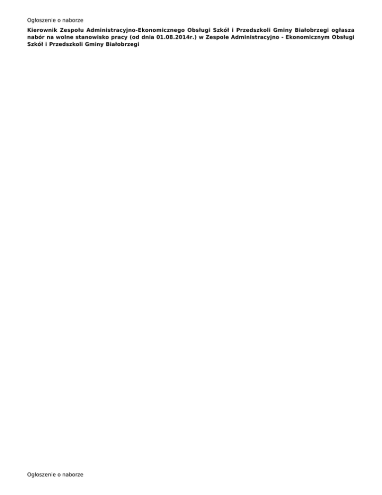 Ogłoszenie o naborze Kierownik Zespołu Administracyjno-Ekonomicznego Obsługi Szkół i Przedszkoli Gminy Białobrzegi ogłasza nabór na wolne stanowisko pracy (od dnia 01.08.2014r.) w Zespole Administracyjno - Ekonomicznym Obsługi Szkół i Przedszkoli Gminy Białobrzegi Ogłoszenie o naborze