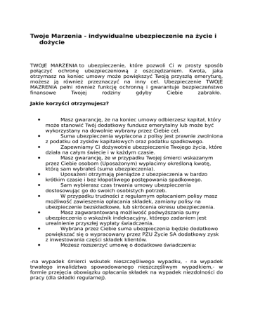 Twoje Marzenia - indywidualne ubezpieczenie na życie i dożycie TWOJE MARZENIA to ubezpieczenie, które pozwoli Ci w prosty sposób połączyć ochronę ubezpieczeniową z oszczędzaniem. Kwota, jaka otrzymasz na koniec umowy może powiększyć Twoją przyszłą emeryturę, możesz ją również przeznaczyć na inny cel. Ubezpieczenie TWOJE MAZRENIA pełni również funkcję ochronną i gwarantuje bezpieczeństwo finansowe Twojej rodziny gdyby Ciebie zabrakło. Jakie korzyści otrzymujesz? Masz gwarancję, że na koniec umowy odbierzesz kapitał, który może stanowić Twój dodatkowy fundusz emerytalny lub może być wykorzystany na dowolnie wybrany przez Ciebie cel. Suma ubezpieczenia wypłacona z polisy jest prawnie zwolniona z podatku od zysków kapitałowych oraz podatku spadkowego. Zapewniamy Ci dożywotnie ubezpieczenie Twojego życia, które działa na całym świecie i w każdym czasie. Masz gwarancję, że w przypadku Twojej śmierci wskazanym przez Ciebie osobom (Uposażonym) wypłacimy określoną kwotę, którą sam wybrałeś (suma ubezpieczenia). Uposażeni otrzymają pieniądze z ubezpieczenia w bardzo krótkim czasie i bez kłopotliwego postępowania spadkowego. Sam wybierasz czas trwania umowy ubezpieczenia dostosowując go do swoich osobistych potrzeb. W przypadku trudności z regularnym opłacaniem polisy masz możliwość zawieszenia opłacania składek, zamiany polisy na ubezpieczenie bezskładkowe, lub skrócenia okresu ubezpieczenia. Masz zagwarantowaną możliwość podwyższania sumy ubezpieczenia o wskaźnik indeksacyjny, którego zadaniem jest urealnienie przyszłej wypłaty świadczenia. Wybrana przez Ciebie suma ubezpieczenia będzie dodatkowo powiększać się o wypracowany przez PZU Życie SA dodatkowy zysk z inwestowania części składek klientów. Możesz rozszerzyć umowę o dodatkowe świadczenia: -na wypadek śmierci wskutek nieszczęśliwego wypadku, - na wypadek trwałego inwalidztwa spowodowanego nieszczęśliwym wypadkiem,- w formie przejęcia obowiązku opłacania składek na wypadek niezdolności do pracy (dla składki regularnej). Ile to kosztuje? Wysokość składki za ubezpieczenie zależy przede wszystkim od wybranej sumy ubezpieczenia, czyli kwoty, którą mają otrzymać wskazani spadkobiercy.