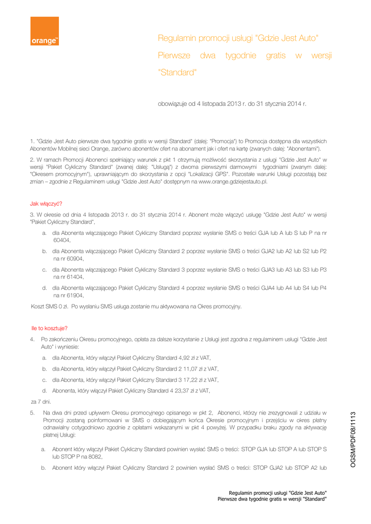 Regulamin promocji usługi "Gdzie Jest Auto" Pierwsze dwa tygodnie gratis w wersji "Standard" obowiązuje od 4 listopada 2013 r. do 31 stycznia 2014 r. 1. "Gdzie Jest Auto pierwsze dwa tygodnie gratis w wersji Standard" (dalej: "Promocja") to Promocja dostępna dla wszystkich Abonentów Mobilnej sieci Orange, zarówno abonentów ofert na abonament jak i ofert na kartę (zwanych dalej: "Abonentami"). 2. W ramach Promocji Abonenci spełniający warunek z pkt 1 otrzymują możliwość skorzystania z usługi "Gdzie Jest Auto" w wersji "Pakiet Cykliczny Standard" (zwanej dalej: "Usługą") z dwoma pierwszymi darmowymi tygodniami (zwanym dalej: "Okresem promocyjnym"), uprawniającym do skorzystania z opcji "Lokalizacji GPS". Pozostałe warunki Usługi pozostają bez zmian – zgodnie z Regulaminem usługi "Gdzie Jest Auto" dostępnym na www.orange.gdziejestauto.pl. Jak włączyć? 3. W okresie od dnia 4 listopada 2013 r. do 31 stycznia 2014 r. Abonent może włączyć usługę "Gdzie Jest Auto" w wersji "Pakiet Cykliczny Standard", a. dla Abonenta włączającego Pakiet Cykliczny Standard poprzez wysłanie SMS o treści GJA lub A lub S lub P na nr 60404, b. dla Abonenta włączającego Pakiet Cykliczny Standard 2 poprzez wysłanie SMS o treści GJA2 lub A2 lub S2 lub P2 na nr 60904, c. dla Abonenta włączającego Pakiet Cykliczny Standard 3 poprzez wysłanie SMS o treści GJA3 lub A3 lub S3 lub P3 na nr 61404, d. dla Abonenta włączającego Pakiet Cykliczny Standard 4 poprzez wysłanie SMS o treści GJA4 lub A4 lub S4 lub P4 na nr 61904, Koszt SMS 0 zł. Po wysłaniu SMS usługa zostanie mu aktywowana na Okres promocyjny. Ile to kosztuje? 4. Po zakończeniu Okresu promocyjnego, opłata za dalsze korzystanie z Usługi jest zgodna z regulaminem usługi "Gdzie Jest Auto" i wyniesie: a. dla Abonenta, który włączył Pakiet Cykliczny Standard 4,92 zł z VAT, b. dla Abonenta, który włączył Pakiet Cykliczny Standard 2 11,07 zł z VAT, c. dla Abonenta, który włączył Pakiet Cykliczny Standard 3 17,22 zł z VAT, d. Abonenta, który włączył Pakiet Cykliczny Standard 4 23,37 zł z VAT, 5. Na dwa dni przed upływem Okresu promocyjnego opisanego w pkt 2, Abonenci, którzy nie zrezygnowali z udziału w Promocji zostaną poinformowani w SMS o dobiegającym końca Okresie promocyjnym i przejściu w okres płatny odnawialny cotygodniowo zgodnie z opłatami wskazanymi w pkt 4 powyżej. W przypadku braku zgody na aktywację płatnej Usługi: a. Abonent który włączył Pakiet Cykliczny Standard powinien wysłać SMS o treści: STOP GJA lub STOP A lub STOP S lub STOP P na 8082, b. Abonent który włączył Pakiet Cykliczny Standard 2 powinien wysłać SMS o treści: STOP GJA2 lub STOP A2 lub Regulamin promocji usługi "Gdzie Jest Auto" Pierwsze dwa tygodnie gratis w wersji "Standard" OGSM/PDF08/1113 za 7 dni. STOP S2 lub STOP P2 na 8082, c. Abonent który włączył Pakiet Cykliczny Standard 3 powinien wysłać SMS o treści: STOP GJA3 lub STOP A3 lub STOP S3 lub STOP P3 na 8082 d. Abonent który włączył Pakiet Cykliczny Standard 4 powinien wysłać SMS o treści: STOP GJA4 lub STOP A4 lub STOP S4 lub STOP P4 na 8082. Koszt SMS 0 zł. 6. W dniu automatycznego płatnego włączenia Usługi zgodnie z pkt 4 powyżej, Abonenci, którzy nie wysłali SMS z rezygnacją z uczestnictwa w Promocji, zgodnie z pkt 5 niniejszego Regulaminu, zostaną poinformowani w SMS o aktywacji usługi "Gdzie Jest Auto" oraz o sposobie rezygnacji z Usługi. Rezygnacja z Usługi jest bezpłatna. Jak wyłączyć? 8. Abonenci, którym Usługa zostanie włączona mogą w każdej chwili z niej zrezygnować wysyłając SMS o treści zgodnej z pkt 5 powyżej. 9. Usługa jest wyłączana wszystkim Abonentom którzy wyślą SMS zgodnie z pkt 5. 10. Usługa zostanie aktywowana na Okres promocyjny tylko raz dla pierwszego włączanego pakietu. 11.Promocja może być w każdym czasie zmieniona lub odwołana, co nie powoduje utraty lub zmiany korzyści przyznanych przed wprowadzeniem zmiany lub odwołaniem Promocji. 12. Operator zastrzega sobie prawo do zakończenia świadczenia Usługi w każdym czasie bez podania przyczyny. W przypadku zakończenia świadczenia Usługi, Abonent który skorzystał z Usługi jeszcze przed jej zakończeniem może kontynuować korzystanie z Usługi do wyczerpania przyznanego lokalizacji bądź zakończenia Okresu promocyjnego. OGSM/PDF08/1113 13. "Mobilna Sieć Orange" oznacza sieć o nazwie Orange, której operatorem jest Polska Telefonia Komórkowa Centertel Spółka z o.o. z siedzibą: 01-230 Warszawa ul. Skierniewicka 10 a, wpisana do KRS XII Wydział Gospodarczy – Krajowego Rejestru Sądowego pod numerem KRS 0000006107, kapitał zakładowy 2.690.501.964,00 PLN, NIP 527-020-68-72. Pojęcie „sieć Orange” nie obejmuje połączeń na numery przedsiębiorców telekomunikacyjnych świadczących usługi w oparciu o sieć, której operatorem jest Polska Telefonia Komórkowa-Centertel Sp. z o.o. (operatorzy wirtualni). Regulamin promocji usługi "Gdzie Jest Auto" Pierwsze dwa tygodnie gratis w wersji " Standard"