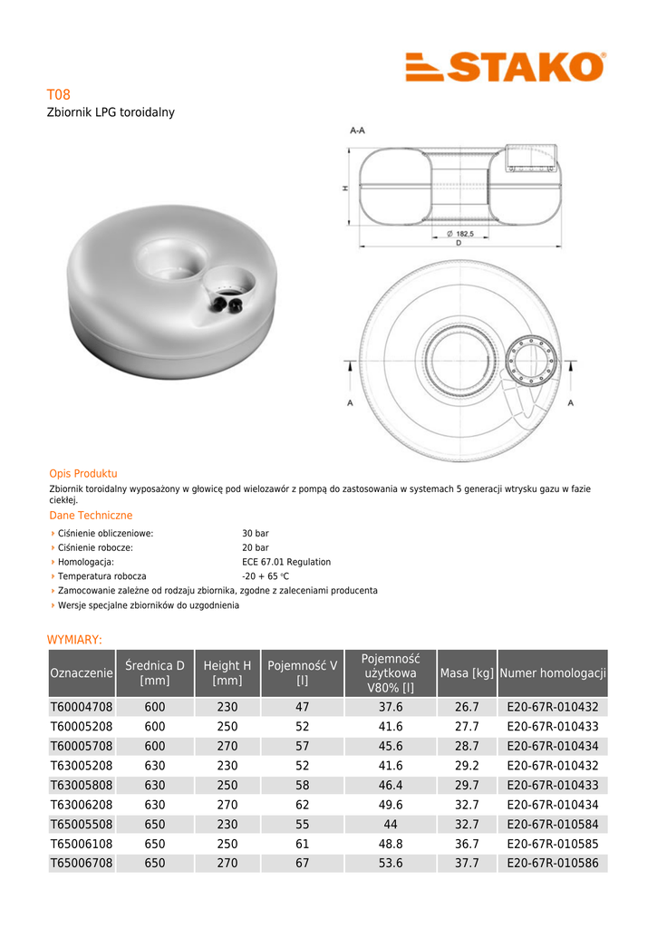 T08 Zbiornik LPG toroidalny Opis Produktu Zbiornik toroidalny wyposażony w głowicę pod wielozawór z pompą do zastosowania w systemach 5 generacji wtrysku gazu w fazie ciekłej. Dane Techniczne Ciśnienie obliczeniowe: 30 bar Ciśnienie robocze: 20 bar Homologacja: ECE 67.01 Regulation Temperatura robocza -20 + 65 oC Zamocowanie zależne od rodzaju zbiornika, zgodne z zaleceniami producenta Wersje specjalne zbiorników do uzgodnienia WYMIARY: Oznaczenie Średnica D [mm] Height H [mm] Pojemność V [l] Pojemność użytkowa V80% [l] T60004708 600 230 47 37.6 26.7 E20-67R-010432 T60005208 600 250 52 41.6 27.7 E20-67R-010433 T60005708 600 270 57 45.6 28.7 E20-67R-010434 T63005208 630 230 52 41.6 29.2 E20-67R-010432 T63005808 630 250 58 46.4 29.7 E20-67R-010433 T63006208 630 270 62 49.6 32.7 E20-67R-010434 T65005508 650 230 55 44 32.7 E20-67R-010584 T65006108 650 250 61 48.8 36.7 E20-67R-010585 T65006708 650 270 67 53.6 37.7 E20-67R-010586 Masa [kg] Numer homologacji T68005708 680 230 57 45.6 37.2 E20-67R-010584 T68006208 680 250 62 49.6 39.2 E20-67R-010585 T68006908 680 270 69 55.2 40.7 E20-67R-010586 T72007008 720 230 70 56 40.7 E20-67R-010584 T72007608 720 250 76 60.8 42.7 E20-67R-010585 T72008308 720 270 83 66.4 44.2 E20-67R-010586 STAKO Sp. z o.o. Poznańska 54 76-200 Słupsk Poland T: F E: I: +48 59 8424895 +48 59 8481999 [email protected] www.stako.pl VAT No.: KRS: PL8392766131 0000078261 Sąd Rejonowy Gdańsk-Północ w Gdańsku VIII wydz. gospodarczy KRS Kapitał zakładowy: 59.020.000,00 PLN