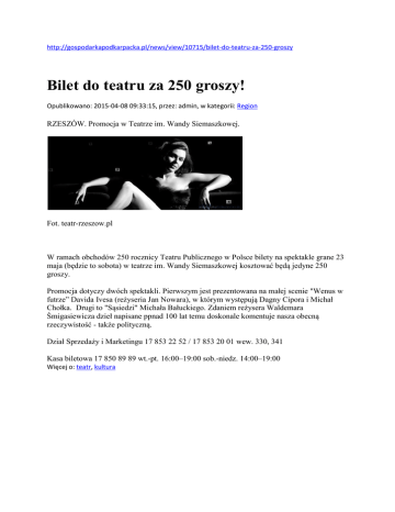 http://gospodarkapodkarpacka.pl/news/view/10715/bilet-do-teatru-za-250-groszy Bilet do teatru za 250 groszy! Opublikowano: 2015-04-08 09:33:15, przez: admin, w kategorii: Region RZESZÓW. Promocja w Teatrze im. Wandy Siemaszkowej. Fot. teatr-rzeszow.pl W ramach obchodów 250 rocznicy Teatru Publicznego w Polsce bilety na spektakle grane 23 maja (będzie to sobota) w teatrze im. Wandy Siemaszkowej kosztować będą jedyne 250 groszy. Promocja dotyczy dwóch spektakli. Pierwszym jest prezentowana na małej scenie "Wenus w futrze” Davida Ivesa (reżyseria Jan Nowara), w którym występują Dagny Cipora i Michał Chołka. Drugi to "Sąsiedzi" Michała Bałuckiego. Zdaniem reżysera Waldemara Śmigasiewicza dzieł napisane ppnad 100 lat temu doskonale komentuje nasza obecną rzeczywistość - także polityczną. Dział Sprzedaży i Marketingu 17 853 22 52 / 17 853 20 01 wew. 330, 341 Kasa biletowa 17 850 89 89 wt.-pt. 16:00–19:00 sob.-niedz. 14:00–19:00 Więcej o: teatr, kultura