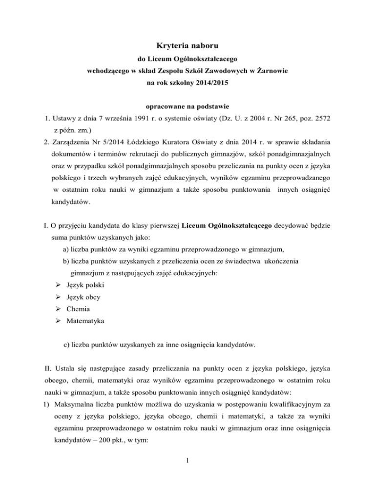 Kryteria naboru do Liceum Ogólnokształcacego wchodzącego w skład Zespołu Szkół Zawodowych w Żarnowie na rok szkolny 2014/2015 opracowane na podstawie 1. Ustawy z dnia 7 września 1991 r. o systemie oświaty (Dz. U. z 2004 r. Nr 265, poz. 2572 z późn. zm.) 2. Zarządzenia Nr 5/2014 Łódzkiego Kuratora Oświaty z dnia 2014 r. w sprawie składania dokumentów i terminów rekrutacji do publicznych gimnazjów, szkół ponadgimnazjalnych oraz w przypadku szkół ponadgimnazjalnych sposobu przeliczania na punkty ocen z języka polskiego i trzech wybranych zajęć edukacyjnych, wyników egzaminu przeprowadzanego w ostatnim roku nauki w gimnazjum a także sposobu punktowania innych osiągnięć kandydatów. I. O przyjęciu kandydata do klasy pierwszej Liceum Ogólnokształcącego decydować będzie suma punktów uzyskanych jako: a) liczba punktów za wyniki egzaminu przeprowadzonego w gimnazjum, b) liczba punktów uzyskanych z przeliczenia ocen ze świadectwa ukończenia gimnazjum z następujących zajęć edukacyjnych: Język polski Język obcy Chemia Matematyka c) liczba punktów uzyskanych za inne osiągnięcia kandydatów. II. Ustala się następujące zasady przeliczania na punkty ocen z języka polskiego, języka obcego, chemii, matematyki oraz wyników egzaminu przeprowadzonego w ostatnim roku nauki w gimnazjum, a także sposobu punktowania innych osiągnięć kandydatów: 1) Maksymalna liczba punktów możliwa do uzyskania w postępowaniu kwalifikacyjnym za oceny z języka polskiego, języka obcego, chemii i matematyki, a także za wyniki egzaminu przeprowadzonego w ostatnim roku nauki w gimnazjum oraz inne osiągnięcia kandydatów – 200 pkt., w tym: 1 1. liczba punktów możliwych do uzyskania za egzamin przeprowadzonym w ostatnim roku nauki w gimnazjum – 100 pkt.; 2. liczba punktów możliwych do uzyskania za oceny na świadectwie ukończenia gimnazjum z czterech przedmiotów – języka polskiego, języka obcego, chemii i matematyki oraz za inne osiągnięcia ucznia wymienione w świadectwie ukończenia gimnazjum – 100 pkt. 2) Wyniki egzaminu gimnazjalnego (zawarte w zaświadczeniu o szczegółowych wynikach egzaminu), wyrażone w skali procentowej dla zadań z zakresu: 1. języka polskiego, 2. historii i wiedzy o społeczeństwie, 3. matematyki, 4. przedmiotów przyrodniczych: biologii, geografii, fizyki i chemii 5. języka obcego nowożytnego na poziomie podstawowym, przeliczane są na punkty według zasady, iż z każdego zakresu można uzyskać maksymalnie 20 punktów, czyli jeden procent w każdym z zakresów odpowiada 0,2 punkta. 3) Sposób przeliczania na punkty ocen z języka polskiego, języka obcego, chemii i matematyki jest następujący: 1. stopień celujący – 15 punktów 2. stopień bardzo dobry – 13 punktów 3. stopień dobry – 11 punktów 4. stopień dostateczny – 7 punktów 5. stopień dopuszczający – 2 punkty 4) Świadectwo ukończenia gimnazjum z wyróżnieniem – 7 punktów 5) Sposób przeliczania na punkty innych szkolnych lub pozaszkolnych osiągnięć ucznia z okresu nauki w gimnazjum, umieszczonych na świadectwie ukończenia gimnazjum: 1. uzyskanie tytułu finalisty w konkursach przedmiotowych organizowanych przez kuratora oświaty. Wykaz konkursów przedmiotowych dla uczniów gimnazjów organizowanych przez: - Łódzkiego Kuratora Oświaty: 1. języka polskiego, 2. języka angielskiego, 3. języka niemieckiego, 2 4. języka francuskiego, 5. języka rosyjskiego, 6. historyczny, 7. biologiczny, 8. chemiczny, 9. fizyczny, 10. informatyczny, 11. geograficzny, 12. matematyczny, 13. wiedzy o społeczeństwie, 14. wiedzy o sztuce (muzyka, plastyka) a) jeden tytuł – 11 punktów b) dwa i więcej tytułów – dodatkowo 2 punkty 2. zajęcie od 1 do 6 miejsca indywidualnie lub od 1 do 4 miejsca zespołowo w konkursach tematycznych i interdyscyplinarnych co najmniej na szczeblu wojewódzkim. Wykaz konkursów tematycznych i interdyscyplinarnych (punktowane są osiągnięcia kandydatów co najmniej na szczeblu wojewódzkim: 1. Konkurs „Matematyka – moja pasja” 2. Konkurs Geograficzno – Turystyczny „Przez lądy, morza i oceany… - Ameryka Północna 3. Interdyscyplinarny Konkurs Filozofii Klasycznej „W poszukiwaniu prawdy o człowieku” 4. Interdyscyplinarny Konkurs Ekologiczno – Regionalny 5. Ogólnopolski Konkurs wiedzy o czasach i osobie Karola Wojtyły – Jana Pawła II „Papież Słowianin” 6. Ogólnopolski Konkurs Historyczny „Losy żołnierza i dzieje oręża polskiego w latach 1939-1945” – etap regionalny 7. Ogólnopolski Konkurs „Losy Bliskich i Losy Dalekich – Życie Polaków w latach 1914-1989” a) w jednym konkursie – 6 punktów b) dwóch i więcej konkursach – dodatkowo 2 punkty 3 3. zajęcie od 1 do 6 miejsca w zawodach sportowych indywidualnych lub od 1 do 4 miejsca w rywalizacji zespołowej co najmniej na szczeblu wojewódzkim. Wykaz dyscyplin sportowych (indywidualnych i zespołowych), obejmujących konkursy organizowane przez polskie związki sportowe, wojewódzkie interdyscyplinarne stowarzyszenia kultury fizycznej, Szkolny Związek Sportowy lub Ludowe Zespoły Sportowe, w których osiągnięcia kandydatów są punktowane w procesie rekrutacji do szkół ponadgimnazjalnych: akrobatyka sportowa, alpinizm, badminton, baseball, biathlon, biathlon letni, biegi na orientację, biegi przełajowe, bilard, boks, bowling sportowy, brydż sportowy, curling, gimnastyka artystyczna, gimnastyka sportowa, golf, hokej na lodzie, hokej na trawie, jeździectwo, judo, ju-jitsu, kajak polo, kajakarstwo, kajakarstwo górskie, karate fudokan, karate kyokushin, karate shotokan, karate tradycyjne, karate WKF, kendo, kick-boxing, kolarstwo górskie, kolarstwo szosowe, kolarstwo torowe, koszykówka, kręglarstwo, lekkoatletyka, łucznictwo, łyżwiarstwo figurowe, łyżwiarstwo szybkie, łyżwiarstwo szybkie – short track, modelarstwo kołowe, modelarstwo kosmiczne, modelarstwo lotnicze, modelarstwo pływające,