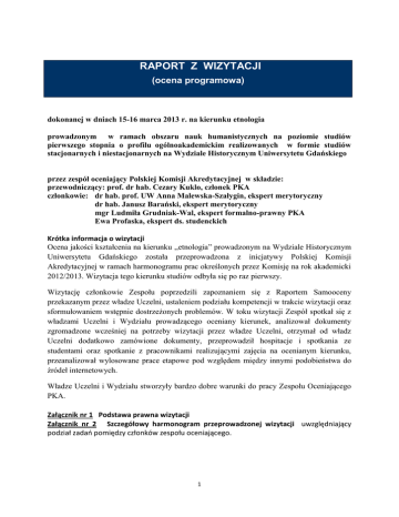 RAPORT Z WIZYTACJI (ocena programowa) dokonanej w dniach 15-16 marca 2013 r. na kierunku etnologia prowadzonym w ramach obszaru nauk humanistycznych na poziomie studiów pierwszego stopnia o profilu ogólnoakademickim realizowanych w formie studiów stacjonarnych i niestacjonarnych na Wydziale Historycznym Uniwersytetu Gdańskiego przez zespół oceniający Polskiej Komisji Akredytacyjnej w składzie: przewodniczący: prof. dr hab. Cezary Kuklo, członek PKA członkowie: dr hab. prof. UW Anna Malewska-Szałygin, ekspert merytoryczny dr hab. Janusz Barański, ekspert merytoryczny mgr Ludmiła Grudniak-Wal, ekspert formalno-prawny PKA Ewa Profaska, ekspert ds. studenckich Krótka informacja o wizytacji Ocena jakości kształcenia na kierunku ,,etnologia” prowadzonym na Wydziale Historycznym Uniwersytetu Gdańskiego została przeprowadzona z inicjatywy Polskiej Komisji Akredytacyjnej w ramach harmonogramu prac określonych przez Komisję na rok akademicki 2012/2013. Wizytacja tego kierunku studiów odbyła się po raz pierwszy. Wizytację członkowie Zespołu poprzedzili zapoznaniem się z Raportem Samooceny przekazanym przez władze Uczelni, ustaleniem podziału kompetencji w trakcie wizytacji oraz sformułowaniem wstępnie dostrzeżonych problemów. W toku wizytacji Zespół spotkał się z władzami Uczelni i Wydziału prowadzącego oceniany kierunek, analizował dokumenty zgromadzone wcześniej na potrzeby wizytacji przez władze Uczelni, otrzymał od władz Uczelni dodatkowo zamówione dokumenty, przeprowadził hospitacje i spotkania ze studentami oraz spotkanie z pracownikami realizującymi zajęcia na ocenianym kierunku, przeanalizował wylosowane prace etapowe pod względem między innymi podobieństwa do źródeł internetowych. Władze Uczelni i Wydziału stworzyły bardzo dobre warunki do pracy Zespołu Oceniającego PKA. Załącznik nr 1 Podstawa prawna wizytacji Załącznik nr 2 Szczegółowy harmonogram przeprowadzonej wizytacji uwzględniający podział zadań pomiędzy członków zespołu oceniającego. 1 1. Koncepcja rozwoju ocenianego kierunku sformułowana przez jednostkę1. 1.W 2004 r. Uniwersytet Gdański przyjął strategię rozwoju na lata 2005-2013 (zatytułowaną Budowa Bałtyckiego Kampusu Uniwersytetu Gdańskiego), która została zmieniona w 2008 r. i wydłużona do roku 2015 (Uchwała Senatu UG nr 85/08 z dn. 18 grudnia 2008 r. w sprawie przyjęcia „Strategii Uniwersytetu Gdańskiego do roku 2015 (Cele i działania strategiczne)”. W dwa lata później – po uwzględnieniu potrzeb i sygnałów płynących z regionu – powyższa koncepcja została zmodyfikowana w 2010 r. (Uchwała Senatu UG nr 25S/10 z dn. 25 lutego 2010 r., a nowa Strategia rozwoju Uniwersytetu Gdańskiego obejmuje okres do roku 2020. Kolejne Uchwały Senatu UG w l. 2011-2012 uzupełniły powyższą Strategię wprowadzając m.in. zmiany Wieloletniego Planu Inwestycyjnego UG na l. 2011-2020. W sformułowanej Strategii UG znajdujemy pełne zrozumienie dla wprowadzanych w RP reform związanych z Procesem Bolońskim, wdrożeniem Krajowych Ram Kwalifikacji i systematyczną oceną pracowników naukowo-dydaktycznych. W zakresie szczegółowym postanowiono uruchomić nowe kierunki studiów I i II stopnia w obszarach interdyscyplinarnych, a także studia III stopnia we wszystkich dyscyplinach, w których Uniwersytet posiada uprawnienia do nadawania stopni naukowych. Ponadto położono nacisk na rozwój szeroko rozumianej problematyki morskiej i umocnienie więzi uczelni z otoczeniem gospodarczym i społecznym Pomorza. Koncepcja kształcenia na kierunku etnologia prowadzonym na Wydziale Historycznym jest w pełni zgodna z misją i strategią rozwoju UG. Dobrze też wpisuje się w Strategię Jednostki na lata 2012-2016, w której obok kształcenia akademickiego zgodnie ze standardami światowymi, za kolejne cele strategiczne uznano m.in.: umocnienie prestiżu naukowego i rozpoznawalności wydziału w kraju i Europie oraz umocnienie więzi z otoczeniem społecznym i gospodarczym Pomorza. Należy podkreślić, że program studiów na kierunku etnologia przewiduje specjalność antropologia Kaszub i Pomorza, która dokładnie odpowiada intencjom uchwały Rady Wydziału. Odwołując się do Działu VI Statutu Uniwersytetu Gdańskiego mówiącego o obowiązku prowadzenia badań naukowych przez jednostki uniwersyteckie można podkreślić, że jeden z etatowych samodzielnych pracowników Zakładu Etnologii UG uzyskał grant z NCN na badanie dziedzictwa kulturowego Kaszub. Materiały jakie zgromadzi w czasie realizacji tego projektu mogą stać się cennym źródłem wiedzy o regionie i jego mieszkańcach. Zasugerować można stworzenie archiwum źródeł zastanych i wywołanych dotyczących życia społeczno-kulturowego Kaszub i Pomorza. Kierownictwo wizytowanej Jednostki dążąc do stabilizacji kadrowo-organizacyjnej kierunku podjęło starania o nowe etaty u władz Uczelni znajdującej się w bardzo trudnej sytuacji finansowej, które zaowocowały zatrudnieniem kolejnego jednego pracownika i rozpisaniem konkursu na stanowisko adiunkta w Zakładzie Etnologii. Pomimo pozyskania nowych pracowników Zakład Etnologii wciąż potrzebuje wzmocnienia kadrowego zarówno ze względów merytorycznych jak i z powodu wysokiego obłożenia obowiązkami dydaktycznymi 1 Punkty 1 – 8 wraz z podpunktami odpowiadają kryteriom określonym w statucie Polskiej Komisji Akredytacyjnej. 2 obecnej kadry. Warto podkreślić, że pracownicy systematycznie dążą do poszerzania dotychczasowej wiedzy teoretycznej i praktycznej poprzez odbywanie stypendiów zagranicznych w renomowanych ośrodkach naukowych m.in. na Uniwersytecie Humboldta oraz innych wyjazdów, w tym długotrwałych pobytów badawczych w: Australii, Brazylii, Japonii, Papui Nowej Gwinei. Dotychczasowa koncepcja kształcenia na kierunku etnologia na studiach I stopnia i perspektywy jego rozwoju zostały pozytywnie ocenione przez Senat UG, który wyraził zgodę 