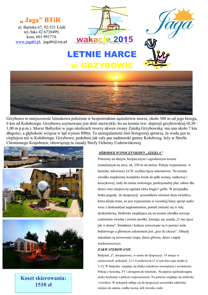 „ Jaga” BTiR ul. Bartoka 67, 92-531 Łódź tel./faks 42 6738499, kom. 601 991774. www.jagabt.pl, [email protected]. LETNIE HARCE w GRZYBOWIE Grzybowo to miejscowość letniskowa położona w bezpośrednim sąsiedztwie morza, około 300 m od jego brzegu, 6 km od Kołobrzegu. Grzybowo usytuowane jest dość niezwykle, bo na terenie tzw. depresji grzybowskiej (0,30 1,00 m p.p.m.). Morze Bałtyckie w jego okolicach tworzy akwen zwany Zatoką Grzybowską: ma ona około 7 km długości, a głębokość wcięcia w ląd wynosi 800m. Ta nieregularność linii brzegowej sprawia, że woda jest tu cieplejsza niż w Kołobrzegu. Grzybowo, podobnie jak cały pas nadmorski gminy Kołobrzeg, leży w Strefie Chronionego Krajobrazu, obowiązują tu zasady Strefy Ochrony Uzdrowiskowej. OŚRODEK WYPOCZYNKOWY „SZEKLA” Położony na dużym, bezpiecznym i ogrodzonym terenie (zamykanym na noc), ok. 250 m od morza. Pokoje wyposażone w łazienki, telewizory LCD, szybkie łącze internetowe. Na terenie ośrodka znajdziemy kompleks boisk do piłki nożnej, siatkowej i koszykowej, stoły do tenisa stołowego, profesjonalny plac zabaw dla dzieci oraz miejsca na ogniska (dwa kręgi) i grille. W przypadku braku pogody do dyspozycji uczestników również duża świetlica, która dzięki temu, że jest wyposażona w wysokiej klasy sprzęt audio wraz z doskonałym nagłośnieniem, potrafi zmienić się w salę dyskotekową. Stołówka znajdująca się na terenie ośrodka serwuje codziennie świetne i świeże posiłki, kierując się zasadą „U nas zjesz jak w domu”. Śniadania i kolacje serwowane są w postaci stołu bufetowego a głównym założeniem jest „jesz ile chcesz”. Obiady natomiast są serwowane (zupa, danie główne, deser i napój wieloowocowy). ZAKWATEROWANIE Budynek „I”, dwupiętrowy, w sumie do dyspozycji 55 miejsc w estetycznych pokojach 2,3 i 4 osobowych (3 w tym dwa typu studio tj. 2+2). W budynku znajduje się klatka schodowa wewnętrzna i zewnętrzna. Pokoje z łazienką, TV i dostępem do internetu. Na piętrze ogólnodostępny Koszt skierowania: 1510 zł aneks kuchenny z pełnym wyposażeniem. Na parterze znajduje się stołówka i świetlica. W pokojach oddaje się do dyspozycji uczestnika oddzielne miejsce do spania, szafkę nocną, stół, krzesła, szafa. PROGRAM. Dzień 1. Zbiórka na parkingu przy RTS Widzew o godz. 7.30 . Wyjazd o godz. 8.00. Przyjazd do Grzybowa. Zakwaterowanie. Obiadokolacja. Dzień 2 – 12. W trakcie pobytu m.in. kąpiele i plażowanie, gry, zabawy, dyskoteki, animacje oraz udział w imprezach plenerowych i rekreacyjno – sportowych. Rozgrywki w piłkę nożną, siatkową, tenisa stołowego. Ponadto w trakcie pobytu: Wycieczka do Muzeum Oręża Polskiego: 1. Kołobrzeski Skansen Morski to ekspozycja plenerowa znajdująca się w Porcie Rybackim. Największą atrakcją skansenu są dwa okręty posadowione na nabrzeżu: okręt patrolowy 912 ORP Fala i kuter rakietowy 205 ORP Władysławowo. Zwiedzający mają możliwość wejścia nie tylko na pokłady, ale i do wnętrz okrętów. Dla pasjonatów techniki morskiej prawdziwą gratką jest obejrzenie maszynowni, pomieszczeń załogi, messy oficerskiej, stanowisk dowodzenia. 2. Wycieczka do Kołobrzegu. Wizyta w latarni morskiej. Zwiedzimy miasto, odpoczniemy na pięknym kołobrzeskim molo. Na zakończenie zdobędziemy kołobrzeską latarnie morską. 3.Wycieczka do Centrum Rozrywki Zieleniewo: Wioska indiańska, Western City, Mini-zoo- czeka na nas trzygodzinna kumulacja atrakcji w tym: zwiedzanie stadniny, przejażdżka konna, bryczką, strzelanie z łuku, ognisko w wigwamie, kowbojska karuzela, indiańskie narty, zabawa z zespołem muzycznym, konkursy (m.in. dojenie kóz, szukanie złota), show - pokazy z udziałem koni. 4.Oceanarium w Kołobrzegu. Wizyta w Oceanarium pozwala podziwiać prawdziwy festiwal ryb we wszystkich możliwych kolorach i rozmiarach! Na własne oczy możesz zobaczyć m.in.: mureny, płaszczki, ukwiały, rozgwiazdy, piranie, rekiny rafowe. 5. Wycieczka do Trzęsacza. Multimedialne Muzeum na Klifie. Muzeum prezentuje nowoczesną multimedialną ekspozycję przedstawiającą historię starego kościoła oraz miejscowości Trzęsacz 6. Kościół w Trzęsaczu. Gdy w XV w. postawiono w Trzęsaczu świątynię, jej mury od brzegu morza dzieliły 2 km. Pierwszy fragment murów runął podmyty falami Bałtyku w 1901 r. Kolejne silne sztormy porywały stopniowo fragmenty pechowego zabytku. 7. Rejs statkiem Wikingów po Bałtyku. Obowiązkowy punkt programu dla wszystkich odpoczywających nad naszym pięknym morzem. Doskonała zabawa i moc atrakcji murowany. 1.Zakwaterowanie w Ośrodku Wypoczynkowym „ Szekla” w Grzybowie w pokojach 2,3,4 osobowych z łazienkami. 2.Wyżywienie ( śniadanie - bufet obiad, kolacja- bufet, podwieczorek). Prowiant na wycieczki autokarowe. Prowiant na drogę powrotną. 3.Transport autokarem 4.Ubezpieczenie NNW. 5.Możliwość korzystania z boisk sportowych, placu zabaw, stołu do tenisa stołowego, sali ze sprzętem TV i dyskotekowym. 6.Opiekę wykwalifikowanej kadry pedagogicznej. 7.Realizację ciekawego programu. 8.Wycieczki jak w programie, gry, zabawy, dyskoteki. 9.Wstępy w cenie imprezy. TURNUSY. 1. 28.06-10.07.2015 2. 10.07-22.07.2015 3. 22.07-03.08.2015 4. 03.08-15.08.2015 „Jaga” Biuro Turystyki i Rekreacji Łódź, ul. Bartoka 67, tel./faks 042 6738499, kom. 601 991774. www.jagabt.pl, [email protected].
