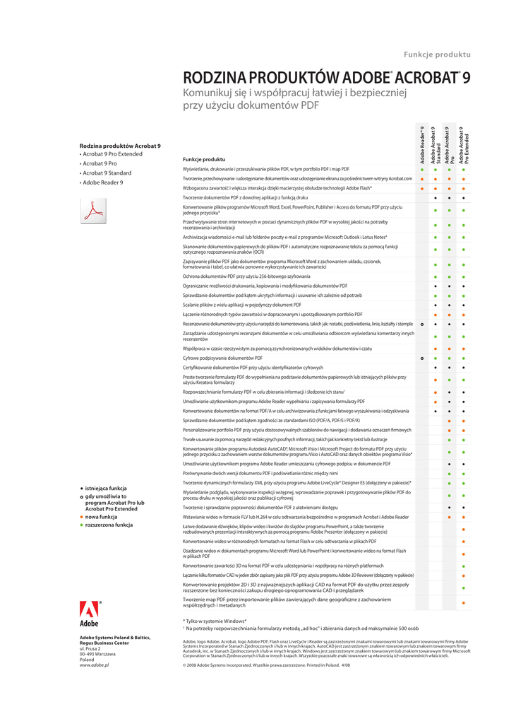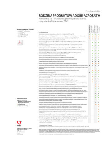 Funkcje produktu Rodzina produktów Adobe Acrobat 9 ® ® •Adobe Reader 9 Wyświetlanie, drukowanie i przeszukiwanie plików PDF, w tym portfolio PDF i map PDF Tworzenie, przechowywanie i udostępnianie dokumentów oraz udostępnianie ekranu za pośrednictwem witryny Acrobat.com Wzbogacona zawartość i większa interakcja dzięki macierzystej obsłudze technologii Adobe Flash® Tworzenie dokumentów PDF z dowolnej aplikacji z funkcją druku Adobe Acrobat 9 Pro Extended •Acrobat 9 Standard Funkcje produktu Adobe Acrobat 9 Pro •Acrobat 9 Pro Adobe Acrobat 9 Standard Rodzina produktów Acrobat 9 •Acrobat 9 Pro Extended Adobe Reader® 9 Komunikuj się i współpracuj łatwiej i bezpieczniej przy użyciu dokumentów PDF • • • • • • Konwertowanie plików programów Microsoft Word, Excel, PowerPoint, Publisher i Access do formatu PDF przy użyciu jednego przycisku* Przechwytywanie stron internetowych w postaci dynamicznych plików PDF w wysokiej jakości na potrzeby recenzowania i archiwizacji Archiwizacja wiadomości e-mail lub folderów poczty e-mail z programów Microsoft Outlook i Lotus Notes* Skanowanie dokumentów papierowych do plików PDF i automatyczne rozpoznawanie tekstu za pomocą funkcji optycznego rozpoznawania znaków (OCR) Zapisywanie plików PDF jako dokumentów programu Microsoft Word z zachowaniem układu, czcionek, formatowania i tabel, co ułatwia ponowne wykorzystywanie ich zawartości Ochrona dokumentów PDF przy użyciu 256-bitowego szyfrowania Ograniczanie możliwości drukowania, kopiowania i modyfikowania dokumentów PDF Sprawdzanie dokumentów pod kątem ukrytych informacji i usuwanie ich zależnie od potrzeb Scalanie plików z wielu aplikacji w pojedynczy dokument PDF Łączenie różnorodnych typów zawartości w dopracowanym i uporządkowanym portfolio PDF Współpraca w czasie rzeczywistym za pomocą zsynchronizowanych widoków dokumentów i czatu Cyfrowe podpisywanie dokumentów PDF Certyfikowanie dokumentów PDF przy użyciu identyfikatorów cyfrowych • • • • • • • • • • • • • • • • • • • • • • • • • • • • • • • • • • • • • • • • • • • • • Trwałe usuwanie za pomocą narzędzi redakcyjnych poufnych informacji, takich jak konkretny tekst lub ilustracje Konwertowanie plików programu Autodesk AutoCAD®, Microsoft Visio i Microsoft Project do formatu PDF przy użyciu jednego przycisku z zachowaniem warstw dokumentów programu Visio i AutoCAD oraz danych obiektów programu Visio* Umożliwianie użytkownikom programu Adobe Reader umieszczania cyfrowego podpisu w dokumencie PDF Tworzenie dynamicznych formularzy XML przy użyciu programu Adobe LiveCycle® Designer ES (dołączony w pakiecie)* Wyświetlanie podglądu, wykonywanie inspekcji wstępnej, wprowadzanie poprawek i przygotowywanie plików PDF do procesu druku w wysokiej jakości oraz publikacji cyfrowej Tworzenie i sprawdzanie poprawności dokumentów PDF z ułatwieniami dostępu Łatwe dodawanie dźwięków, klipów wideo i kwizów do slajdów programu PowerPoint, a także tworzenie rozbudowanych prezentacji interaktywnych za pomocą programu Adobe Presenter (dołączony w pakiecie) Konwertowanie wideo w różnorodnych formatach na format Flash w celu odtwarzania w plikach PDF Osadzanie wideo w dokumentach programu Microsoft Word lub PowerPoint i konwertowanie wideo na format Flash w plikach PDF Sprawdzanie dokumentów pod kątem zgodności ze standardami ISO (PDF/A, PDF/E i PDF/X) Personalizowanie portfolio PDF przy użyciu dostosowywalnych szablonów do nawigacji i dodawania oznaczeń firmowych Porównywanie dwóch wersji dokumentu PDF i podświetlanie różnic między nimi • • • • • Rozpowszechnianie formularzy PDF w celu zbierania informacji i śledzenie ich stanu Konwertowanie dokumentów na format PDF/A w celu archiwizowania z funkcjami łatwego wyszukiwania i odzyskiwania gdy umożliwia to program Acrobat Pro lub Acrobat Pro Extended nowa funkcja rozszerzona funkcja • Umożliwianie użytkownikom programu Adobe Reader wypełniania i zapisywania formularzy PDF • • • • Proste tworzenie formularzy PDF do wypełnienia na podstawie dokumentów papierowych lub istniejących plików przy użyciu Kreatora formularzy † • istniejąca funkcja • • • • • Recenzowanie dokumentów przy użyciu narzędzi do komentowania, takich jak: notatki, podświetlenia, linie, kształty i stemple Zarządzanie udostępnionymi recenzjami dokumentów w celu umożliwiania odbiorcom wyświetlania komentarzy innych recenzentów • • • • • • • • • • • • • • • • • • • • • • • • • • Konwertowanie projektów 2D i 3D z najważniejszych aplikacji CAD na format PDF do użytku przez zespoły rozszerzone bez konieczności zakupu drogiego oprogramowania CAD i przeglądarek • • • • • • • Tworzenie map PDF przez importowanie plików zawierających dane geograficzne z zachowaniem współrzędnych i metadanych • Wstawianie wideo w formacie FLV lub H.264 w celu odtwarzania bezpośrednio w programach Acrobat i Adobe Reader Konwertowanie zawartości 3D na format PDF w celu udostępniania i współpracy na różnych platformach Łączenie kilku formatów CAD w jeden zbiór zapisany jako plik PDF przy użyciu programu Adobe 3D Reviewer (dołączony w pakiecie) • *Tylko w systemie Windows® † Na potrzeby rozpowszechniania formularzy metodą „ad hoc” i zbierania danych od maksymalnie 500 osób Adobe Systems Poland & Baltics, Regus Business Center ul. Prusa 2 00-493 Warszawa Poland www.adobe.pl Adobe, logo Adobe, Acrobat, logo Adobe PDF, Flash oraz LiveCycle i Reader są zastrzeżonymi znakami towarowymi lub znakami towarowymi firmy Adobe Systems Incorporated w Stanach Zjednoczonych i/lub w innych krajach. AutoCAD jest zastrzeżonym znakiem towarowym lub znakiem towarowym firmy Autodesk, Inc. w Stanach Zjednoczonych i/lub w innych krajach. Win