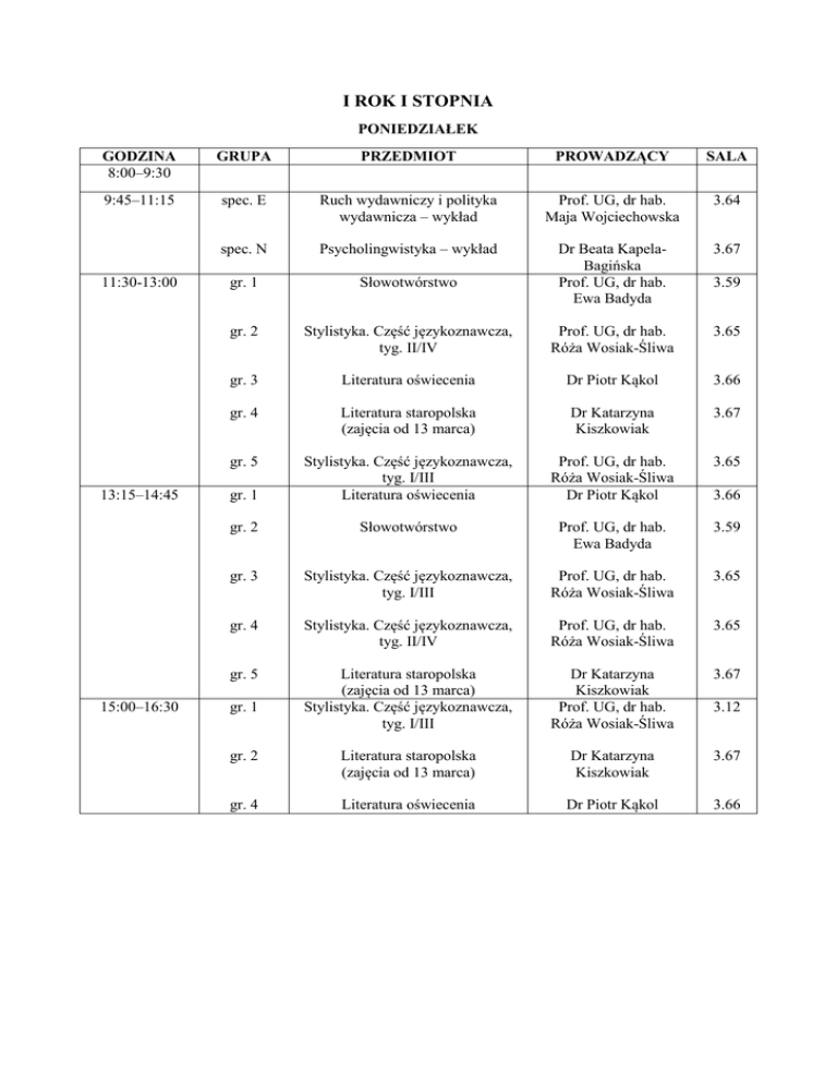 I ROK I STOPNIA PONIEDZIAŁEK GODZINA 8:00–9:30 GRUPA PRZEDMIOT PROWADZĄCY SALA 9:45–11:15 spec. E Ruch wydawniczy i polityka wydawnicza – wykład Prof. UG, dr hab. Maja Wojciechowska 3.64 spec. N Psycholingwistyka – wykład 3.67 gr. 1 Słowotwórstwo Dr Beata KapelaBagińska Prof. UG, dr hab. Ewa Badyda gr. 2 Stylistyka. Część językoznawcza, tyg. II/IV Prof. UG, dr hab. Róża Wosiak-Śliwa 3.65 gr. 3 Literatura oświecenia Dr Piotr Kąkol 3.66 gr. 4 Literatura staropolska (zajęcia od 13 marca) Dr Katarzyna Kiszkowiak 3.67 gr. 5 Prof. UG, dr hab. Róża Wosiak-Śliwa Dr Piotr Kąkol 3.65 gr. 1 Stylistyka. Część językoznawcza, tyg. I/III Literatura oświecenia gr. 2 Słowotwórstwo Prof. UG, dr hab. Ewa Badyda 3.59 gr. 3 Stylistyka. Część językoznawcza, tyg. I/III Prof. UG, dr hab. Róża Wosiak-Śliwa 3.65 gr. 4 Stylistyka. Część językoznawcza, tyg. II/IV Prof. UG, dr hab. Róża Wosiak-Śliwa 3.65 gr. 5 Literatura staropolska (zajęcia od 13 marca) Stylistyka. Część językoznawcza, tyg. I/III Dr Katarzyna Kiszkowiak Prof. UG, dr hab. Róża Wosiak-Śliwa 3.67 gr. 2 Literatura staropolska (zajęcia od 13 marca) Dr Katarzyna Kiszkowiak 3.67 gr. 4 Literatura oświecenia Dr Piotr Kąkol 3.66 11:30-13:00 13:15–14:45 15:00–16:30 gr. 1 3.59 3.66 3.12 WTOREK GODZINA 8:00–9:30 GRUPA gr. 4 PRZEDMIOT Poetyka PROWADZĄCY Dr Katarzyna Szalewska SALA 3.4 9:45–11:15 gr. 2 Literatura oświecenia Dr Piotr Kąkol 3.60 11:30-13:00 gr. 1 1–5 Dr Katarzyna Szalewska Dr Piotr Kąkol 3.4 1.45 13:15–14:45 1–5 Poetyka Literatura oświecenia – wykład, tyg. I/III Historia myśli humanistycznej – wykład, tyg. I/III Prof. UG, dr hab. Marcin Całbecki 1.45 Współczesna kultura medialna – wykład, tyg. II/IV Współczesna kultura medialna – wykład, tyg. I/III Prof. dr hab. Zbigniew Majchrowski Prof. dr hab. Zbigniew Majchrowski 3.67 Współczesna kultura medialna – wykład, tyg. II/IV Fakultet kierunkowy: Interpretacje snów Prof. dr hab. Zbigniew Majchrowski Prof. dr hab. Wojciech Owczarski 3.67 spec. P-D 15:00–16:30 spec. P-D, gr. A spec. P-D, gr. B 16:45-18:15 3.67 3.66 ŚRODA GODZINA 8:00–9:30 GRUPA PRZEDMIOT PROWADZĄCY SALA 9:45–11:15 spec. P-D Retoryka dziennikarska – wykład, tyg. I/III Dr Monika Żółkoś 3.67 11:30-13:00 spec. E Opracowanie redakcyjne książki Dr Piotr Sitkiewicz 3.55 spec. N Psychodydaktyka – wykład 3.67 gr. 3 Słowotwórstwo Prof. UG, dr hab. Halina Popławska Dr Aneta Lica gr. 5 Literatura oświecenia Dr Anna ReglińskaJemioł 3.4 Fakultet kierunkowy: Od kunsztownego komplementu po obscenum. Erotyk staropolski Mgr Sylwia Kawska 3.67 Fakultet kierunkowy: Jak pisać sprawnie i poprawnie Dr Aneta Lica 3.66 Fakultet kierunkowy Dr Anna ReglińskaJemioł 3.64 13:15–14:45 3.56 15:00–16:30 16:45-18:15 CZWARTEK GODZINA 8:00–9:30 GRUPA PRZEDMIOT PROWADZĄCY SALA 9:45–11:15 gr. 1 Literatura staropolska (zajęcia od 16 marca) Dr Katarzyna Kiszkowiak 3.60 11:30-13:00 gr. 2 Poetyka Dr Maciej Dajnowski 3.56 gr. 3 Literatura staropolska (zajęcia od 16 marca) Dr Katarzyna Kiszkowiak 3.60 gr. 5 Poetyka 3.12 gr. 3 Poetyka Dr Magdalena Horodecka Dr Magdalena Horodecka 13:15–14:45 3.12 PIĄTEK GODZINA 8:00–9:30 GRUPA gr. 4 PRZEDMIOT Słowotwórstwo 9:45–11:15 spec. P-D, gr. A Retoryka dziennikarska, tyg. I/III 11:30-13:00 spec. P-D, gr. B gr. 5 Retoryka dziennikarska, tyg. II/IV Słowotwórstwo PROWADZĄCY Prof. UG, dr hab. Beata Milewska Dr Monika Żółkoś SALA 3.66 Dr Monika Żółkoś Prof. UG, dr hab. Beata Milewska 3.65 3.66 W semestrze letnim obowiązuje również zaliczenie 30 godzin lektoratu z języka obcego. Zajęcia 7 czerwca będą realizowane według planu poniedziałkowego. 3.65 II ROK I STOPNIA PONIEDZIAŁEK GODZINA 8:00–9:30 PRZEDMIOT Klasycy dziennikarstwa, tyg. I/III PROWADZĄCY Mgr Anna Dargiewicz SALA 3.66 Klasycy dziennikarstwa – wykład, tyg. I/III Dr Magdalena Horodecka 3.66 9:45–11:15 GRUPA spec. P-D, gr. B spec. P-D 11:30-13:00 gr. 1 Wiedza o komunikacji językowej, tyg. I/III Prof. dr hab. Jolanta Kowalewska-Dąbrowska 3.55 gr. 2 Wprowadzenie do wiedzy o filmie Mgr Paulina Pohl 3.64 gr. 5 Wiedza o współczesnym języku polskim: składnia Literatura współczesna (1939-89), tyg. I/III Dr Hanna Makurat 3.60 Prof. dr hab. Stefan Chwin 3.64 gr. 2 Literatura współczesna (1939-89), tyg. II/IV Prof. dr hab. Stefan Chwin 3.64 gr. 5 Wiedza o historii języka polskiego 3.56 gr. 1 Wiedza o współczesnym języku polskim: składnia Prof. UG, dr hab. Izabela Kępka Dr Hanna Makurat gr. 3 Literatura współczesna (1939-89), tyg. I/III Prof. dr hab. Stefan Chwin 3.64 gr. 4 Literatura współczesna (1939-89), tyg. II/IV Prof. dr hab. Stefan Chwin 3.64 gr. 5 Wprowadzenie do wiedzy o filmie [zaj. od 15.30 do 17.00] Mgr Michał Pruszak 3.65 13:15–14:45 15:00–16:30 gr. 1 3.60 WTOREK GODZINA GRUPA PRZEDMIOT PROWADZĄCY SAL A 1–5 Wiedza o historii języka polskiego – wykład, tyg. I/III Prof. UG, dr hab. Lucyna Warda-Radys 1.45 1–5 Literatura pozytywizmu – wykład, tyg. II/IV Wiedza o historii języka polskiego Dr Magdalena KreftŚwietlik Prof. UG, dr hab. Lucyna Warda-Radys 1.45 gr. 2 Wiedza o współczesnym języku polskim: składnia Dr Hanna Makurat 3.59 gr. 4 Stylistyka. Część literaturoznawcza, tyg. I/III Dr Monika Pomirska 3.55 gr. 5 Dr Monika Pomirska 3.55 gr. 1 Stylistyka. Część literaturoznawcza, tyg. II/IV Wprowadzenie do wiedzy o filmie Mgr Joanna Kiedrowska/ mgr Piotr Wajda 3.65 gr. 2 Wiedza o historii języka polskiego Prof. UG, dr hab. Lucyna Warda-Radys 3.60 gr. 4 Wiedza o współczesnym języku polskim: składnia Dr Hanna Makurat 3.59 gr. 5 Literatura współczesna (1939-89), tyg. II/IV Prof. dr hab. Stefan Chwin 3.64 spec. P-D, gr. A Internet w praktyce dziennikarskiej, tyg. I/III Mgr Klaudia Renusch 3.65 8:00–9:30 9:45–11:15 11:30-13:00 13:15–14:45 gr. 1 3.60 15:00–16:30 16:45-18:15 ŚRODA GODZINA 8:00–9:30 GRUPA spec. N, gr. a PRZEDMIOT Dydaktyka literatury PROWAD