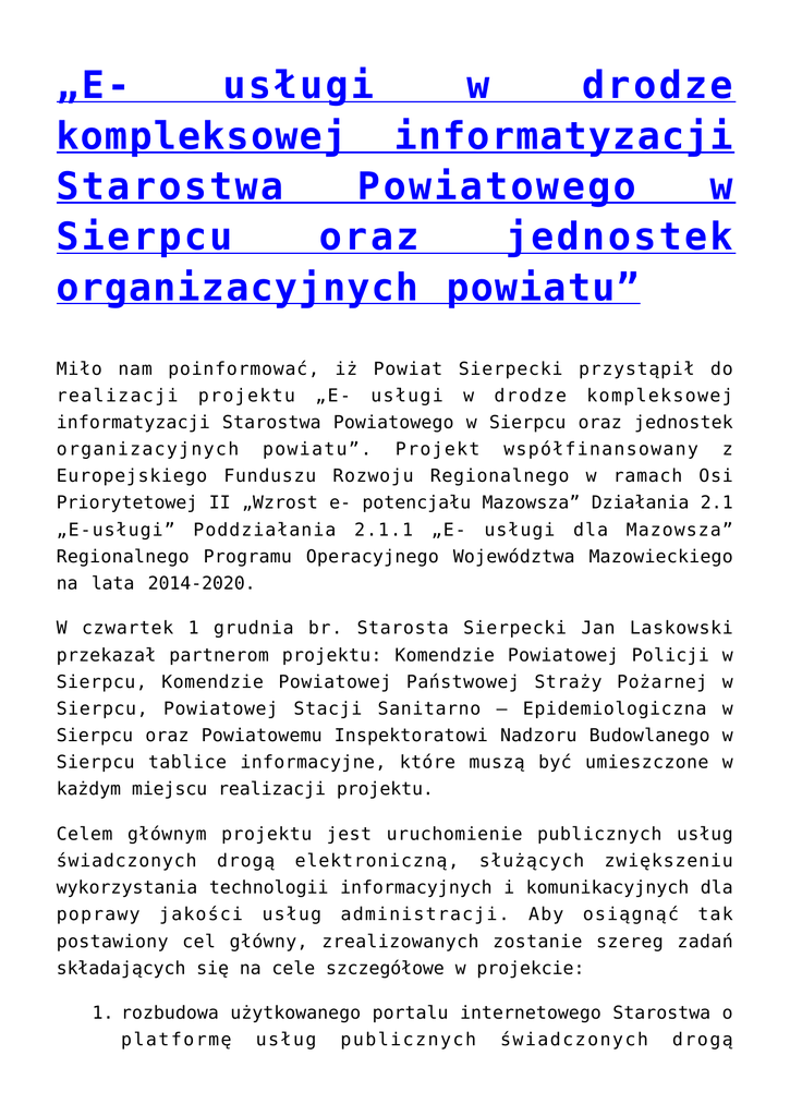 „Eusługi w drodze kompleksowej informatyzacji Starostwa Powiatowego w Sierpcu oraz jednostek organizacyjnych powiatu” Miło nam poinformować, iż Powiat Sierpecki przystąpił do realizacji projektu „E- usługi w drodze kompleksowej informatyzacji Starostwa Powiatowego w Sierpcu oraz jednostek organizacyjnych powiatu”. Projekt współfinansowany z Europejskiego Funduszu Rozwoju Regionalnego w ramach Osi Priorytetowej II „Wzrost e- potencjału Mazowsza” Działania 2.1 „E-usługi” Poddziałania 2.1.1 „E- usługi dla Mazowsza” Regionalnego Programu Operacyjnego Województwa Mazowieckiego na lata 2014-2020. W czwartek 1 grudnia br. Starosta Sierpecki Jan Laskowski przekazał partnerom projektu: Komendzie Powiatowej Policji w Sierpcu, Komendzie Powiatowej Państwowej Straży Pożarnej w Sierpcu, Powiatowej Stacji Sanitarno – Epidemiologiczna w Sierpcu oraz Powiatowemu Inspektoratowi Nadzoru Budowlanego w Sierpcu tablice informacyjne, które muszą być umieszczone w każdym miejscu realizacji projektu. Celem głównym projektu jest uruchomienie publicznych usług świadczonych drogą elektroniczną, służących zwiększeniu wykorzystania technologii informacyjnych i komunikacyjnych dla poprawy jakości usług administracji. Aby osiągnąć tak postawiony cel główny, zrealizowanych zostanie szereg zadań składających się na cele szczegółowe w projekcie: 1. rozbudowa użytkowanego portalu internetowego Starostwa o platformę usług publicznych świadczonych drogą elektroniczną e-urząd. 2. modernizacja i rozbudowa systemu informatycznego Starostwa dla zapewnienia interoperacyjności publicznych systemów teleinformatycznych, zinformatyzowanie dostępu do informacji publicznej oraz udostępnienie jak najszerszego zakresu usług publicznych świadczonych elektronicznie, umożliwiających pełną interakcję z urzędem, czyli możliwość całkowitego załatwienia danej sprawy na odległość. 3. spełnienie wymogu współpracy z systemami i rejestrami zewnętrznymi. 4. zwiększenie bezpieczeństwa danych. Powyższe cele bezpośrednie przekładają się na szereg celów pośrednich w projekcie: rozwój e-usług o jak najwyższym stopniu dojrzałości, z których korzystać będą obywatele, poprawa dostępności mieszkańców powiatu do rejestrów publicznych, usprawnienie procesu obsługi interesanta, poprawa jakości świadczonych usług publicznych, usprawnienie procesu gromadzenia danych i informacji, podniesienie poziomu bezpieczeństwa danych i informacji, przyspieszenie dostępu do danych i informacji, rozwój kompetencji pracowników Starostwa. Powyższy cel główny jak i cele szczegółowe projektu zostaną osiągnięte poprzez realizację zadań inwestycyjnych: zakup sprzętu komputerowego, modernizacja infrastruktury teleinformatycznej jednostkach organizacyjnych Powiatu Sierpeckiego, w rozbudowa kompleksowego systemu bezpieczeństwa danych, rozbudowa środowiska serwerowego, wdrożenie platformy mieszkańców, elektronicznej e—usług dla zapewnienie interoperacyjności systemu informatycznego z platformą krajową ePUAP. Całkowita wartość projektu: 2 995 050,00 PLN Okres realizacji: od 01-09-2015 do 31-03-2018 E-usługi w Starostwie Powiatowym ! Jubileusz 10 Lecia Instytutu Jana Pawła II w Warszawie odznaczenie dla Dyrektor OPP w Sierpcu W nowoczesnym budynku stojącym przy świątyni Opatrzności Bożej odbył się Jubileusz 10 Lecia Instytutu Jana Pawła II. Uroczystości jubileuszowe rozpoczęła Msza św., której przewodniczył Kardynał Kazimierz Nycz, Metropolita Warszawski. Powiat Sierpecki reprezentowali : Renata Przybyłowska – dyrektor OPP oraz Grzegorz Lisicki – zastępca dyrektora PZJB w Sierpcu. Podczas uroczystej gali dyrektorzy Instytutu: ksiądz Zdzisław Struzik, ksiądz Aleksander Seniuk, kardynał Kazimierz Nycz oraz marszałek województwa mazowieckiego Zdzisław Struzik uhonorowali pamiątkowymi medalami osoby zasłużone, które współpracują z Instytutem oraz w swoich działaniach celebrują postać Jana Pawła II. Wśród odznaczonych znalazła się dyrektor Ogniska Pracy Pozaszkolnej w Sierpcu – Renata Przybyłowska. Podziękowanie i medal z wizerunkiem Jana Pawła II to uznanie za pracę i zaangażowanie dla całej społeczności Ogniska Pracy Pozaszkolnej w Sierpcu, przedszkoli, szkół, placówek i instytucji współpracujących z terenu miasta i powiatu sierpeckiego. OPP Sierpc 3 grudnia - Międzynarodowy Dzień Osób Niepełnosprawnych Życzenia z okazji Międzynarodowego Dnia Osób Niepełnosprawnych. „Nikt nie jest tak silny, by nie potrzebował pomocy i nikt nie jest tak słaby, by nie mógł pomóc innym…” 3 grudnia obchodzony jest Międzynarodowy Dzień Osób Niepełnosprawnych, ustanowiony przez Zgromadzenie Ogólne Narodów Zjednoczonych w 1992 roku (rezolucja 47/3 z 14.10.1992) podczas zamknięcia Dekady Osób Niepełnosprawnych (1983-1992). W tym szczególnym dniu życzymy osobom niepełnosprawnym, by w realizacji swoich celów i planów towarzyszyła Państwu wytrzymałość i życzliwość przyjaznych ludzi. Niech nie opuszcza Was przekonanie, iż będąc osobą niepełnosprawną można normalnie żyć, realizować swoje marzenia i cele, nawet te najtrudniejsze. Niech ten dzień będzie wyjątkowy, a każdy kolejny niech przynosi radość i szczęście. Składa Rada i Zarząd Powiatu w Sierpcu V Powiatowy Konkurs Ekologiczny pn. „Chrońmy środowisko odzyskując surowce wtórne” - rozstrzygnięty ! Starosta Sierpecki zorganizował w tym roku V Powiatowy Konkurs Ekologiczny pn. „Chrońmy środowisko odzyskując surowce wtórne” skierowany do uczniów szkół podstawowych, gimnazjalnych i ponadgimnazjalnych, znajdujących się na terenie powiatu sierpeckiego. W czwartek 1 grudnia br. w sali konferencyjnej Starostwa Powiatowego w Sierpcu odbyło się rozstrzygniecie konkursu. Uczestniczyli w niej przedstawiciele zwycięskich szkół, Starosta – Jan Laskowski, Wicestarosta – Juliusz