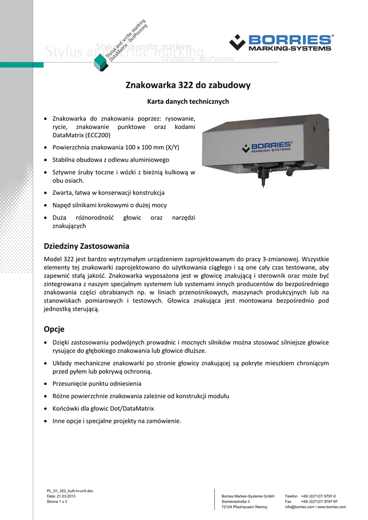 Znakowarka 322 do zabudowy Karta danych technicznych Znakowarka do znakowania poprzez: rysowanie, rycie, znakowanie punktowe oraz kodami DataMatrix (ECC200) Powierzchnia znakowania 100 x 100 mm (X/Y) Stabilna obudowa z odlewu aluminiowego Sztywne śruby toczne i wózki z bieżnią kulkową w obu osiach. Zwarta, łatwa w konserwacji konstrukcja Napęd silnikami krokowymi o dużej mocy Duża różnorodność znakujących głowic oraz narzędzi Dziedziny Zastosowania Model 322 jest bardzo wytrzymałym urządzeniem zaprojektowanym do pracy 3-zmianowej. Wszystkie elementy tej znakowarki zaprojektowano do użytkowania ciągłego i są one cały czas testowane, aby zapewnić stałą jakość. Znakowarka wyposażona jest w głowicę znakującą i sterownik oraz może być zintegrowana z naszym specjalnym systemem lub systemami innych producentów do bezpośredniego znakowania części obrabianych np. w liniach przenośnikowych, maszynach produkcyjnych lub na stanowiskach pomiarowych i testowych. Głowica znakująca jest montowana bezpośrednio pod jednostką sterującą. Opcje Dzięki zastosowaniu podwójnych prowadnic i mocnych silników można stosować silniejsze głowice rysujące do głębokiego znakowania lub głowice dłuższe. Układy mechaniczne znakowarki po stronie głowicy znakującej są pokryte mieszkiem chroniącym przed pyłem lub pokrywą ochronną. Przesunięcie punktu odniesienia Różne powierzchnie znakowania zależnie od konstrukcji modułu Końcówki dla głowic Dot/DataMatrix Inne opcje i specjalne projekty na zamówienie. PL_01_322_built-in-unit.doc Data: 21.03.2013 Strona 1 z 3 Borries Markier-Systeme GmbH Siemensstraße 3 72124 Pliezhausen/ Niemcy Telefon +49/ (0)7127/ 9797-0 Fax +49/ (0)7127/ 9797-97 [email protected] • www.borries.com Dane techniczne Wielkość, jednostka, wyjaśnienie CO* AO* Właściwość Wymiary znakowarki dla powierzchni znakowania (x, Y) 100 x 100 mm (szer. x dł. 325,5 x 255 x 173 mm (bez głowicy znakującej) x 325,5 x 205 x 173 mm (bez głowicy znakującej) x x wys.) Wymiary znakowarki dla powierzchni znakowania (x, Y) 100 x 50 mm (szer. x dł. x wys.) Wymiary znakowarki dla powierzchni znakowania (x, Y) 40 x 50 mm (szer. x dł. x 266,5 x 205 x 173 mm (bez głowicy znakującej) x 393,5 x 255 x 163 mm (bez głowicy znakującej) x wys.) Wymiary znakowarki dla powierzchni znakowania (x, Y) 150 x 100 mm (szer. x dł. x wys.) Masa znakowarki ok. 10 kg Prędkość znakowania (zależnie od wysokości i do 10 znaków/sekundę (por. karta czasu znakowania) kształtu znaków, procesu znakowania oraz napędu) Prędkość w trybie szybkim do 0,5 m/sek. Wysokość znaków od 0,5 mm (zwiększanie w krokach co 0,1 mm) Dokumentacja w jęz. niemieckim, angielskim lub francuskim x więcej języków Głębokość penetracji końcówki znakującej (zależnie od głowicy znakującej, procesu znakowania oraz materiału) x ok. 0,01 – 0,5 mm (por. karty techniczne głowic znakujących) Poziom hałasu w trybie rysowania maks. - 75 dB (A)(zależnie od obrabianej części) Pozycja punktu odniesienia por. rysunek x Linie zasilające i sterowania por. rysunek x Linie zasilające i sterowania wychodzące po prawej stronie Zasilanie PN (regulator i czujnik) montaż na miejscu Zasilanie PN (regulator i czujnik) na oddzielnej płytce aluminiowej Części pneumatyczne Festo i Bosch x Kolor pokrywy RAL 7035, szary x Zaprojektowane do pracy pod dużymi konieczne do głowicy znakującej R20M x x x x obciążeniami: podwójne prowadnice i mocne silniki Napęd silniki krokowe Mieszek harmonijkowy na zamówienie PL_01_322_built-in-unit.doc Data: 21.03.2013 Strona 2 z 3 x x Borries Markier-Systeme GmbH Siemensstraße 3 72124 Pliezhausen/ Niemcy Telefon +49/ (0)7127/ 9797-0 Fax +49/ (0)7127/ 9797-97 [email protected] • www.borries.com Pokrywa / ochrona przed wiórami na zamówienie x Doprowadzenie mediów Zasilacz z kablem połączeniowym Przyłącza pneumatyczne pneumatyczne) sprężone powietrze poddane technicznej 230 V AC ±10 %, 50/60 Hz lub 115 V AC ±10 %, 50/60 Hz (wejście Min. 5 bar (min. 75 psi) osuszone, bezolejowe, przefiltrowane filtrem 50 μm obróbce *) CO = opcja konstrukcyjna, określana przez złożenie zamówienia – bez dodatkowej opłaty; AO = opcja dodatkowa, można zamówić dodatkowo – za dodatkową opłatą Szczegóły techniczne mogą ulec zmianie. PL_01_322_built-in-unit.doc Data: 21.03.2013 Strona 3 z 3 Borries Markier-Systeme GmbH Siemensstraße 3 72124 Pliezhausen/ Niemcy Telefon +49/ (0)7127/ 9797-0 Fax +49/ (0)7127/ 9797-97 [email protected] • www.borries.com