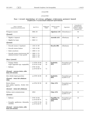 28.3.2015 PL Dziennik Urzędowy Unii Europejskiej L 84/25 ZAŁĄCZNIK „ZAŁĄCZNIK I Pasze i żywność niepochodzące od zwierząt, podlegające zwiększonemu poziomowi kontroli urzędowych w wyznaczonych miejscach wprowadzenia Pasze i żywność (zamierzone przeznaczenie) Winogrona suszone Kod CN (1) Podpozycja TARIC 0806 20 Państwo pocho dzenia Zagrożenie Częstotliwość kontroli bezpo średnich i identyfi kacyjnych (%) Afganistan (AF) Ochratoksyna A 50 Australia (AU) Aflatoksyny 20 Brazylia (BR) Aflatoksyny 10 Kambodża (KH) Pozostałości pes tycydów (2) (3) 50 (Żywność) — Migdały w łupinach — 0802 11 — Migdały bez łupin — 0802 12 (Żywność) — Orzeszki ziemne w łupinkach — 1202 41 00 — Orzeszki ziemne łuskane — 1202 42 00 — Masło orzechowe — 2008 11 10 — Orzeszki ziemne przetworzone lub — 2008 11 91; zakonserwowane w inny sposób 2008 11 96; 2008 11 98 (Pasze i żywność) — Wspięga chińska — ex 0708 20 00; (Vigna unguiculata spp. sesquipedalis) ex 0710 22 00 — Bakłażan 10 10 — 0709 30 00; ex 0710 80 95 72 ex 0709 40 00 20 Kambodża (KH) Pozostałości pes tycydów (2) (4) 50 ex 0704 90 90 40 Chiny (CN) Pozostałości pes tycydów (2) 50 Chiny (CN) Pozostałości pes tycydów (2) (6) 10 Republika Do minikańska (DO) Pozostałości pes tycydów (2) (7) 10 (Żywność – warzywa świeże, schło dzone lub mrożone) Seler chiński (Apium graveolens) (Żywność – świeże lub schłodzone zioła) Brassica oleracea (inne jadalne kapustne, »brokuł chiń ski«) (5) (Żywność – świeża lub schłodzona) Herbata, nawet aromatyzowana 0902 (Żywność) — Bakłażan — 0709 30 00; ex 0710 80 95 72 — Przepękla ogórkowata (Momordica — ex 0709 99 90; charantia) ex 0710 80 95 70 70 (Żywność – warzywa świeże, schło dzone lub mrożone) L 84/26 PL Pasze i żywność (zamierzone przeznaczenie) Dziennik Urzędowy Unii Europejskiej Kod CN (1) Podpozycja TARIC — Wspięga chińska — ex 0708 20 00; (Vigna unguiculata spp. sesquipedalis) ex 0710 22 00 10 10 — Papryka (słodka i inna niż słodka) — 0709 60 10; (Capsicum spp.) ex 0709 60 99 20 — 0710 80 51; ex 0710 80 59 20 (Żywność – warzywa świeże, schło dzone lub mrożone) Truskawki (świeże) 0810 10 00 Państwo pocho dzenia 28.3.2015 Zagrożenie Częstotliwość kontroli bezpo średnich i identyfi kacyjnych (%) Republika Do minikańska (DO) Pozostałości pes tycydów (2) (7) 20 Egipt (EG) Pozostałości pes tycydów (2) (8) 10 Egipt (EG) Pozostałości pes tycydów (2) (9) 10 Indie (IN) Salmonella (10) 50 Indie (IN) Salmonella (10) 20 Indie (IN) Aflatoksyny 20 Indie (IN) Chloramfenikol 50 Indonezja (ID) Aflatoksyny 20 Kenia (KE) Pozostałości pes tycydów (2) (11) 10 (Żywność) Papryka (słodka i inna niż słodka) (Capsicum spp.) 0709 60 10; ex 0709 60 99; 20 (Żywność – świeża, schłodzona lub mrożona) 0710 80 51; ex 0710 80 59 20 Liście betelu (Piper betle L.) ex 1404 90 00 10 (Żywność) Nasiona sezamu 1207 40 90 (Żywność – świeża lub schłodzona) — Capsicum annuum, całe owoce — 0904 21 10 — ex 0904 22 00 10 — Capsicum annuum, owoce rozgnia — 0904 21 90 tane lub mielone — Suszone całe owoce z rodzaju Cap — 0908 11 00; sicum, inne niż słodka papryka 0908 12 00 (Capsicum annuum) — Gałka muszkatołowa (Myristica fragrans) (Żywność – suszone przyprawy) Enzymy; preparaty enzymatyczne 3507 (Pasze i żywność) — Gałka muszkatołowa (Myristica fragrans) — 0908 11 00; 0908 12 00 (Żywność – suszone przyprawy) — Groch w strąkach (niełuskany) — Fasola w strąkach (niełuskana) (Żywność – świeża lub schłodzona) — ex 0708 10 00 — ex 0708 20 00 40 40 28.3.2015 PL Pasze i żywność (zamierzone przeznaczenie) Dziennik Urzędowy Unii Europejskiej Kod CN (1) Podpozycja TARIC Mięta ex 1211 90 86; 30 (Żywność – świeże lub schłodzone zioła) ex 2008 99 99 70 Suszona fasola Państwo pocho dzenia Częstotliwość kontroli bezpo średnich i identyfi kacyjnych (%) Pozostałości pes tycydów (2) (12) 10 0713 39 00 Nigeria (NG) Pozostałości pes tycydów (2) 50 0806 10 10 Peru (PE) Pozostałości pes tycydów (2) (13) 10 Sierra Leone (SL) Aflatoksyny 50 Sudan (SD) Aflatoksyny 50 (Żywność – świeża) Pestki arbuza (Egusi, Citrullus lanatus) i produkty pochodne Zagrożenie Maroko (MA) (Żywność) Winogrona stołowe L 84/27 ex 1207 70 00; ex 1106 30 90; ex 2008 99 99 10 30 50 (Żywność) — Orzeszki ziemne w łupinkach — 1202 41 00 — Orzeszki ziemne łuskane — 1202 42 00 — Masło orzechowe — 2008 11 10 — Orzeszki ziemne przetworzone lub — 2008 11 91; zakonserwowane w inny sposób 2008 11 96; 2008 11 98 (Pasze i żywność) Papryka (inna niż słodka) (Capsicum spp.) ex 0709 60 99 20 Tajlandia (TH) Pozostałości pes tycydów (2) (14) 10 ex 1404 90 00 10 Tajlandia (TH) Salmonella (10) 50 — Wspięga chińska — ex 0708 20 00; (Vigna unguiculata spp. sesquipedalis) ex 0710 22 00 10 10 Tajlandia (TH) Pozostałości pes tycydów (2) (15) 20 Turcja (TR) Siarczyny (16) 10 Turcja (TR) Pozostałości pes tycydów (2) (17) 10 (Żywność – świeża lub schłodzona) Liście betelu (Piper betle L.) (Żywność) — Bakłażan — 0709 30 00; ex 0710 80 95 72 (Żywność – warzywa świeże, schło dzone lub mrożone) — Morele suszone — 0813 10 00 — Morele inaczej przetworzone lub — 2008 50 61 zakonserwowane (Żywność) — Papryka słodka (Capsicum annuum) (Żywność – warzywa świeże, schło dzone lub mrożone) — 0709 60 10; 0710 80 51 L 84/28 PL Pasze i żywność (zamierzone przeznaczenie) Liście winorośli Dziennik Urzędowy Unii Europejskiej Kod CN (1) ex 2008 99 99 Podpozycja TARIC 11; 19 Państwo pocho dzenia — 0802 51 00 — Pistacje bez łupin — 0802 52 00 Zagrożenie Częstotliwość kontroli bezpo średnich i identyfi kacyjnych (%) Turcja (TR) Pozostałości pes tycydów (2) (18) 20 Stany Zjedno czone (US) Aflatoksyny 20 Uzbekistan (UZ) Siarczyny (16) 5