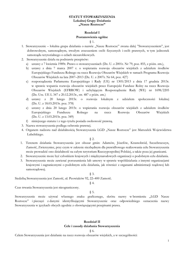 STATUT STOWARZYSZENIA Lokalnej Grupy Działania „Nasze Roztocze” Rozdział I Postanowienia ogólne § 1. 1. Stowarzyszenie – lokalna grupa działania o nazwie „Nasze Roztocze” zwana dalej ”Stowarzyszeniem”, jest dobrowolnym, samorządnym, trwałym zrzeszeniem osób fizycznych i osób prawnych, w tym jednostek samorządu terytorialnego o celach niezarobkowych. 2. Stowarzyszenie działa na podstawie przepisów: a) ustawy z 7 kwietnia 1989r. Prawo o stowarzyszeniach (Dz. U. z 2001r. Nr 79, poz. 855, z późn. zm.), b) ustawy z dnia 7 marca 2007 r. o wspieraniu rozwoju obszarów wiejskich z udziałem środków Europejskiego Funduszu Rolnego na rzecz Rozwoju Obszarów Wiejskich w ramach Programu Rozwoju Obszarów Wiejskich na lata 2007–2013 (Dz. U. z 2007r. Nr 64, poz. 427) c) rozporządzenia Parlamentu Europejskiego i Rady (UE) nr 1305/2013 z dnia 17 grudnia 2013r. w sprawie wsparcia rozwoju obszarów wiejskich przez Europejski Fundusz Rolny na rzecz Rozwoju Obszarów Wiejskich (EFRROW) i uchylającym Rozporządzenie Rady (WE) nr 1698/2205 (Dz. Urz. UE L 347 z 20.12.2013r., str. 487 z późn. zm.) d) ustawy z 20 lutego 2015r. o rozwoju lokalnym z udziałem społeczności lokalnej (Dz. U. z 18.03.2015r. poz. 378) e) ustawy z dnia 20 lutego 2015r. o wspieraniu rozwoju obszarów wiejskich z udziałem środków Europejskiego Funduszu Rolnego na rzecz Rozwoju Obszarów Wiejskich (Dz. U. z 13.03.2015r. poz. 349) f) niniejszego statutu i z tego tytułu posiada osobowość prawną. 3. Nazwa stowarzyszenia podlega ochronie prawnej. 4. Organem nadzoru nad działalnością Stowarzyszenia LGD „Nasze Roztocze” jest Marszałek Województwa Lubelskiego. § 2. 1. Terenem działania Stowarzyszenia jest obszar gmin: Adamów, Józefów, Krasnobród, Szczebrzeszyn, Zamość, Zwierzyniec, przy czym w zakresie niezbędnym dla prawidłowego realizowania celu Stowarzyszenia może prowadzić ono działalność na całym terytorium Rzeczypospolitej Polskiej, a także poza jej granicami. 2. Stowarzyszenie może być członkiem krajowych i międzynarodowych organizacji o podobnym celu działania. 3. Stowarzyszenie może zawierać porozumienia lub umowy w sprawie współdziałania z innymi organizacjami krajowymi i zagranicznymi o podobnym celu działania, jak również z organami administracji rządowej lub samorządowej. § 3. Siedzibą Stowarzyszenia jest Zamość, ul. Peowiaków 92, 22–400 Zamość. § 4. Czas trwania Stowarzyszenia jest nieograniczony. § 5. Stowarzyszenie może używać własnego znaku graficznego, skrótu nazwy w brzmieniu „LGD Nasze Roztocze” i pieczęci z danymi identyfikującymi Stowarzyszenie oraz odpowiedniego oznaczenia nazwy Stowarzyszenia w językach obcych zgodnie z obowiązującymi przepisami prawa. Rozdział II Cele i zasady działania Stowarzyszenia § 6. Celem Stowarzyszenia jest działanie na rzecz rozwoju obszarów wiejskich, a w szczególności: 1 1) podejmowanie inicjatyw i działań mających na celu pobudzenie aktywności społeczności lokalnych oraz ich czynny udział w opracowywaniu i realizacji Lokalnej Strategii Rozwoju, 2) udzielanie wsparcia mieszkańcom i podmiotom z obszaru objętego LSR w zakresie przygotowania projektów i pozyskiwania środków na ich realizację, w tym w ramach wdrażania LSR, 3) upowszechnianie i wymiana informacji o inicjatywach związanych z aktywizacją ludności i rozwojem obszarów wiejskich, 4) działanie na rzecz trwałego i zrównoważonego rozwoju społeczno – gospodarczego obszaru LGD oraz wspieranie działań innowacyjnych dla tego obszaru, 5) wspieranie aktywności gospodarczej mieszkańców obszaru LGD, 6) wzmacnianie kapitału społecznego obszaru LGD, 7) wspieranie rozwoju i poprawa standardu infrastruktury służącej wzmocnieniu kapitału społecznego obszaru LGD, 8) działania na rzecz osób zagrożonych marginalizacją i wykluczeniem społecznym zamieszkujących obszar LGD w tym grup defaworyzowanych ze względu na dostęp do rynku pracy, 9) wspieranie edukacji ekologicznej, aktywności proekologicznej mieszkańców oraz ochrony dziedzictwa przyrodniczego i kulturowego obszaru LGD, 10) rozwój infrastruktury turystycznej i promocja turystyki wiejskiej i agroturystyki, 11) budowanie społeczeństwa obywatelskiego poprzez pobudzanie i wspieranie oddolnych inicjatyw społecznych. § 7. Stowarzyszenie realizuje swoje cele w szczególności poprzez: 1) opracowanie Strategii Rozwoju Lokalnego Kierowanego przez Społeczność (LSR) i przystąpienie do konkursu na jej realizację, organizowanego przez samorząd województwa, 2) rozpowszechnianie założeń zatwierdzonej LSR na obszarze działania LGD, 3) prowadzenie bezpłatnego doradztwa w zakresie przygotowywania, realizacji i rozliczania projektów w ramach wdrażania LSR, 4) współpracę i wymianę doświadczeń z instytucjami publicznymi i organizacjami pozarządowymi działającymi w zakresie objętym celem LGD na poziomie krajowym i międzynarodowym, 5) upowszechnianie informacji o warunkach i zasadach udzielania pomocy na realizację projektów przedkładanych przez wnioskodawców, kryteriach wyboru projektów oraz sposobie naboru wniosków o pomoc w ramach realizacji LSR, 6) sprawdzanie zgodności projektów z założeniami LSR, 7) dokonywanie oceny i wyboru projektów do dofinansowania w ramach realizacji LSR, 8) organizowanie i finansowanie: a) przedsięwzięć o charakterze informacyjnym lub szkoleniowym, w tym seminariów, wizyt studyjnych, szkoleń, konferencji i konkursów, b) imprez kulturalnych, takich jak: festiwale, targi, pokazy i wystawy, służących zwłaszcza promocji regionu i jego tożsamości kulturowej, c) działalności promocyjnej, informacyjnej i poligraficznej, w tym: opracowywanie i druk broszur, folderów, plakatów, opracowywanie i rozpowszechnianie materiałów audiowizualnych, tworzenie stron internetowych, przygotowywanie i rozpowszechnianie innych materiałów o charakterze reklamowym lub promocyjnym, d) imprez turystyc