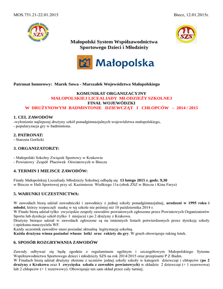 MOS.751.21-22.01.2015 Biecz, 12.01.2015r. Małopolski System Współzawodnictwa Sportowego Dzieci i Młodzieży Patronat honorowy: Marek Sowa - Marszałek Województwa Małopolskiego KOMUNIKAT ORGANIZACYJNY MAŁOPOLSKIEJ LICEALIADY MŁODZIEŻY SZKOLNEJ FINAŁ WOJEWÓDZKI W DRUŻYNOWYM BADMINTONIE DZIEWCZĄT I CHŁOPCÓW – 2014 / 2015 1. CEL ZAWODÓW -wyłonienie najlepszej drużyny szkół ponadgimnazjalnych województwa małopolskiego, - popularyzacja gry w badmintona. 2. PATRONAT: - Starosta Gorlicki 3. ORGANIZATORZY: - Małopolski Szkolny Związek Sportowy w Krakowie - Powiatowy Zespół Placówek Oświatowych w Bieczu 4. TERMIN I MIEJSCE ZAWODÓW: Finały Małopolskiej Licealiady Młodzieży Szkolnej odbędą się 13 lutego 2015 r. godz. 9,30 w Bieczu w Hali Sportowej przy ul. Kazimierza Wielkiego 11a (obok ZSZ w Bieczu i Kina Farys) 5. WARUNKI UCZESTNICTWA: W zawodach biorą udział zawodniczki i zawodnicy z jednej szkoły ponadgimnazjalnej, urodzeni w 1995 roku i młodsi, którzy rozpoczęli naukę w tej szkole nie później niż 10 października 2014 r. W Finale biorą udział tylko zwycięskie zespoły zawodów powiatowych zgłoszone przez Powiatowych Organizatorów Sportu lub dyrekcje szkół (tylko I miejsca) i po 2 drużyny z Krakowa. Drużyny biorące udział w zawodach zgłoszone są na imiennych listach potwierdzonych przez dyrekcję szkoły i opiekuna-nauczyciela WF. Każdy uczestnik zawodów musi posiadać aktualną legitymację szkolną. Każda drużyna winna posiadać własne lotki oraz rakiety do gry. W grach obowiązuje raking lotek. 6. SPOSÓB ROZGRYWANIA ZAWODÓW Zawody odbywać się będą zgodnie z regulaminem ogólnym i szczegółowym Małopolskiego Sytemu Współzawodnictwa Sportowego dzieci i młodzieży SZS na rok 2014/2015 oraz przepisami P Z Badm. W Finałach biorą udział drużyny złożone z uczniów jednej szkoły szkoły w kategorii dziewcząt i chłopców (po 2 drużyny z Krakowa oraz 1 zwycięska szkoła z zawodów powiatowych) w składzie 2 dziewcząt (+ 1 rezerwowa) lub 2 chłopców (+ 1 rezerwowy). Obowiązuje ten sam skład przez cały turniej. 7. PRZEPISY GRY Kolejność gier jest następująca: I rzut A– X B–Y II rzut gra podwójna III rzut A–Y B–X - mecz rozgrywany jest do 3 wygranych gier. - zawody rozgrywane są do dwóch wygranych setów. - system rozgrywek uzależniony od ilości zgłoszonych drużyn. - obowiązują zasady przepisów P Z Badm. oraz kwalifikacyjna lista lotek. 8. PROGRAM ZAWODÓW godz.9.30 - weryfikacja drużyn- losowanie godz.9.45 – oficjalne otwarcie i rozpoczęcie zawodów około godz. 16.00 - zakończenie zawodów. 9. NAGRODY Zespoły za trzy pierwsze miejsce otrzymują medale, puchary oraz dyplomy, 10. ZASADY FINANSOWANIA Koszty organizacji zawodów finałowych pokrywa MSZS w Krakowie Zawody są dofinansowywane ze środków Urzędu Marszałkowskiego w ramach wspierania współzawodnictwa sportowego dzieci i młodzieży szkół Województwa Małopolskiego. Koszty podróży pokrywa zespół biorący udział w zawodach (szkoła). 11. POSTANOWIENIA KOŃCOWE Zgłoszenia drużyn należy przesłać do dnia 10.02.2015 na adres e-mail: [email protected] W sprawach nieuregulowanych niniejszym regulaminem decyduje organizator zawodów. Kierownik zawodów: Jerzy Bugno 603 666 998 Projekt realizowany przy wsparciu finansowym Województwa Małopolskiego