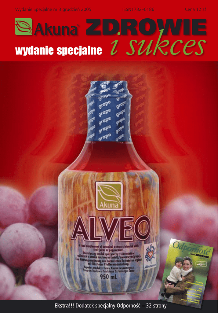 Wydanie Specjalne nr 3 grudzień 2005 ISSN1732–0186 Ekstra!!! Dodatek specjalny Odporność – 32 strony Cena 12 zł 6 O suplementach mówi lek. med. Wojciech Urbaczka – pediatra 10 Nadwrażliwy układ nerwowy oraz doświadczenia życiowe spowodowały, że u Elżbiety Skomoroko z Koszalina rozwinęła się epilepsja. 36 32 Lek. med. Andrzej Janus mówi, jak nie dopuścić do rozwoju infekcji bakteryjnej, wirusowej i grzybiczej Rozmowa z Leną Osińską z Sieradza – dietetykiem żywieniowym, konsultantką do spraw suplementacji 80 Tadeusz Dziura z Krakowa rok temu przeszedł zawał mózgu. Najbliżsi bali się, czy Tadeuszowi uda się odzyskać zdrowie. Nie sądzili, że stanie się to tak szybko. W numerze 4 Nasi specjaliści 6 Stosujemy suplementy 44 Alveo wspomaga proces 8 Leczymy organizm 46 Masaż i Alveo lek. med. Wojciech Urbaczka kompleksowo dr n. med. Jacek Jakubowski lek. med. Marek Juraszek reportaż i rozmowa z Leszkiem Borkowskim 48 Życie bez chorób 13 Epilepsja 50 Alveo pomogło w walce dr n. med. Jacek Jakubowski 14 Dzień bez bólu historia rodziny Gumowskich 16 Alveo kontra migrena reportaż z życia Magdaleny Baranik 18 Równowaga hormonalna dr Jaromir Bertlik 20 Alveo pomogło wyrównać huśtawkę hormonów reportaż z życia Jolanty Marcinowskiej z cukrzycą historia Ryszarda Liszki 52 ABC cukrzycy 54 Co nowego u Andrzeja Sakowskiego reportaż 56 Z cukrzycą można żyć aktywnie historia Doroty Łazickiej 58 Alveo wspomaga leczenie bielactwa lek. med. Urszula Urbaczka historia Beaty Palejczyk 60 Gra w zadowolenie tarczycy 62 Gdy niemożliwe staje się 22 Alveo w walce z guzem reportaż z życia Krystyny Burak 23 Ocaliłam marzenia historia Dagmary Ogiegło-Ścibik 24 Alveo oczyszcza wątrobę rozmowa z Elżbietą Lis możliwe historia rodziny Grochowskich 66 Alveo w walce z łuszczycą lek. med. Urszula Urbaczka dr Jaromir Bertlik 68 Odzyskałam radość życia historia Ignacego Abrahama 70 Choroba nowotworowa czekają 72 Alveo zregenerowało 27 Alveo dla zdrowia i formy 28 W niebie na mnie nie rozmowa z Witoldem Wójcikiem 30 Ewa, gotuj pierogi! reportaż z życia Wiktora Juszczyka 32 Naturę leczymy naturą dietetyk żywieniowy Lena Osińska 35 Gronkowiec – wszędobylska bakteria historia Małgorzaty Różyckiej 36 Gronkowiec i drożdżaki lek. med. Andrzej Janus 38 Moja prawa stopa rozmowa z Januszem Kałużą 40 Dziś żyje bez alergii historia Pawła Makowskiego 41 Alveo przywraca stan równowagi lek. med. Elżbieta Deńca-Radke 42 Hiperglicynemia nieketotyczna historia rodziny Rosłonów i sukces zdrowienia 10 Powrót do życia reportaż z życia Elżbiety Skomoroko ZDROWIE historia Aliny Kosobudzkiej lek. med. Marek Juraszek zniszczony organizm reportaż z życia Jolanty Kowalczyk 74 Guz wątroby Drodzy Państwo Zdrowie to najcenniejsza rzecz na świecie. Przekonał się o tym każdy, kto je stracił lub nadwyrężył. Kiedy człowiek jest chory, kładzie się to cieniem na całe jego życie. I nie dotyczy tylko jego osoby, skutki tego stanu rzeczy odczuwa cała rodzina. Pamiętajmy jednak, że na nasze choroby często pracujemy latami. Złe nawyki żywieniowe, brak ruchu i wszechobecny stres wpływają na nas destrukcyjnie. A powrót do zdrowia to często długa i mozolna praca, szczególnie że choroby nie występują w oderwaniu od całego organizmu. Często jedna pociąga za sobą kolejne. W naszym piśmie możecie Państwo poznać wiele wzruszających historii o ciężarze choroby oraz trudnej drodze powrotu do zdrowia. Specjaliści podpowiedzą Wam, jak unikać schorzeń oraz jak rozpoznać sygnały, które wysyła do nas przeciążony organizm. Do tego Wydania Specjalnego przygotowaliśmy też dodatek tematyczny – 32 strony o odporności. To ważna sprawa, dotyczy przecież nas wszystkich. Pamiętajmy, że nasze zdrowie jest przede wszystkim właśnie w naszych rękach. To my każdego ranka podejmujemy decyzję, jak przeżyjemy nadchodzący dzień. I musimy wiedzieć o tym, że profilaktyka to najskuteczniejsza forma zachowania zdrowia w dobrym stanie. Z okazji nadchodzących świąt Bożego Narodzenia życzę Wam zatem zdrowia i samych szczęśliwych chwil w gronie najbliższych. Tomasz Kwolek Prezes Akuna Polska historia z życia Wacława Kozikowskiego 76 Alveo w chorobach układu krążenia historia Krystyny Sas 77 Nadciśnienie reportaż z życia Zbigniewa Kryszkiewicza 78 Alveo i Onyx a proces starzenia się lek. med. Wojciech Urbaczka 80 Alveo pomogło odzyskać siły po zawale mózgu historia Tadeusza Dziury 82 Z forum Akuny 83 Co nam daje Alveo? Akuna „Zdrowie i Sukces” Wydawca: Akuna Polska Sp. z o.o. Adres: ul. 11 Listopada 11 40-387 Katowice Redaktor naczelny: Marek Dudzik Zastępca redaktora naczelnego: Katarzyna Piotrowska Sekretarz redakcji: Anna Szulc Opracowanie graficzne: Maciej Wieczorek Zespół redakcyjny: Marcin Kasprzak, Weronika Kasprzak, Aleksandra Krot, Kamila Król, Beata Maj, Katarzyna Mazur, Grażyna Michalik, Beata Nowacka, Anna Nowakowska, Marta Rybakowicz, Zofia Rymszewicz, Ernest Sobieraj, Wanda Sowińska Tłumaczenie z języka angielskiego: Marta Kowalczyk Zdjęcia: Agencja Prasowa Pasja Nakład: 30 000 egzemplarzy Nasi spec Jacek Jakubowski – studia medyczne ukończył w 1987 roku na Wydziale Lekarskim Akademii Medycznej w Łodzi. Posiada specjalizację II stopnia z neurochirurgii oraz stopień doktora nauk medycznych. Pracuje w Klinice Neurochirurgii Uniwersytetu Medycznego w Łodzi, od 1988 roku jest asystentem. W leczeniu chorych stosuje akupunkturę, a od ponad roku także Alveo. Jego hobby to fotografia, nurkowanie i przyroda. Trochę pisze i rysuje, w wolnych chwilach gra na gitarze. Jest ojcem dwóch córek: Joanny (13 lat) i Małgorzaty (15 lat). Marek Juraszek – lekarz psychiatra i chorób wewnętrznych. Kieruje Poradnią Zdrowia Psychicznego MSWiA w Szczecinie. Pracuje również jako wykładowca w tamtejszej Wyższej Szkole Integracji Europejskiej oraz w Zespole Szkół Artystycznych TopAr
