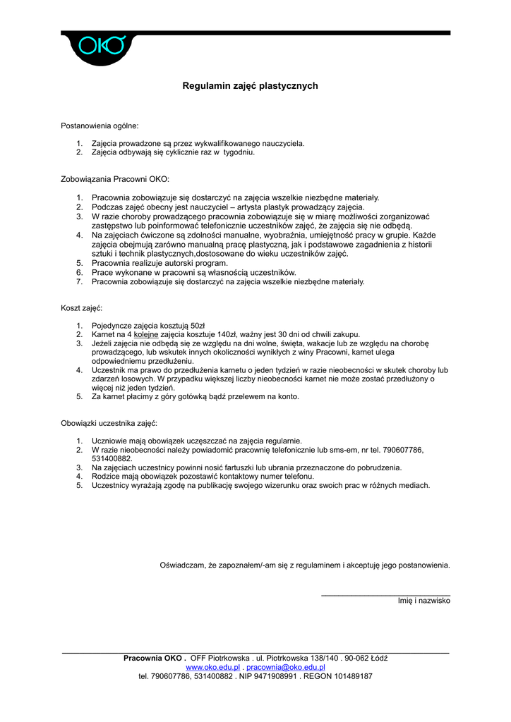 Regulamin zajęć plastycznych Postanowienia ogólne: 1. 2. Zajęcia prowadzone są przez wykwalifikowanego nauczyciela. Zajęcia odbywają się cyklicznie raz w tygodniu. Zobowiązania Pracowni OKO: 1. 2. 3. 5. 6. Pracownia zobowiązuje się dostarczyć na zajęcia wszelkie niezbędne materiały. Podczas zajęć obecny jest nauczyciel – artysta plastyk prowadzący zajęcia. W razie choroby prowadzącego pracownia zobowiązuje się w miarę możliwości zorganizować zastępstwo lub poinformować telefonicznie uczestników zajęć, że zajęcia się nie odbędą. Na zajęciach ćwiczone są zdolności manualne, wyobraźnia, umiejętność pracy w grupie. Każde zajęcia obejmują zarówno manualną pracę plastyczną, jak i podstawowe zagadnienia z historii sztuki i technik plastycznych,dostosowane do wieku uczestników zajęć. Pracownia realizuje autorski program. Prace wykonane w pracowni są własnością uczestników. 7. Pracownia zobowiązuje się dostarczyć na zajęcia wszelkie niezbędne materiały. 4. Koszt zajęć: 1. 2. 3. 4. 5. Pojedyncze zajęcia kosztują 50zł Karnet na 4 kolejne zajęcia kosztuje 140zł, ważny jest 30 dni od chwili zakupu. Jeżeli zajęcia nie odbędą się ze względu na dni wolne, święta, wakacje lub ze względu na chorobę prowadzącego, lub wskutek innych okoliczności wynikłych z winy Pracowni, karnet ulega odpowiedniemu przedłużeniu. Uczestnik ma prawo do przedłużenia karnetu o jeden tydzień w razie nieobecności w skutek choroby lub zdarzeń losowych. W przypadku większej liczby nieobecności karnet nie może zostać przedłużony o więcej niż jeden tydzień. Za karnet płacimy z góry gotówką bądź przelewem na konto. Obowiązki uczestnika zajęć: 1. 2. 3. 4. 5. Uczniowie mają obowiązek uczęszczać na zajęcia regularnie. W razie nieobecności należy powiadomić pracownię telefonicznie lub sms-em, nr tel. 790607786, 531400882. Na zajęciach uczestnicy powinni nosić fartuszki lub ubrania przeznaczone do pobrudzenia. Rodzice mają obowiązek pozostawić kontaktowy numer telefonu. Uczestnicy wyrażają zgodę na publikację swojego wizerunku oraz swoich prac w różnych mediach. Oświadczam, że zapoznałem/-am się z regulaminem i akceptuję jego postanowienia. ______________________________ Imię i nazwisko __________________________________________________________________________________________ Pracownia OKO . OFF Piotrkowska . ul. Piotrkowska 138/140 . 90-062 Łódź www.oko.edu.pl . [email protected] tel. 790607786, 531400882 . NIP 9471908991 . REGON 101489187
