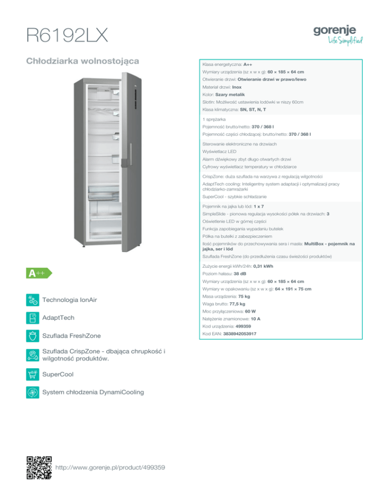 R6192LX Chłodziarka wolnostojąca Klasa energetyczna: A++ Wymiary urządzenia (sz x w x g): 60 × 185 × 64 cm Otwieranie drzwi: Otwieranie drzwi w prawo/lewo Materiał drzwi: Inox Kolor: Szary metalik SlotIn: Możliwość ustawienia lodówki w niszy 60cm Klasa klimatyczna: SN, ST, N, T 1 sprężarka Pojemność brutto/netto: 370 / 368 l Pojemność części chłodzącej: brutto/netto: 370 / 368 l Sterowanie elektroniczne na drzwiach Wyświetlacz LED Alarm dźwiękowy zbyt długo otwartych drzwi Cyfrowy wyświetlacz temperatury w chłodziarce CrispZone: duża szuflada na warzywa z regulacją wilgotności AdaptTech cooling: Inteligentny system adaptacji i optymalizacji pracy chłodziarko-zamrażarki SuperCool - szybkie schładzanie Pojemnik na jajka lub lód: 1 x 7 SimpleSlide - pionowa regulacja wysokości półek na drzwiach: 3 Oświetlenie LED w górnej części Funkcja zapobiegania wypadaniu butelek Półka na butelki z zabezpieczeniem Ilość pojemników do przechowywania sera i masła: MultiBox - pojemnik na jajka, ser i lód Szuflada FreshZone (do przedłużenia czasu świeżości produktów) Zużycie energii kWh/24h: 0,31 kWh Poziom hałasu: 38 dB Wymiary urządzenia (sz x w x g): 60 × 185 × 64 cm Wymiary w opakowaniu (sz x w x g): 64 × 191 × 75 cm Technologia IonAir Masa urządzenia: 75 kg Waga brutto: 77,5 kg Moc przyłączeniowa: 60 W AdaptTech Natężenie znamionowe: 10 A Kod urządzenia: 499359 Szuflada FreshZone Szuflada CrispZone - dbająca chrupkość i wilgotność produktów. SuperCool System chłodzenia DynamiCooling http://www.gorenje.pl/product/499359 Kod EAN: 3838942053917