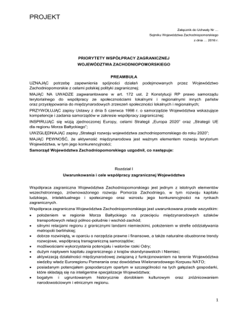 PROJEKT Załącznik do Uchwały Nr … Sejmiku Województwa Zachodniopomorskiego z dnia … 2016 r. PRIORYTETY WSPÓŁPRACY ZAGRANICZNEJ WOJEWÓDZTWA ZACHODNIOPOMORSKIEGO PREAMBUŁA UZNAJĄC potrzebę zapewnienia spójności działań podejmowanych Zachodniopomorskie z celami polskiej polityki zagranicznej; przez Województwo MAJĄC NA UWADZE zagwarantowane w art. 172 ust. 2 Konstytucji RP prawo samorządu terytorialnego do współpracy ze społecznościami lokalnymi i regionalnymi innych państw oraz przystępowania do międzynarodowych zrzeszeń społeczności lokalnych i regionalnych; PRZYWOŁUJĄC zapisy Ustawy z dnia 5 czerwca 1998 r. o samorządzie Województwa wskazujące kompetencje i zadania samorządów w zakresie współpracy zagranicznej; INSPIRUJĄC się wizją zjednoczonej Europy, celami Strategii „Europa 2020” oraz „Strategii UE dla regionu Morza Bałtyckiego”; UWZGLĘDNIAJĄC zapisy „Strategii rozwoju województwa zachodniopomorskiego do roku 2020”; MAJĄC PEWNOŚĆ, że aktywność międzynarodowa jest ważnym elementem rozwoju terytorium Województwa, w tym jego konkurencyjności; Samorząd Województwa Zachodniopomorskiego uzgodnił, co następuje: Rozdział I Uwarunkowania i cele współpracy zagranicznej Województwa Współpraca zagraniczna Województwa Zachodniopomorskiego jest jednym z istotnych elementów wszechstronnego, zrównoważonego rozwoju Pomorza Zachodniego, w tym rozwoju kapitału ludzkiego, intelektualnego i społecznego oraz wzrostu jego konkurencyjności na rynkach zagranicznych. Współpraca zagraniczna Województwa Zachodniopomorskiego jest uwarunkowana przede wszystkim: położeniem w regionie Morza Bałtyckiego na przecięciu międzynarodowych szlaków transportowych relacji północ-południe i wschód-zachód; silnymi relacjami regionu z granicznymi landami niemieckimi, położeniem w strefie oddziaływania metropolii berlińskiej; dobrze rozwiniętą, w oparciu o narzędzia prawne i finansowe, a także naturalne obustronne trendy rozwojowe, współpracą transgraniczną samorządów; możliwościami wykorzystania potencjału i walorów rzeki Odry; dużym napływem kapitału zagranicznego z krajów skandynawskich i Niemiec; aktywizacją działalności międzynarodowej związaną z funkcjonowaniem na terenie Województwa siedziby władz Euroregionu Pomerania oraz dowództwa Wielonarodowego Korpusu NATO; posiadanym potencjałem gospodarczym opartym w szczególności na tych gałęziach gospodarki, które składają się na inteligentne specjalizacje Województwa; bogatym i ugruntowanym historycznie dorobkiem kulturowym oraz zróżnicowaniem narodowościowym i etnicznym regionu. 1 PROJEKT Jako bazę dla współpracy zagranicznej uznaje się budowanie relacji partnerskich na rzecz pozyskiwania wiedzy i doświadczeń w zakresie rozwoju regionalnego. Priorytetem jest również wzmacnianie pozycji Województwa Zachodniopomorskiego na arenie międzynarodowej. Do najważniejszych celów współpracy zagranicznej Województwa należy: 1) Wzmocnienie pozycji Województwa w regionie Morza Bałtyckiego Koncentracja działań zmierzających do wzmocnienia pozycji w regionie Morza Bałtyckiego oraz w Euroregionie Pomerania jest naturalną konsekwencją położenia geograficznego Województwa Zachodniopomorskiego. Budowa pozycji Województwa odbywać się będzie w oparciu o rozwój gospodarki morskiej i sieci transportowej w osi północ-południe oraz międzynarodową współpracę samorządów terytorialnych, a także dzięki wzrostowi internacjonalizacji przedsiębiorstw i sieci ich powiązań, rozwojowi oraz wzmacnianiu innowacyjności w oparciu o doświadczenia międzynarodowe, ze szczególnym uwzględnieniem skandynawskich. 2) Rozwój powiązań komunikacyjnych i infrastrukturalnych na obszarze przygranicznym Granice administracyjne państwa stwarzają szereg problemów związanych z optymalizacją oferty komunikacyjnej Województwa Zachodniopomorskiego i Meklemburgii-Pomorza Przedniego. Transgraniczna komunikacja, wykorzystanie infrastruktury sieciowej, a także infrastruktury aktywnej turystyki nabiera znaczenia wobec nasilających się procesów migracyjnych polskich rodzin Pomorza Zachodniego do przygranicznych miejscowości po stronie niemieckiej. 3) Rozwój polsko-niemieckiej współpracy transgranicznej Republika Federalna Niemiec jest głównym krajem wymiany handlowej Polski i Województwa Zachodniopomorskiego. Procesy integracyjne Unii Europejskiej, graniczne położenie i aktualne zjawiska demograficzne wymagają wspólnego z Niemcami rozwiązywania problemów. Współpraca polsko-niemiecka (szczególnie z metropolią Berlina) powinna być jednym z akceleratorów procesów innowacyjnych i rozwoju internacjonalizacji zachodniopomorskich przedsiębiorstw. Za katalizator realizacji tego priorytetu można przyjąć również niwelowanie barier międzykulturowych i upowszechnianie edukacji języka niemieckiego. Ważnym instrumentem finansowym Unii Europejskiej wspierającym zrównoważony rozwój i integrację polsko-niemieckiego obszaru są programy INTERREG. 4) Rozwój europejskiej współpracy terytorialnej w oparciu o Środkowoeuropejski Korytarz Transportowy Europejskie Ugrupowanie Współpracy Terytorialnej Dążenie do trwałości pasma współpracy regionalnej jako podstawy dla ożywienia gospodarczego regionów, wzrostu zatrudnienia, poprawy jakości środowiska naturalnego oraz warunków życia ludności, zapewnienie kompatybilności infrastruktury transportowej dla zniwelowania barier rozwoju nowych technologii transportu między poszczególnymi regionami oraz zwiększenie dynamiki wzrostu gospodarczego państw nadbałtyckich poprzez znalezienie nowych rynków zbytu i wykorzystanie najkrótszego połączenia promowego przez Bałtyk, łączącego Europę Północną z Południem Europy, leżą u podstaw utworzenia Środkowoeuropejskiego Korytarza Transportowego Europejskiego Ugrupowania Współpracy Terytorialnej. Długoletni