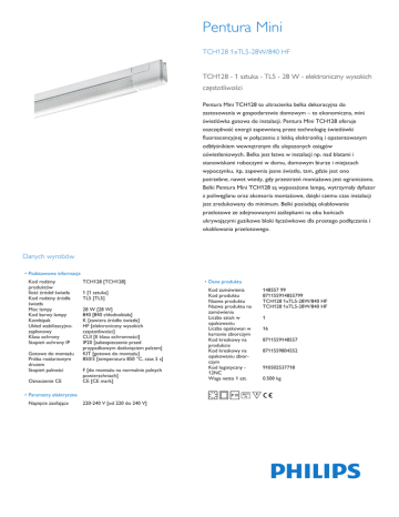Pentura Mini TCH128 1xTL5-28W/840 HF TCH128 - 1 sztuka - TL5 - 28 W - elektroniczny wysokich częstotliwości Pentura Mini TCH128 to ultracienka belka dekoracyjna do zastosowania w gospodarstwie domowym – to ekonomiczna, mini świetlówka gotowa do instalacji. Pentura Mini TCH128 oferuje oszczędność energii zapewnianą przez technologię świetlówki fluorescencyjnej w połączeniu z lekką elektroniką i opatentowanym odbłyśnikiem wewnętrznym dla ulepszonych osiągów oświetleniowych. Belka jest łatwa w instalacji np. nad blatami i stanowiskami roboczymi w domu, domowym biurze i miejscach wypoczynku, itp, zapewnia jasne światło, tam, gdzie jest ono potrzebne, nawet wtedy, gdy przestrzeń montażowa jest ograniczona. Belki Pentura Mini TCH128 są wyposażone lampę, wytrzymały dyfuzor z poliwęglanu oraz akcesoria montażowe, dzięki czemu czas instalacji jest zredukowany do minimum. Belki posiadają okablowanie przelotowe ze zdejmowanymi zaślepkami na obu końcach ukrywającymi guzikowe bloki łączówkowe dla prostego podłączania i okablowania przelotowego. Danych wyrobów • Podstawowe informacje Kod rodziny produktów Ilość źródeł światła Kod rodziny źródła światła Moc lampy Kod barwy lampy Kombipak Układ stabilizacyjnozapłonowy Klasa ochrony Stopień ochrony IP Gotowe do montażu Próba rozżarzonym drutem Stopień palności Oznaczenie CE TCH128 [TCH128] 1 [1 sztuka] TL5 [TL5] 28 W [28 W] 840 [840 chłodnobiała] K [zawiera źródło światła] HF [elektroniczny wysokich częstotliwości] CLII [II klasa ochronności] IP20 [zabezpieczenie przed przypadkowym dotknięciem palcem] KIT [gotowe do montażu] 850/5 [temperatura 850 °C, czas 5 s] F [do montażu na normalnie palnych powierzchniach] CE [CE mark] • Parametry elektryczne Napięcie zasilające 220-240 V [od 220 do 240 V] • Dane produktu Kod zamówienia Kod produktu Nazwa produktu Nazwa produktu na zamówieniu Liczba sztuk w opakowaniu Liczba opakowan w kartonie zbiorczym Kod kreskowy na produkcie Kod kreskowy na opakowaniu zbiorczym Kod logistyczny 12NC Waga netto 1 szt. 148557 99 871155914855799 TCH128 1xTL5-28W/840 HF TCH128 1xTL5-28W/840 HF 1 16 8711559148557 8711559804552 910502537718 0.500 kg Pentura Mini Rysunki techniczne TCH128 1xTL5-28W/840 HF Dane fotometryczne TCH128 1xTL5-28W HF © 2014 Koninklijke Philips N.V. (Royal Philips) Wszelkie prawa zastrzeżone Dane mogą ulec zmianie bez uprzedniego powiadomienia. Znak towarowy jest własnością Koninklijke Philips N.V. (Royal Philips) lub odpowiednich podmiotów . www.philips.pl/lighting 2014, Listopad 19 Dane wkrótce ulegną zmianie