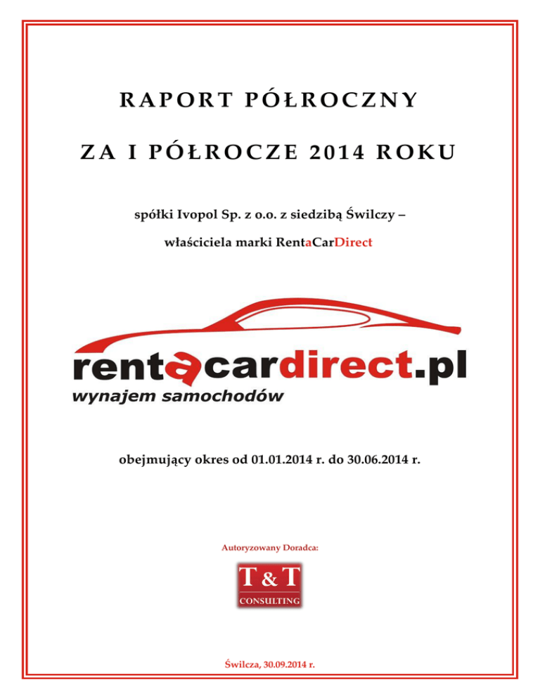 RAPORT PÓŁROCZNY ZA I PÓŁROCZE 2014 ROKU spółki Ivopol Sp. z o.o. z siedzibą Świlczy – właściciela marki RentaCarDirect obejmujący okres od 01.01.2014 r. do 30.06.2014 r. Autoryzowany Doradca: Świlcza, 30.09.2014 r. GRUPA KAPITAŁOWA Spis treści 1. Podstawowe dane o Emitencie ........................................................................................................................ 3 2. Informacje o działalności Emitenta ................................................................................................................. 3 3. Wybrane dane finansowe ................................................................................................................................. 5 3.1. 4. Zasady przyjęte przy przeliczaniu PLN na EUR .......................................................................... 6 Półroczne skrócone sprawozdanie finansowe ............................................................................................. 7 4.1. Wybrane pozycje bilansu ................................................................................................................... 7 4.1.1. Aktywa.................................................................................................................................. 7 4.1.2. Pasywa .................................................................................................................................. 7 4.2. Wybrane pozycje rachunku zysków i strat .................................................................................... 8 4.3. Wybrane pozycje zestawienia zmian w kapitale własnym ........................................................ 9 4.4. Wybrane pozycje rachunku przepływów pieniężnych............................................................... 9 5. Grupa kapitałowa Emitenta ........................................................................................................................... 10 6. Półroczne sprawozdanie z działalności Emitenta ..................................................................................... 10 6.1. Omówienie wyników finansowych ............................................................................................... 10 6.2. Istotne wydarzenia, które miały miejsce w I półroczu 2014 r. ................................................. 11 6.3. Zasady sporządzenia półrocznego skróconego sprawozdania finansowego ...................... 11 6.3.1. 6.4. Omówienie przyjętych zasad (polityki) rachunkowości ......................................... 12 Podstawowe zagrożenia i ryzyka ................................................................................................... 13 6.4.1. Czynniki ryzyka związane bezpośrednio z Emitentem i prowadzoną przez niego działalnością................................................................................................ 13 6.4.2. Czynniki ryzyka związane z otoczeniem Emitenta.................................................. 16 6.4.3. Czynniki ryzyka związane z Obligacjami .................................................................. 17 6.4.4. Czynniki ryzyka związane z notowaniem Obligacji w alternatywnym systemie obrotu na Catalyst ........................................................................................... 18 7. Oświadczenie Zarządu .................................................................................................................................... 19 RAPORT PÓŁROCZNY ZA I PÓŁROCZE 2014 ROKU Strona 2 z 19 GRUPA KAPITAŁOWA 1. Podstawowe dane o Emitencie Nazwa (firma) Ivopol spółka z ograniczoną odpowiedzialnością Siedziba Polska, Świlcza Adres Świlcza 147 H, 36-072 Świlcza Telefon +48 17 875 00 10 Fax +48 17 875 00 10 E-mail [email protected] Strona internetowa www.rentacardirect.pl Klasyfikacja PKD 77.11.Z – Wynajem i dzierżawa samochodów osobowych i furgonetek Forma prawna Spółka z ograniczoną odpowiedzialnością NIP 8133675586 REGON 180921045 Kapitał zakładowy 409.900,00 PLN – w pełni opłacony Numer KRS 0000442936 Zarząd Rada Nadzorcza Maciej Motelski – Prezes Zarządu Andrzej Wojdyła – Wiceprezes Zarządu Mirosław Misiołek – Przewodniczący Rady Nadzorczej Rafał Godoj – Wiceprzewodniczący Rady Nadzorczej Eliza Brzegowy-Misiołek – Członek Rady Nadzorczej Alicja Kurzac – Członek Rady Nadzorczej Robert Ditrych – Członek Rady Nadzorczej 2. Informacje o działalności Emitenta Emitent prowadzi działalność polegającą na świadczeniu usług wynajmu samochodów pod marką RENT A CAR DIRECT, specjalizując się w wynajmie samochodów zastępczych dla klientów poszkodowanych w wypadkach i kolizjach. Spółka prowadzi działalność na podstawie przepisów art. 34 ust. 1 oraz art. 36 ust. 1 Ustawy o ubezpieczeniach obowiązkowych oraz art. 361 i art. 805 § 2 Kodeksu cywilnego, które nakładają na Towarzystwa Ubezpieczeniowe obowiązek zagwarantowania poszkodowanemu w wypadkach i kolizjach samochodu zastępczego, w ramach polisy obowiązkowego ubezpieczenia odpowiedzialności cywilnej (OC) sprawcy. W zakresie sprzedaży usług wynajmu samochodów zastępczych, Emitent ściśle współpracuje z warsztatami blacharsko-lakierniczymi, dla których usługa Spółki jest uzupełnieniem ich własnej oferty w zakresie naprawy samochodu poszkodowanego. Sieć warsztatów partnerskich obejmuje obecnie 252 podmioty, z których większość to autoryzowane stacje obsługi. Spółka dysponuje 204 samochodami, w podziale na 11 klas. Flota składa się z pojazdów kilku marek, nowych i będących na gwarancji, w pełni ubezpieczonych i serwisowanych wyłącznie w stacjach ASO. Polityka Emitenta w zakresie zarządzania flotą przewiduje cykliczną wymianę samochodów na nowe po upływie 3 lat lub po osiągnięciu przebiegu 80.000 km. Źródłem finansowania zakupu RAPORT PÓŁROCZNY ZA I PÓŁROCZE 2014 ROKU Strona 3 z 19 GRUPA KAPITAŁOWA samochodów są oraz b